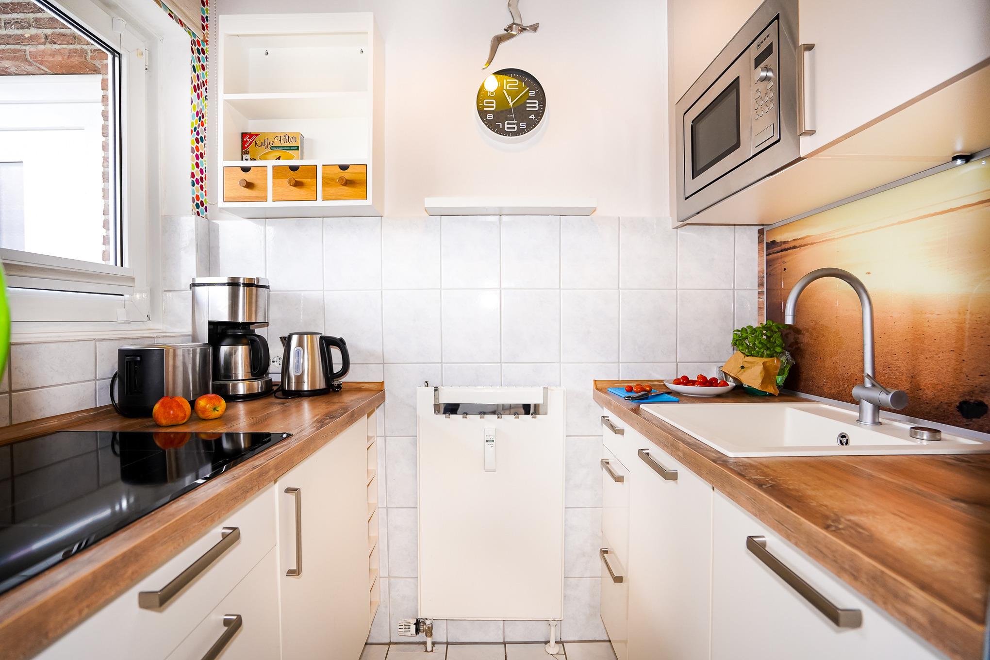 Die kleine voll ausgestattete Küche ist gut durchdacht und offeriert Ihnen neben Spüle und Cerankochfeld auch eine Kühl-/Gefrierkombi, einen Geschirrspüler und eine Mikrowelle mit Grillfunktion.