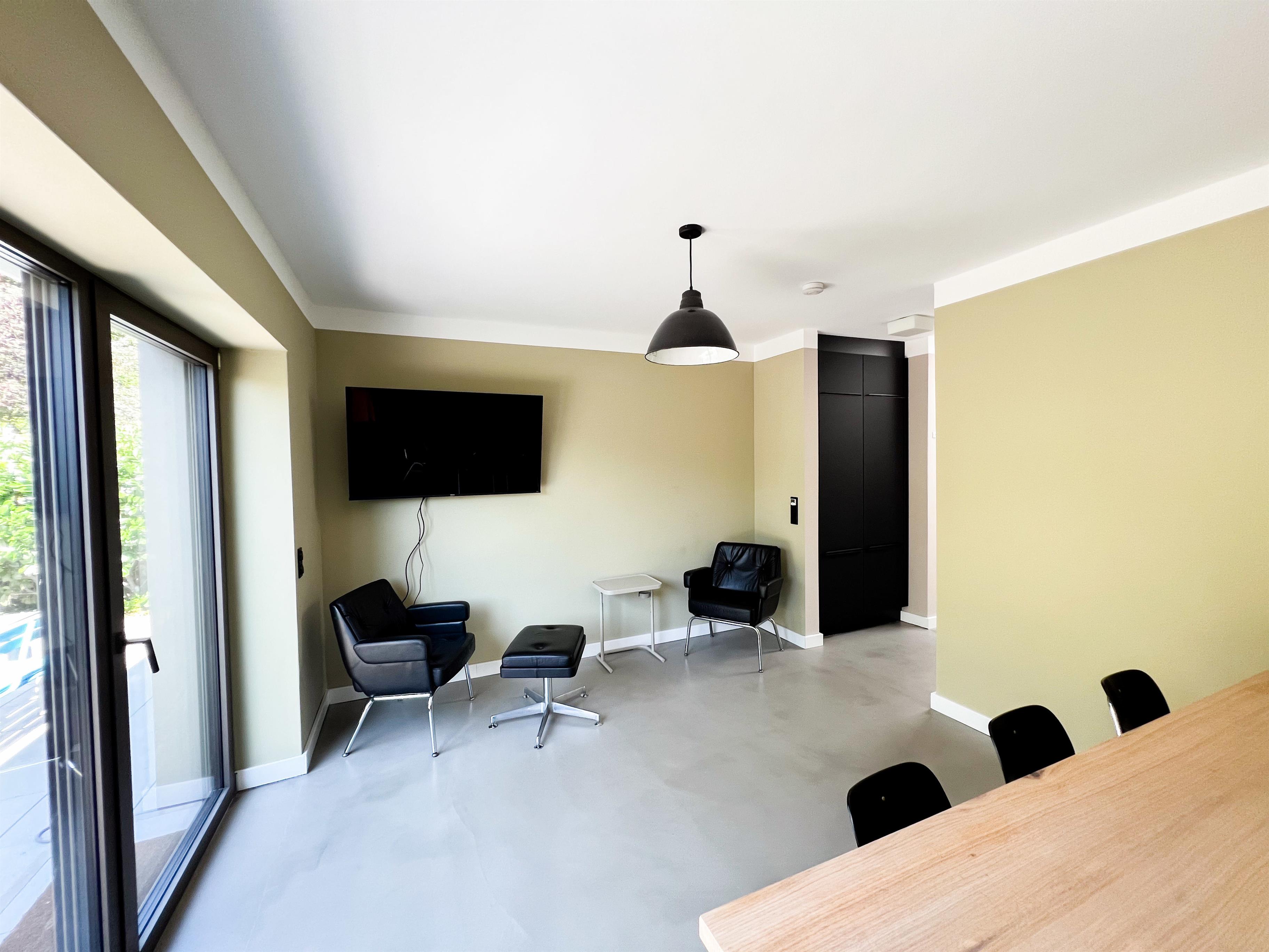 zwei Sessel und ein großer Fernseher. Hier haben Sie Zugang zur sonnigen, möblierten Terrasse (aktuell noch Gemeinschaftsterrasse).