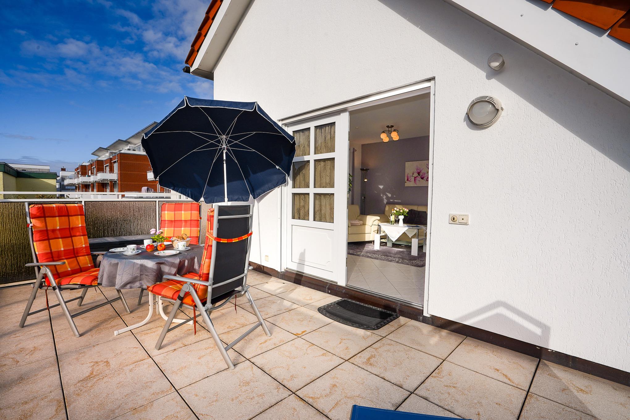 Ihre gemütliche Ferienwohnung erreichen Sie über einen separaten außenliegenden Treppenaufgang. Dieser führt Sie auch zur großzügigen Dachterrasse. Abseits der Straße gelegen finden Sie hier Ruhe und Entspannung pur. In wenigen Gehminuten erreichen Sie sowohl den feinsandigen Strand als auch die pulsierende zentrale Einkaufsstrasse.