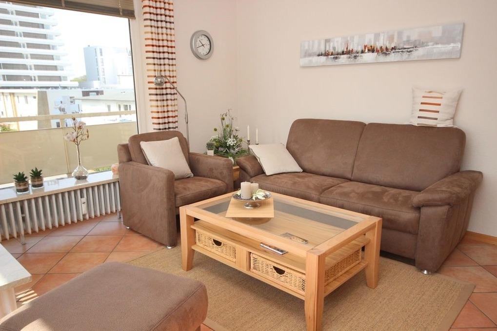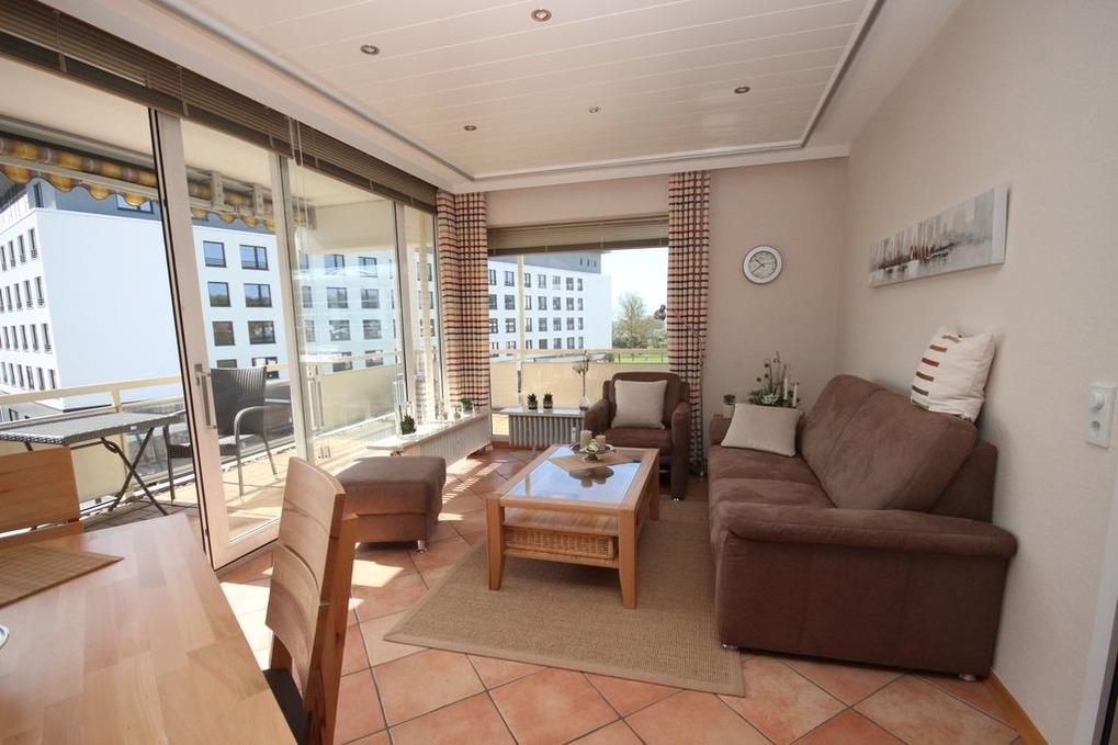 Das geräumige Wohnzimmer ist möbliert mit Couchgarnitur, Esstisch, TV, Radio und hat Zugang zur möblierten Balkon mit Markise und Ostseeblick. WLAN