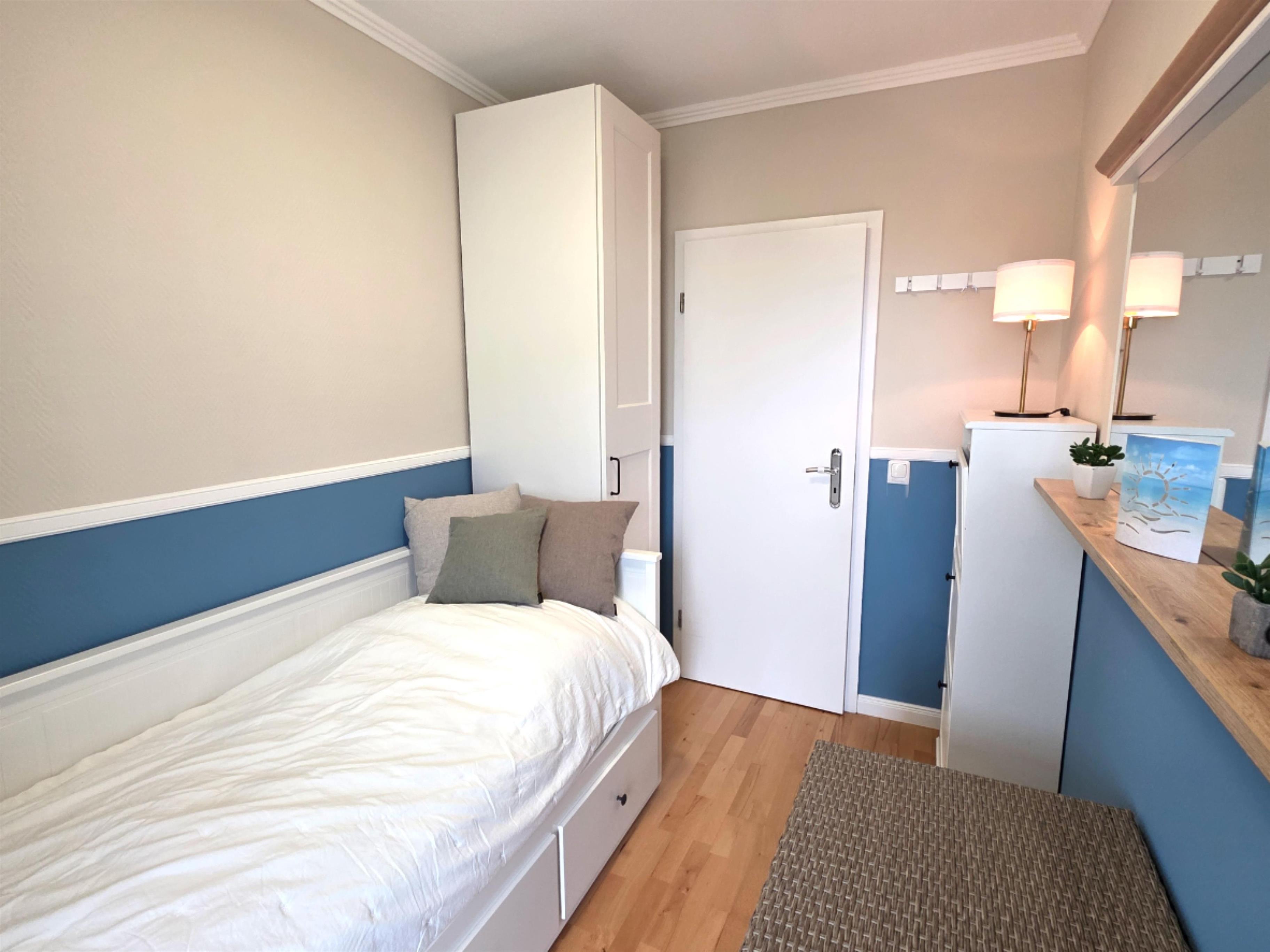 Das Schlafzimmer ist mit einem Ehebett & Kleiderschrank ausgestattet.