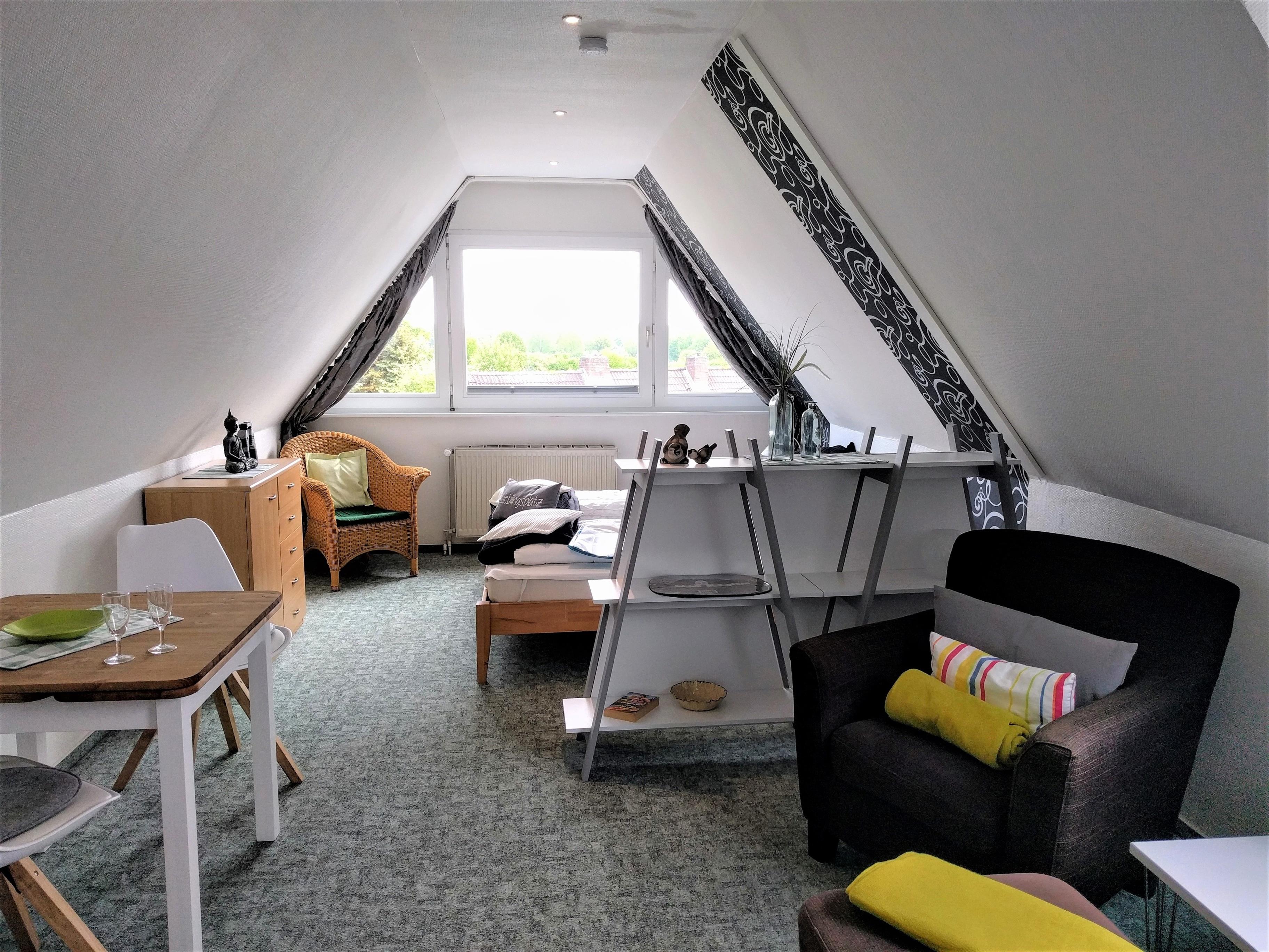 Unser grünes 3-Sterne Dachstudio für 1 - 2 Personen mit Blick über den Grömitzer Golfplatz. Das Apartment besteht aus einem großen Wohn-Schlafzimmer mit Sitzecke, Essplatz und Doppelbett, einem extra Schlafzimmer mit Blick über Grömitz sowie Küche und neuem Duschbad.