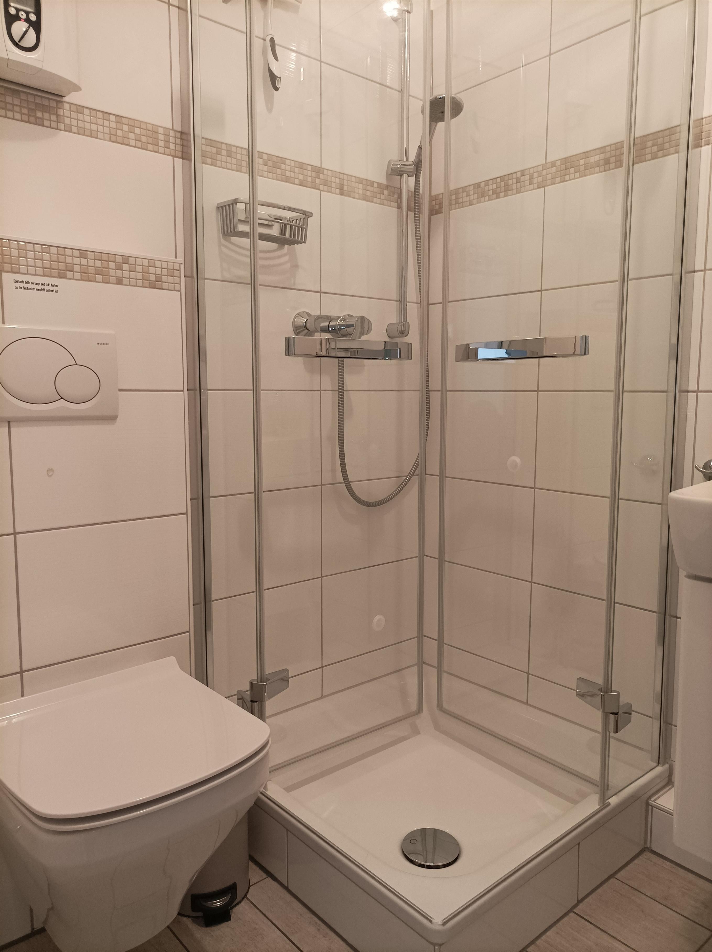 Das Badezimmer verfügt über eine Handtuchheizung. Elektrische Außenjalousien sind vorhanden und sorgen für eine angenehme Verdunkelung der Räume.