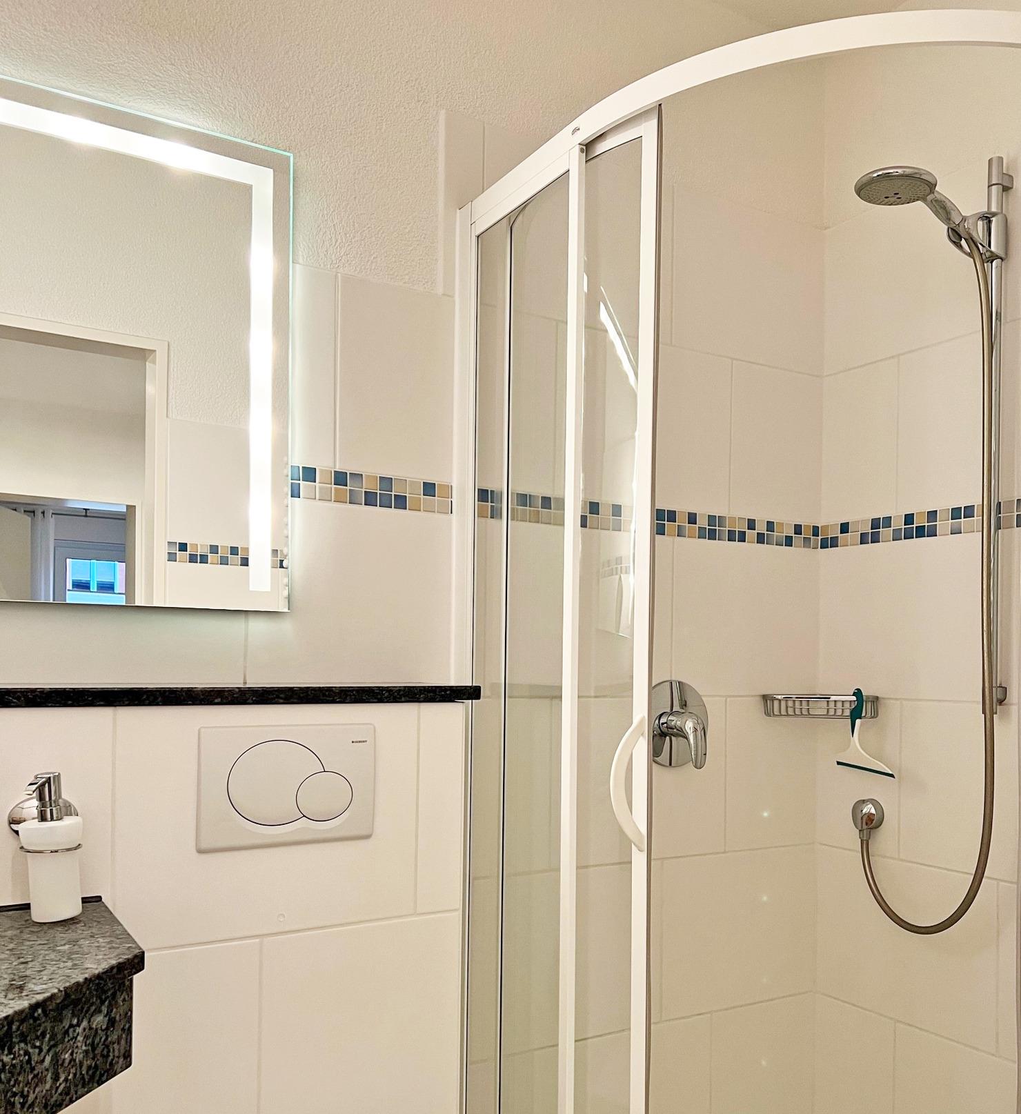 Das größere Schlafzimmer ist mit einem hochwertigen Boxspringbett (160x200cm), einem Kleiderschrank und einem TV eingerichtet. Im kleineren Schlafzimmer findet man ein Bett in der Größe von 90x200cm und einen kleinen Kleiderschrank mit TV. Das Badezimmer ist mit einer Dusche, einem Waschbecken sowie einem WC ausgestattet. Eine Handtuchheizung sorgt für angenehme Wärme. Alle Fenster sind mit Außenjalousien versehen.