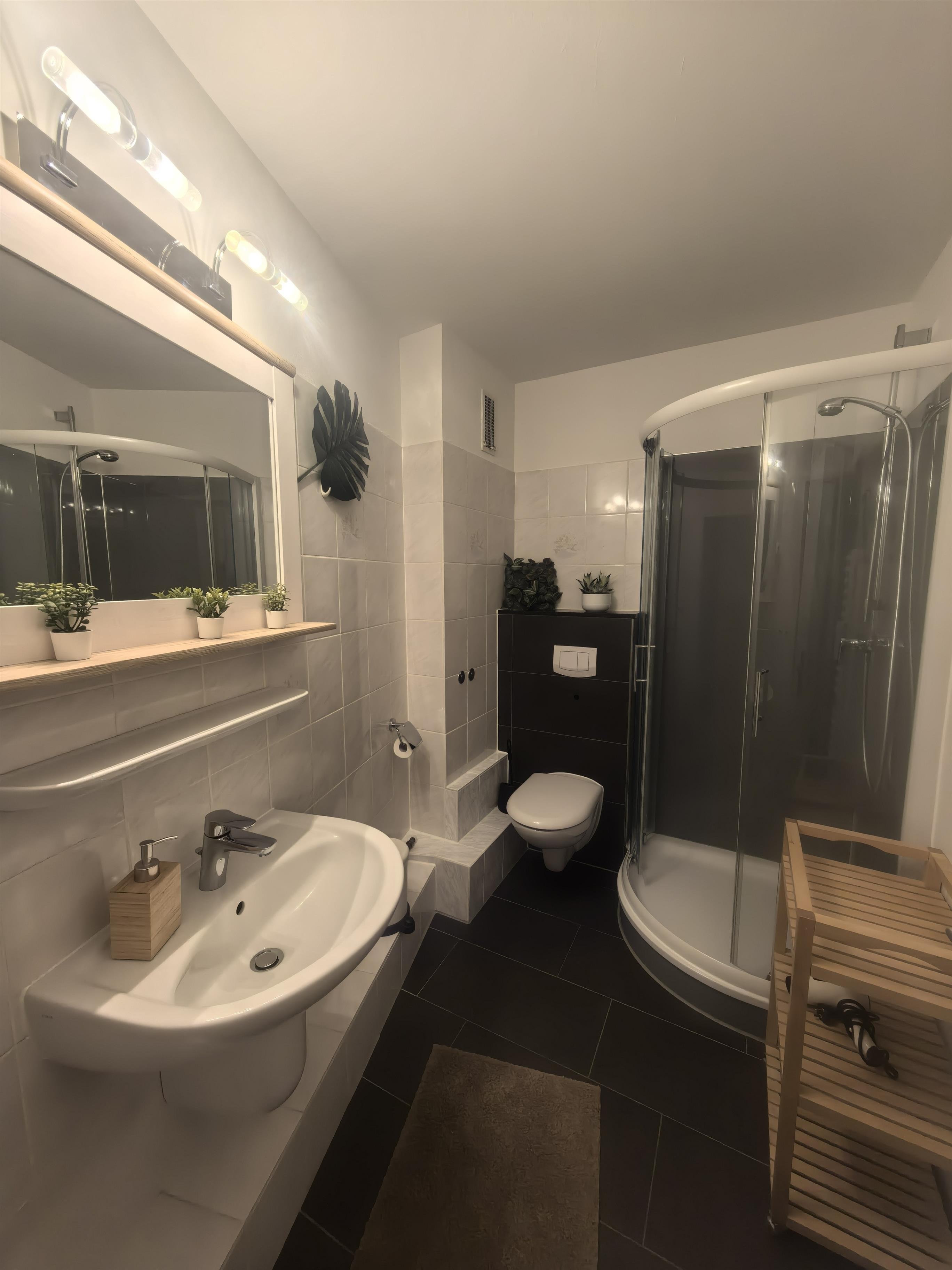 Im Badezimmer befindet sich eine Dusche und unter anderem ein Haartrockner.