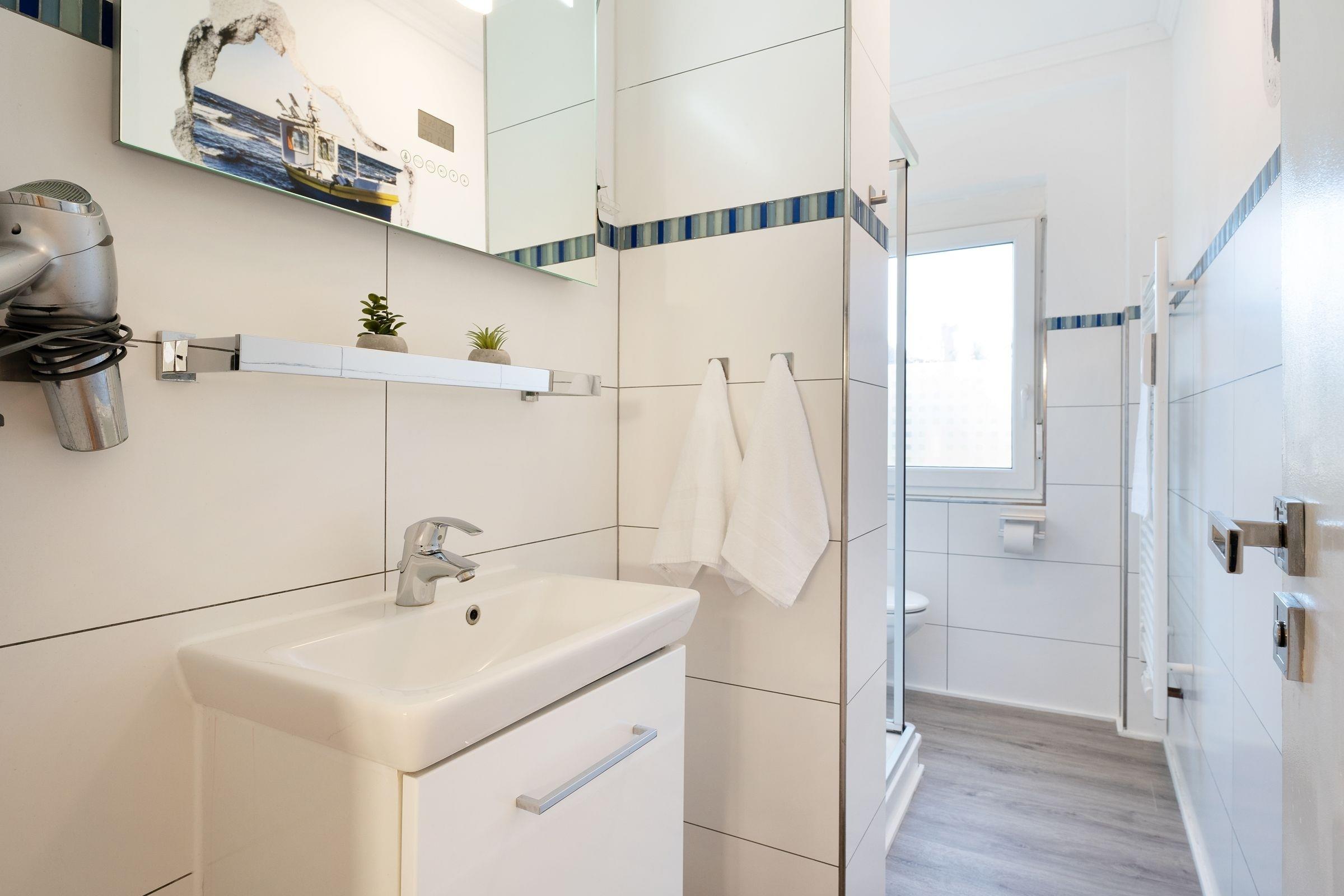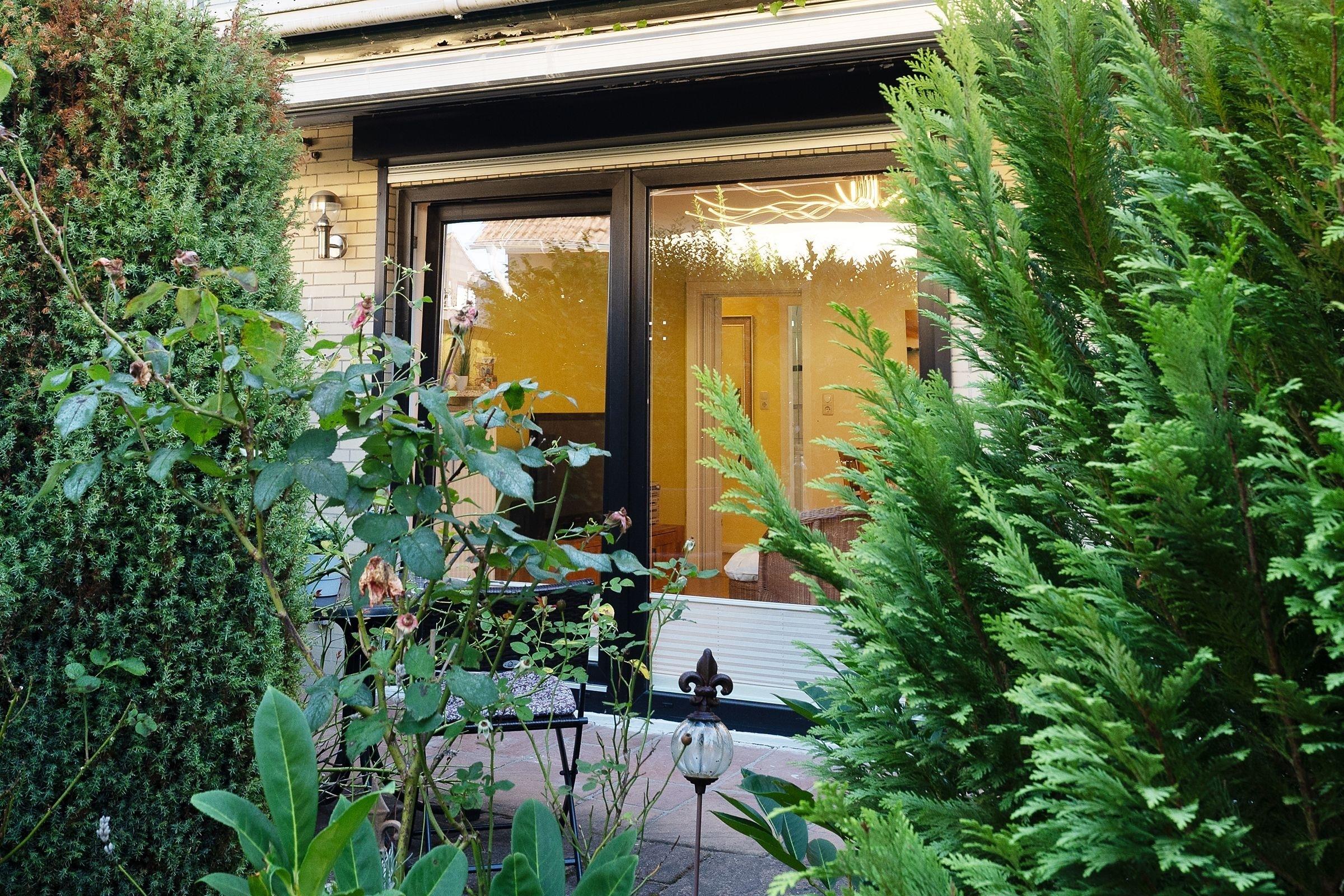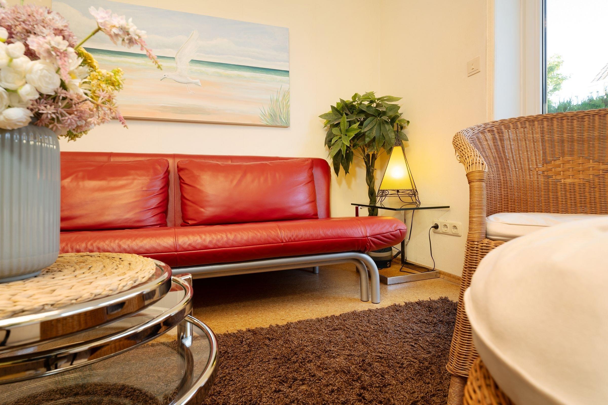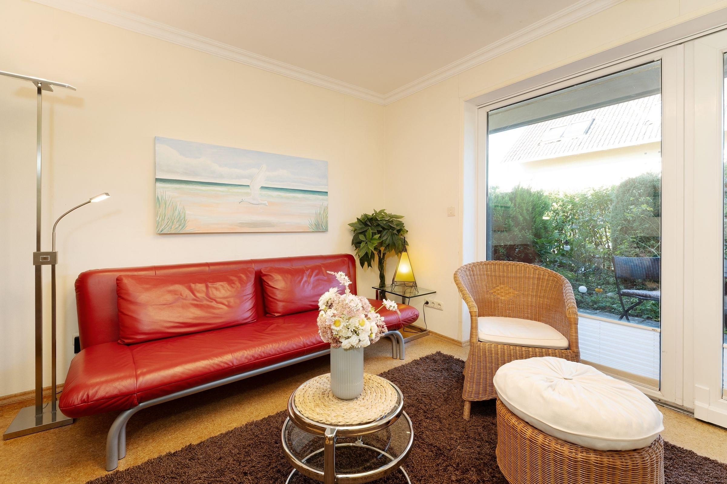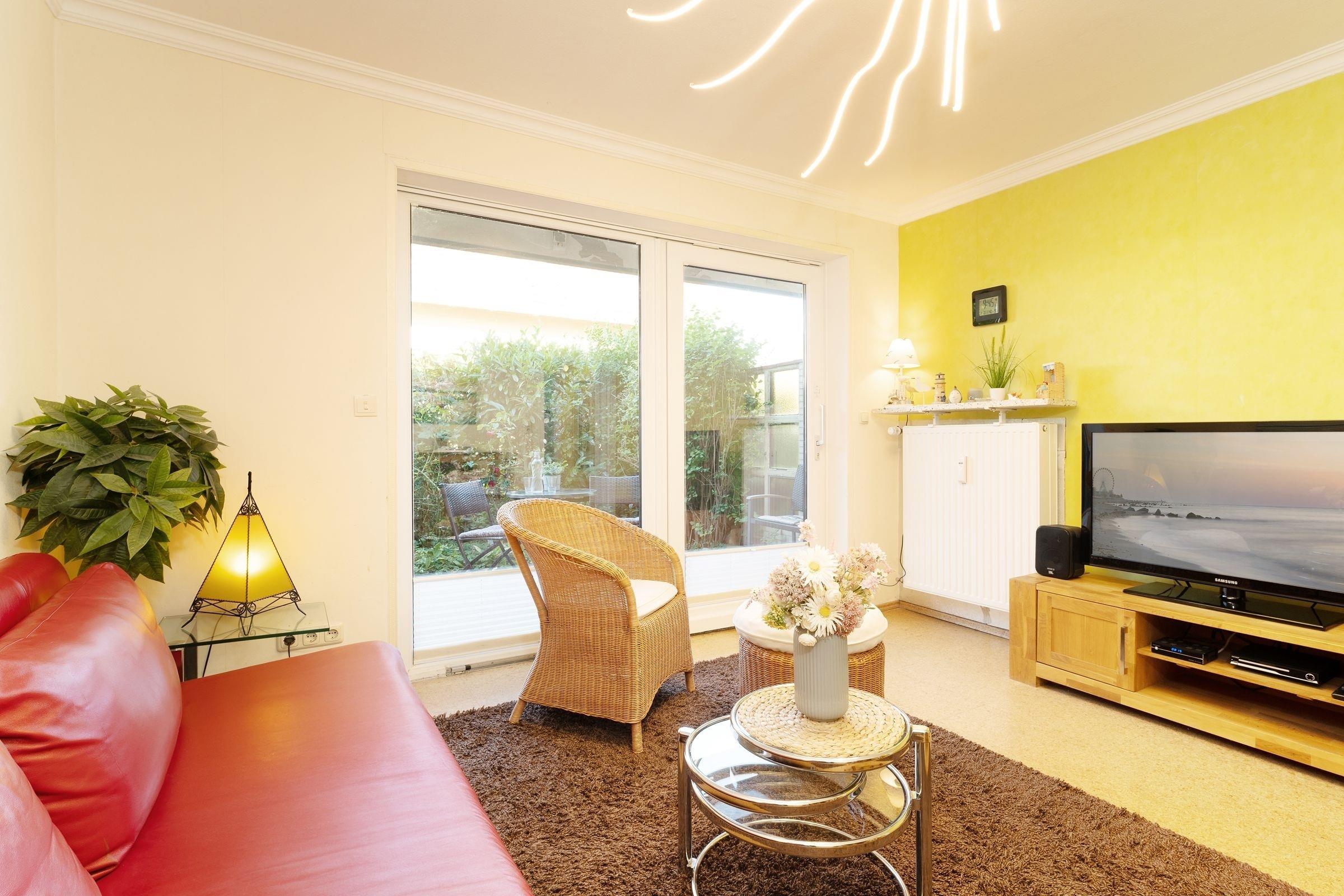 Durch einen kleinen Flur gelangen Sie in den geschmackvollen Wohn-/Essbereich. Ein großer Flachbildfernseher, ein DVD-/ und CD-Player sowie ein kostenfreier WLAN-Anschluss sorgen für Abwechslung und Unterhaltung. Das Sofa kann bei Bedarf in eine gemütliche Schlafstätte (140x200 cm) verwandelt werden. Am Esstisch in Tresenhöhe sind gesellige Abende beim Spielen und Essen möglich. Vom Wohn-/Essbereich betreten Sie direkt die große möblierte Terrasse und Ihren kleinen eingezäunten Garten, hier lädt eine Sitzgruppe und ein Grill zum Verweilen ein und gegen zu starke Sonneneinstrahlung schützt Sie eine Markise. Im Schlafzimmer erholen Sie sich nachts von ereignisreichen Urlaubstagen im bequemen Doppelbett (2x 80x190 cm). Ihre Urlaubsgarderobe können Sie problemlos im großen Kleiderschrank verstauen. Das schöne, ganz frisch renovierte Duschbad rundet die Ausstattung dieses Feriendomizils ab und wird Sie begeistern.