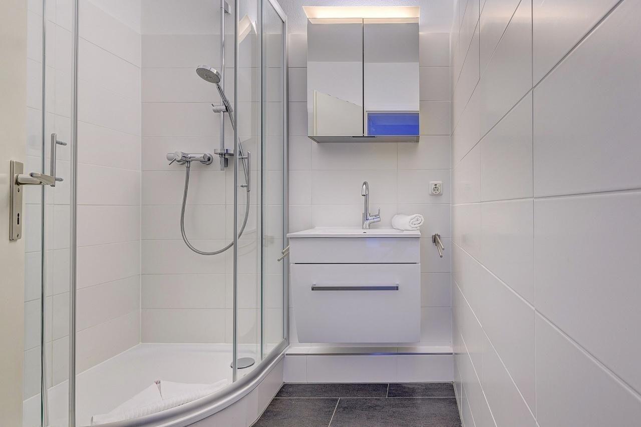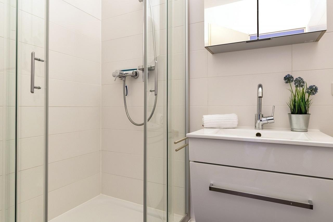 Ein lichtdurchfluteter, kombinierter Wohn-/Essraum mit stilsicher integrierter Küchenzeile und angrenzendem Essbereich für 4 Personen erwartet Sie. Die Küche verfügt über eine gute Grundausstattung inkl. kleinem, tragbaren Backofen für Ihre Urlaubsmahlzeiten - kochen Sie hier in geselliger Runde was das Herz begehrt! Im Wohnzimmer finden Sie eine bequeme Schlafcouch (200x200 cm) sowie einen modernen 55 Zoll Flachbildfernseher vor. Vom Balkon mit Südostausrichtung blickt man über die Dächer von Grömitz und in der Ferne blitzt sogar die Ostsee auf. Eine Markise sorgt für Sonnenschutz auf Ihrem geräumigen Außenbereich, wertige Lounge Möbel sorgen für Komfort - hier kann man am Abend bei einem guten Glas Wein angenehm entspannen oder morgens bei Sonnenschein frühstücken. Im separaten Schlafzimmer mit verdunkelnden Außenjalousien können es sich 2 Personen im Doppelbett bequem machen (140x200 cm, durchgängige Matratze). Im Wandschrank finden gibt es Stauraum für Ihre Ferienkleidung, zudem gibt es Im Schlafzimmer einen zweiten Flachbildfernseher, sowie einen Radiowecker. Das Duschbad ist ebenso geschmackvoll und stilsicher gestaltet, wie die gesamte Wohnung. Ein dunkler Fliesenboden im Kontrast zur weißen Ausstattung strahlt hochwertige Moderne aus, Annehmlichkeiten wie eine geräumige, halbrunde Eckdusche, sowie eine Handtuchwandheizung sorgen für gute Laune. Im Eingangs- /Flurbereich stehen weitere Einbauschränke mit viel Stauraum zur Verfügung.