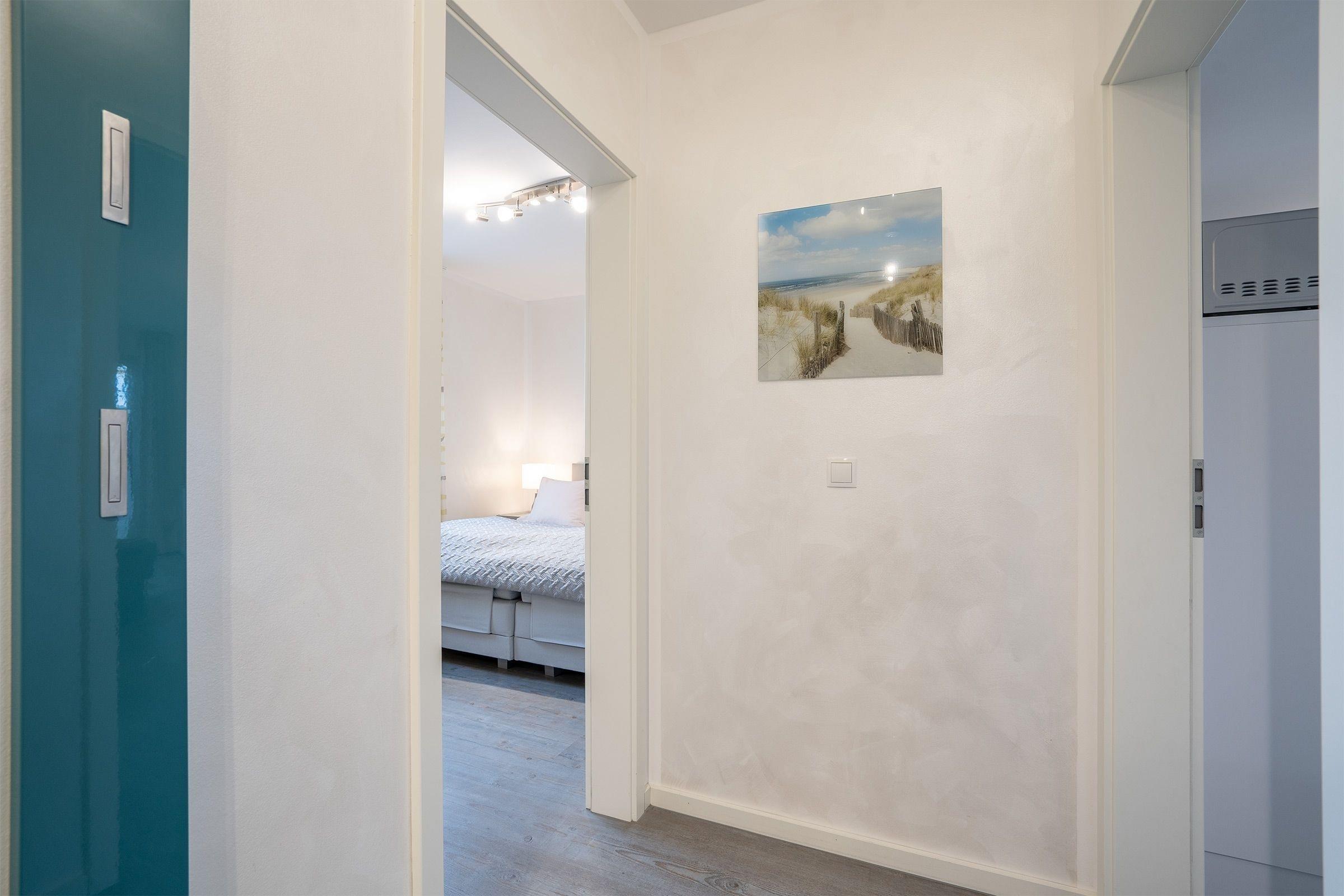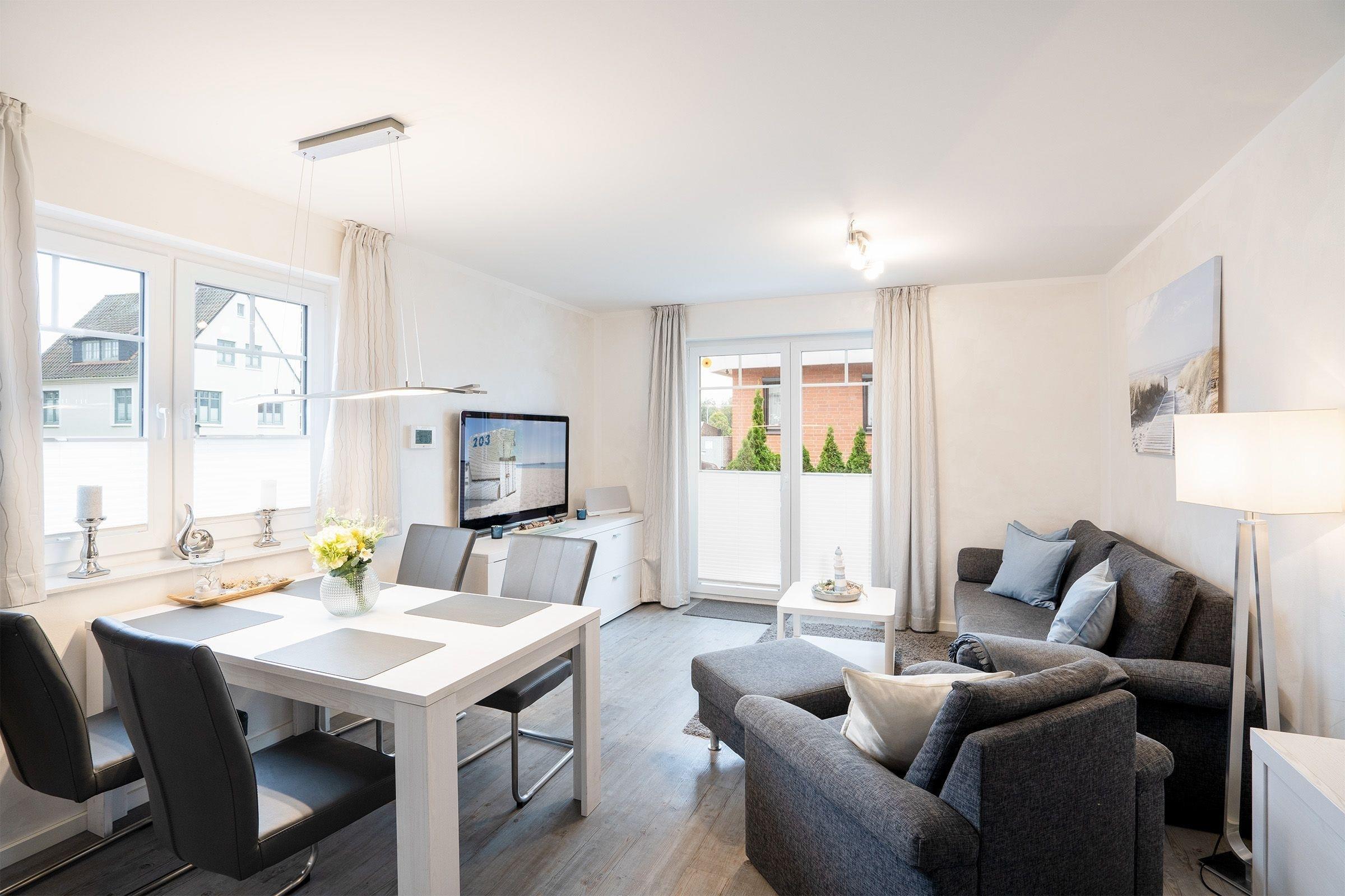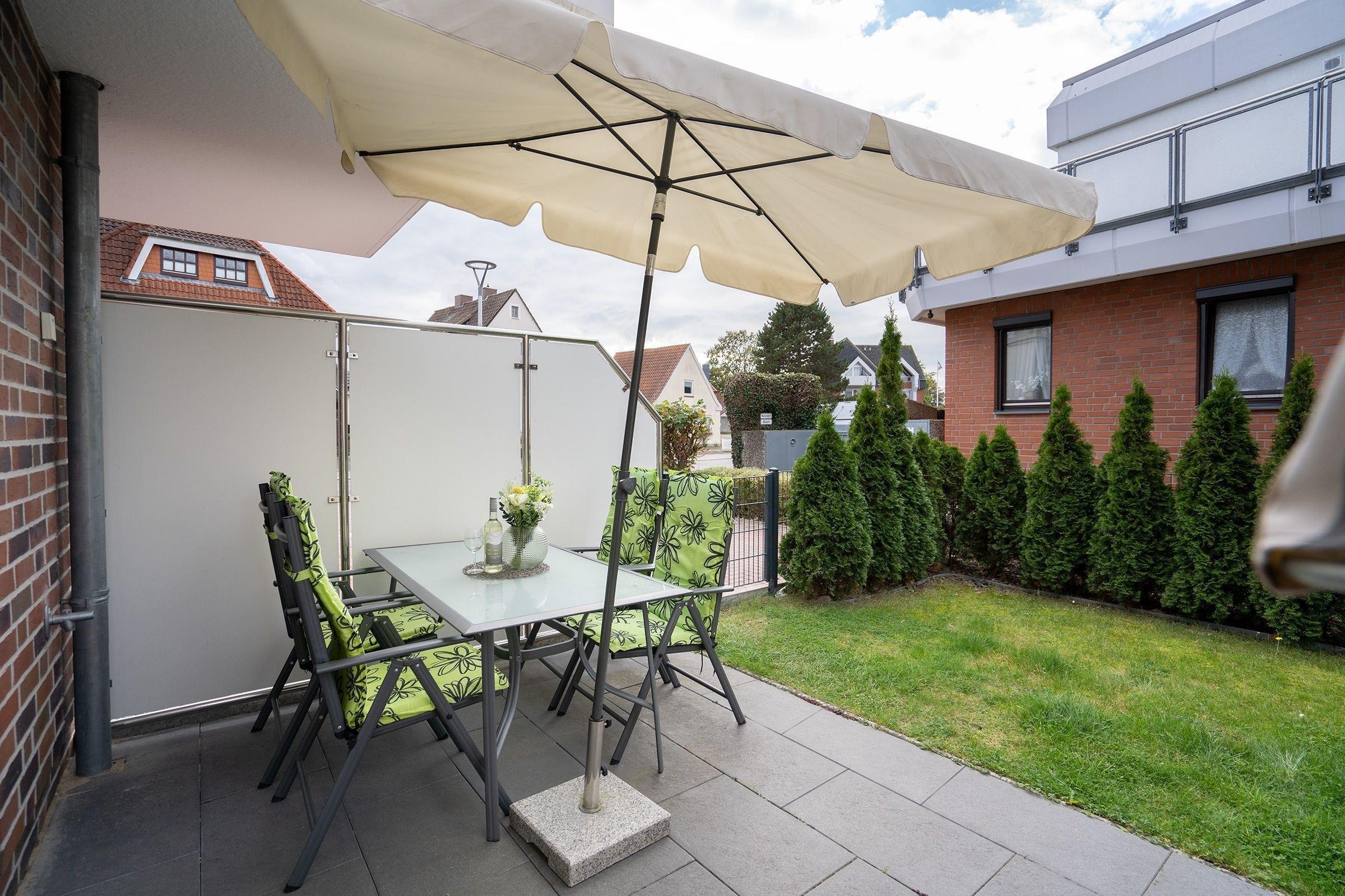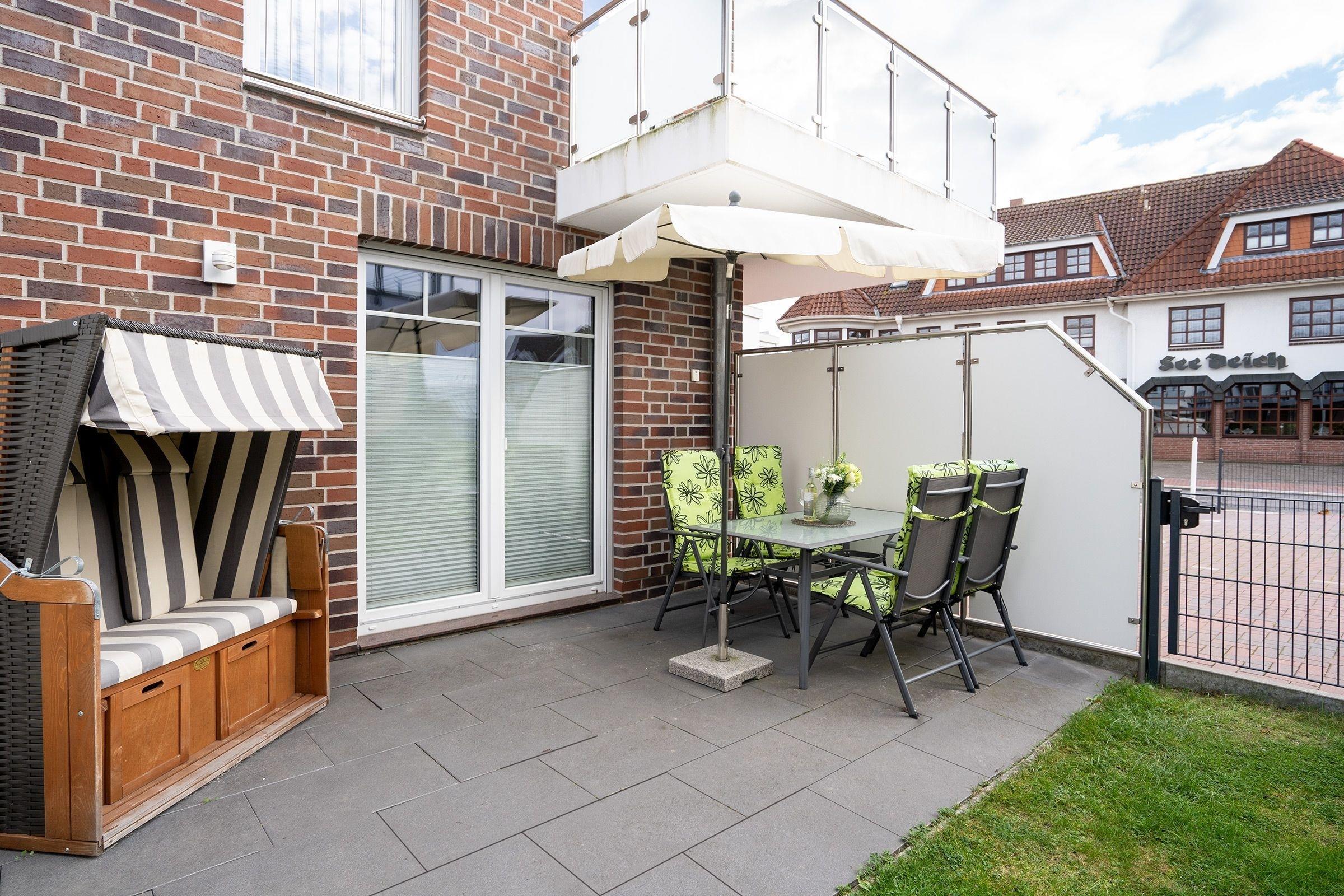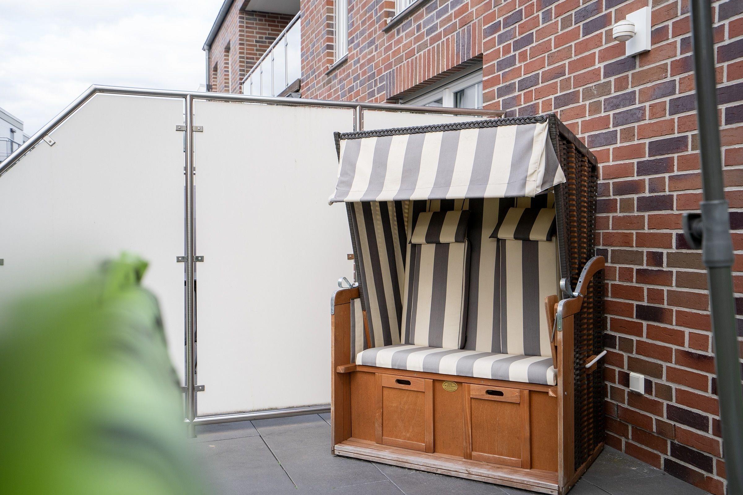 Die Wohnung liegt im Erdgeschoss, ist barrierearm und verfügt über eine Terrasse mit Strandkorb und passenden Gartenmöbeln.
