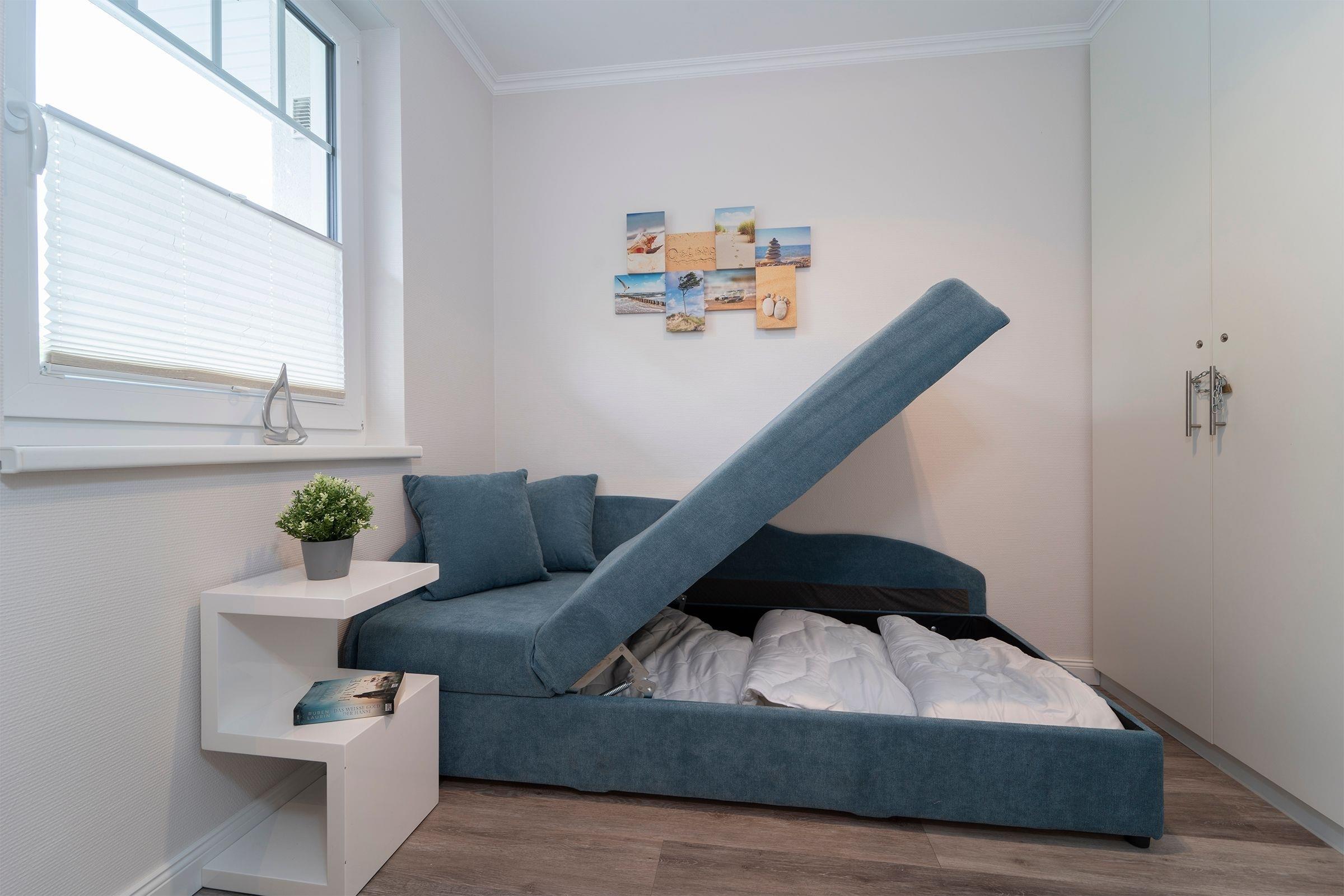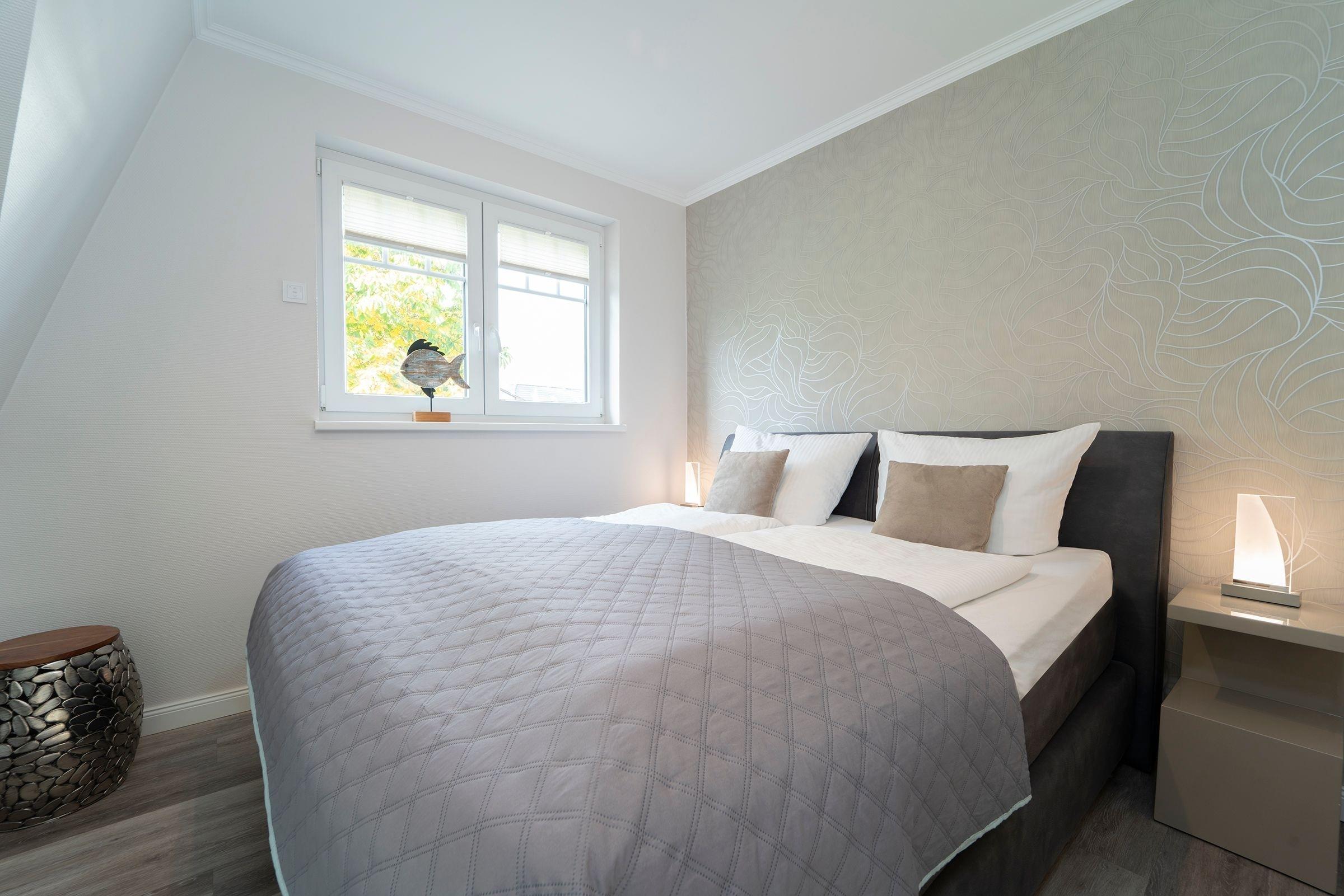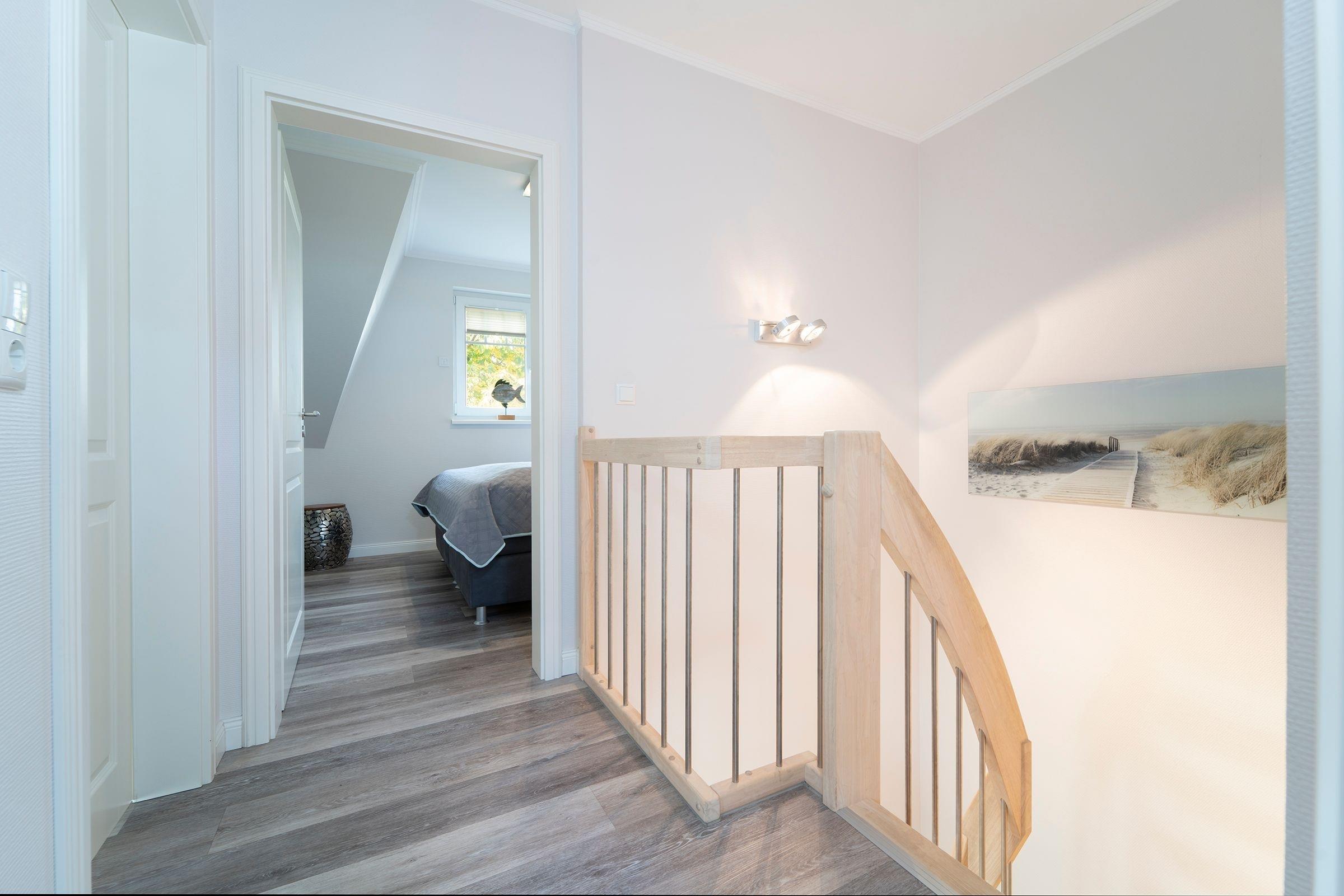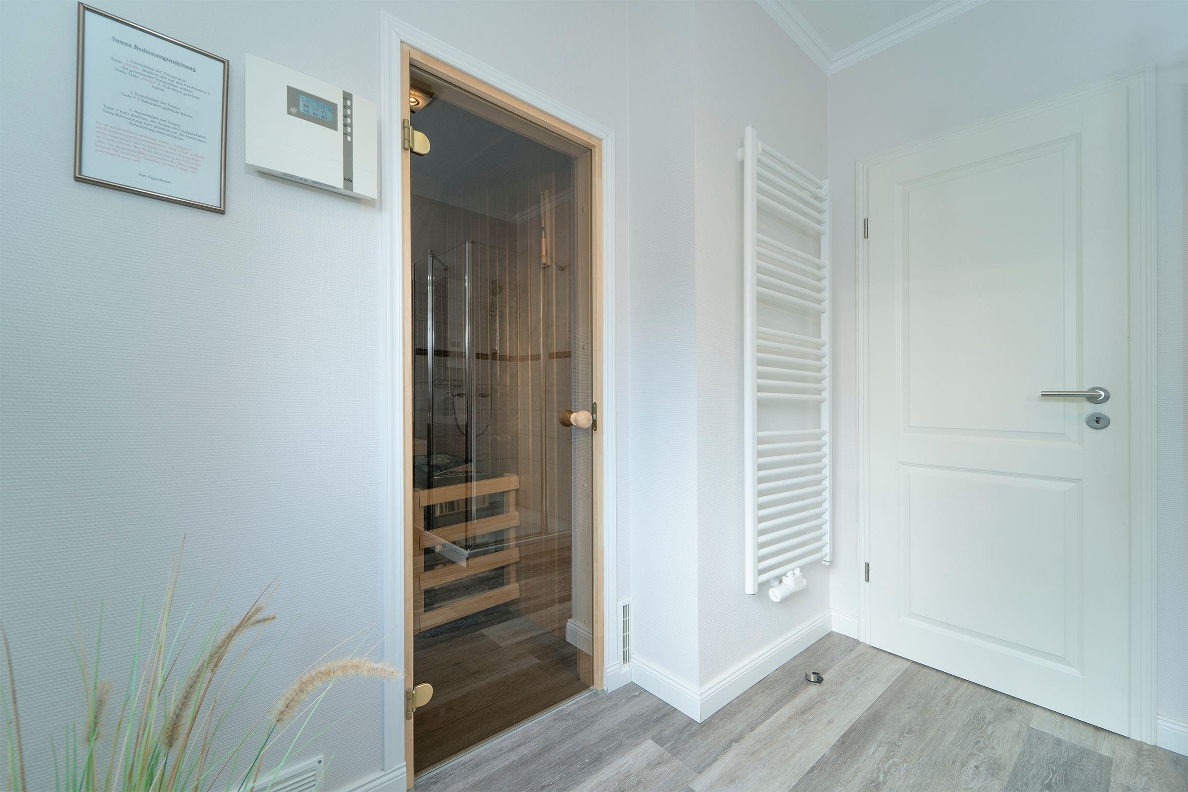 Im Erdgeschoss finden Sie ein helles, lichtdurchflutetes Wohnzimmer mit einer gemütlichen Sofalandschaft und einem modernen Flachbildfernseher. Im angrenzenden Essbereich trifft sich die ganze Familie um schöne Abende zu verbringen. In der komfortablen Küche bleiben keine Wünsche offen. Von der Spülmaschine, der Mikrowelle, einem Kühlschrank mit Gefrierfach und Backofen bis hin zum Wasserkocher und Toaster ist alles für Ihr perfektes Dinner vorhanden. Im Erdgeschoss steht ein Gästezimmer mit einem Einzelbett (Federkernmatratze, 90x200 cm) zur Verfügung. Auf gleicher Etage befindet sich ein Duschbad mit Waschbecken, WC und Waschmaschine gegen Gebühr. Das Haus verfügt über ein zweites, geräumiges Badezimmer mit Dusche und Sauna in der 1. Etage. Ebenfalls in der 1. Etage befinden sich zwei komfortable Schlafzimmer. Nach einem erlebnisreichen Urlaubstag finden Sie mit den hochwertigen Original ORTHOPÄDIKA Boxspring-Doppelbetten (180x200 cm bzw. 160x200 cm) problemlos Entspannung und Ruhe. In jedem Schlafzimmer befindet sich ein Einbauschrank und ein Flachbild-TV sowie Verdunklungsrollos.