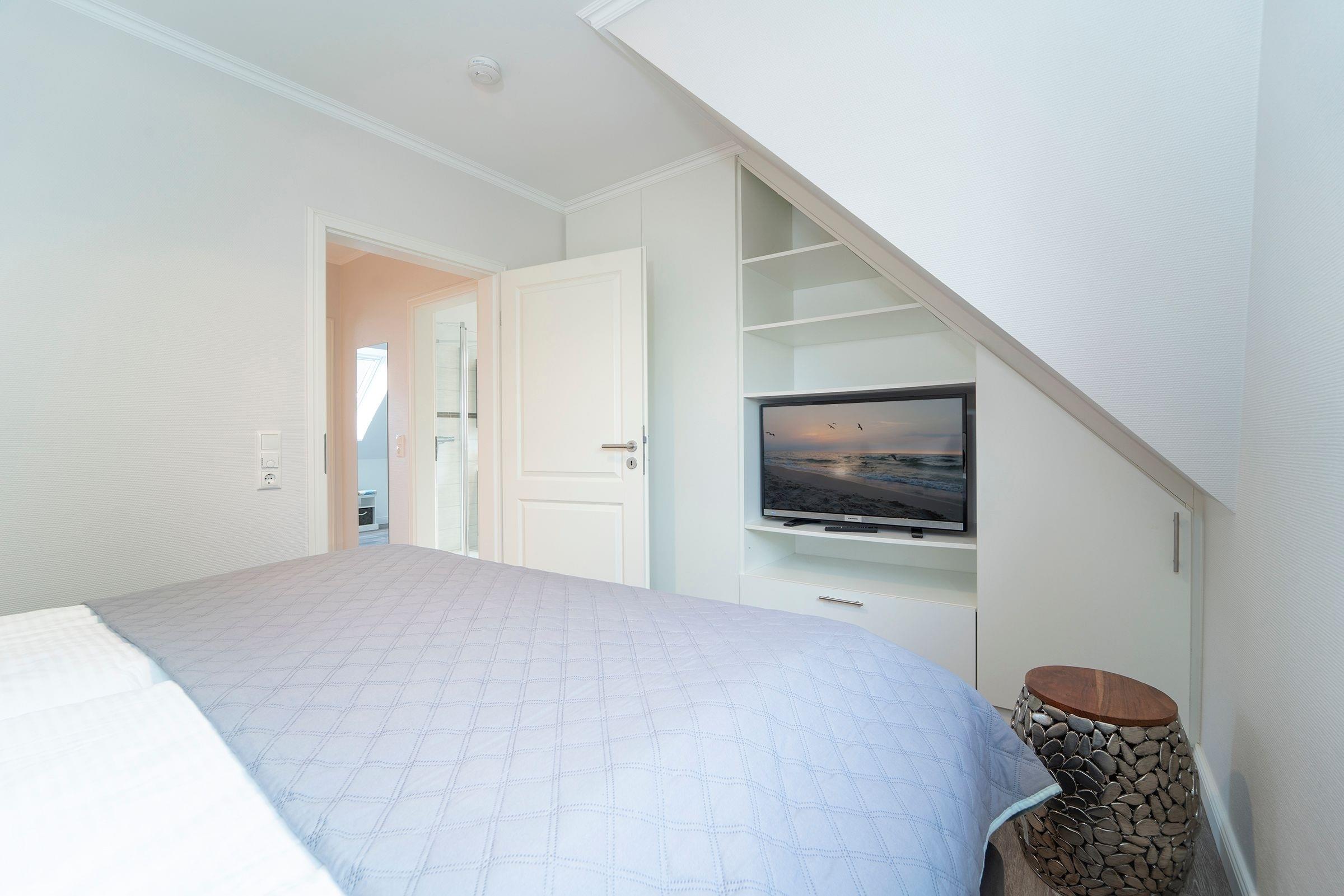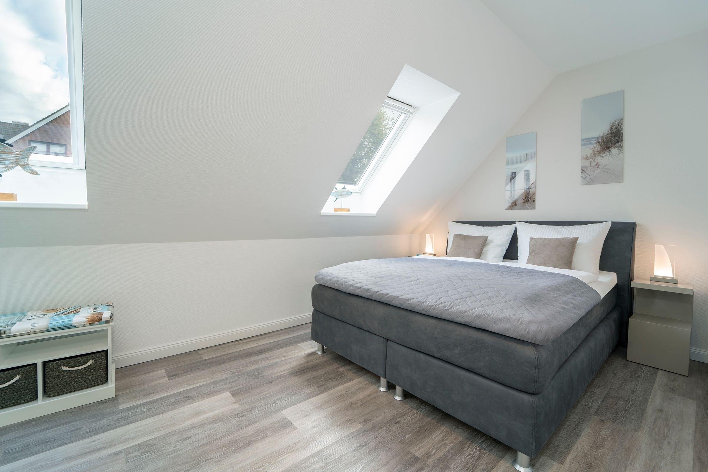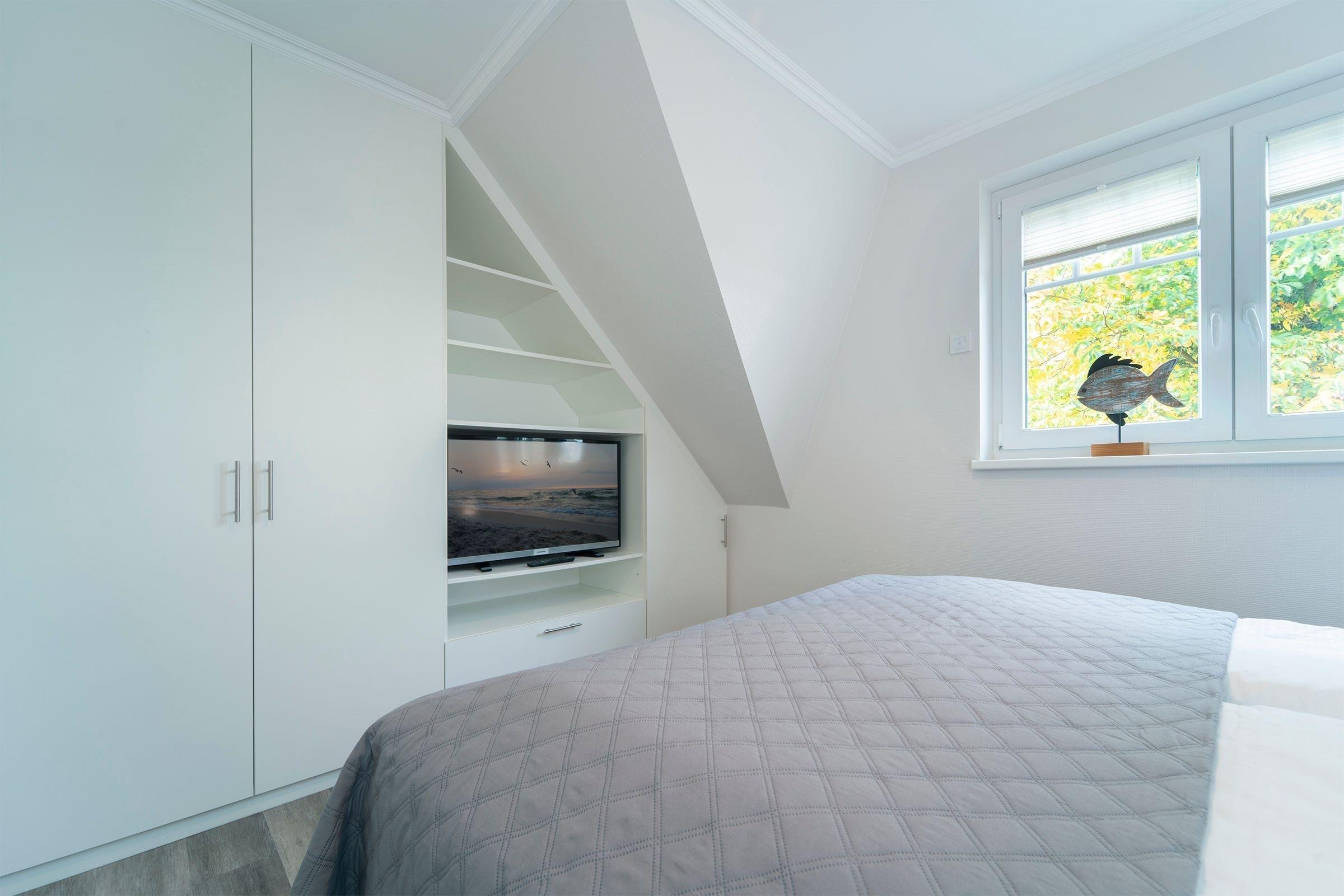 Schlafzimmer 2: Doppelboxspringbett (160x200 cm), im OG, Kleiderschrank, TV Verdunklungsrollos