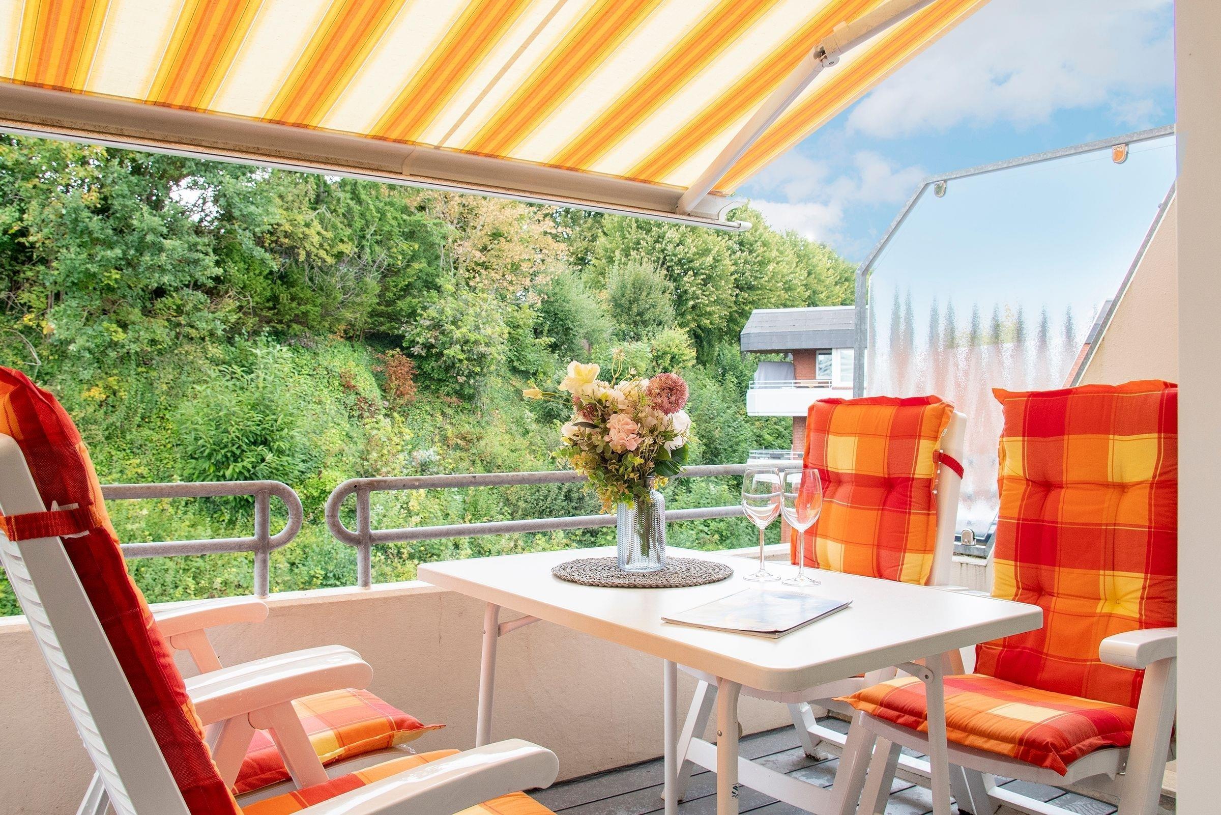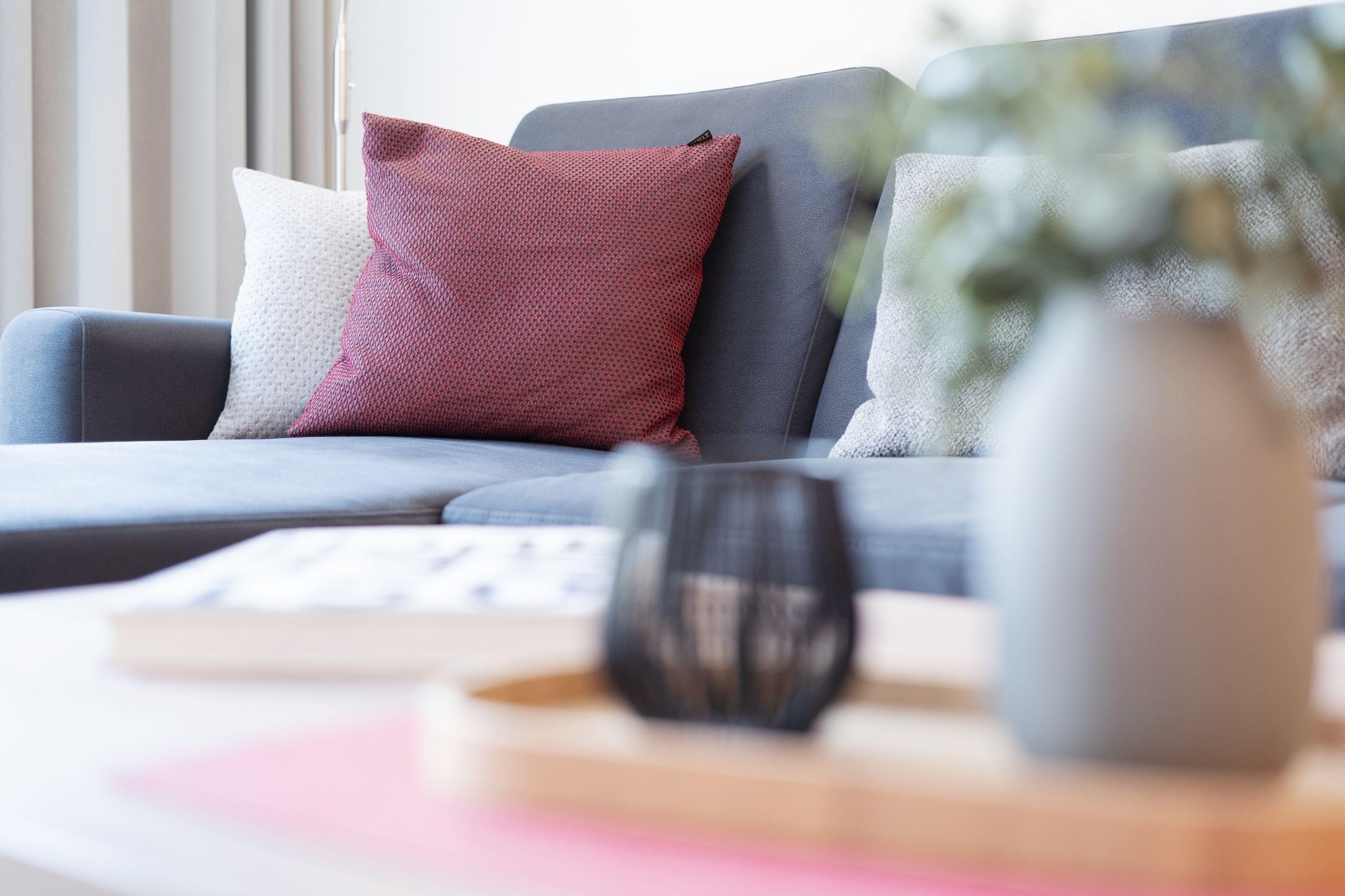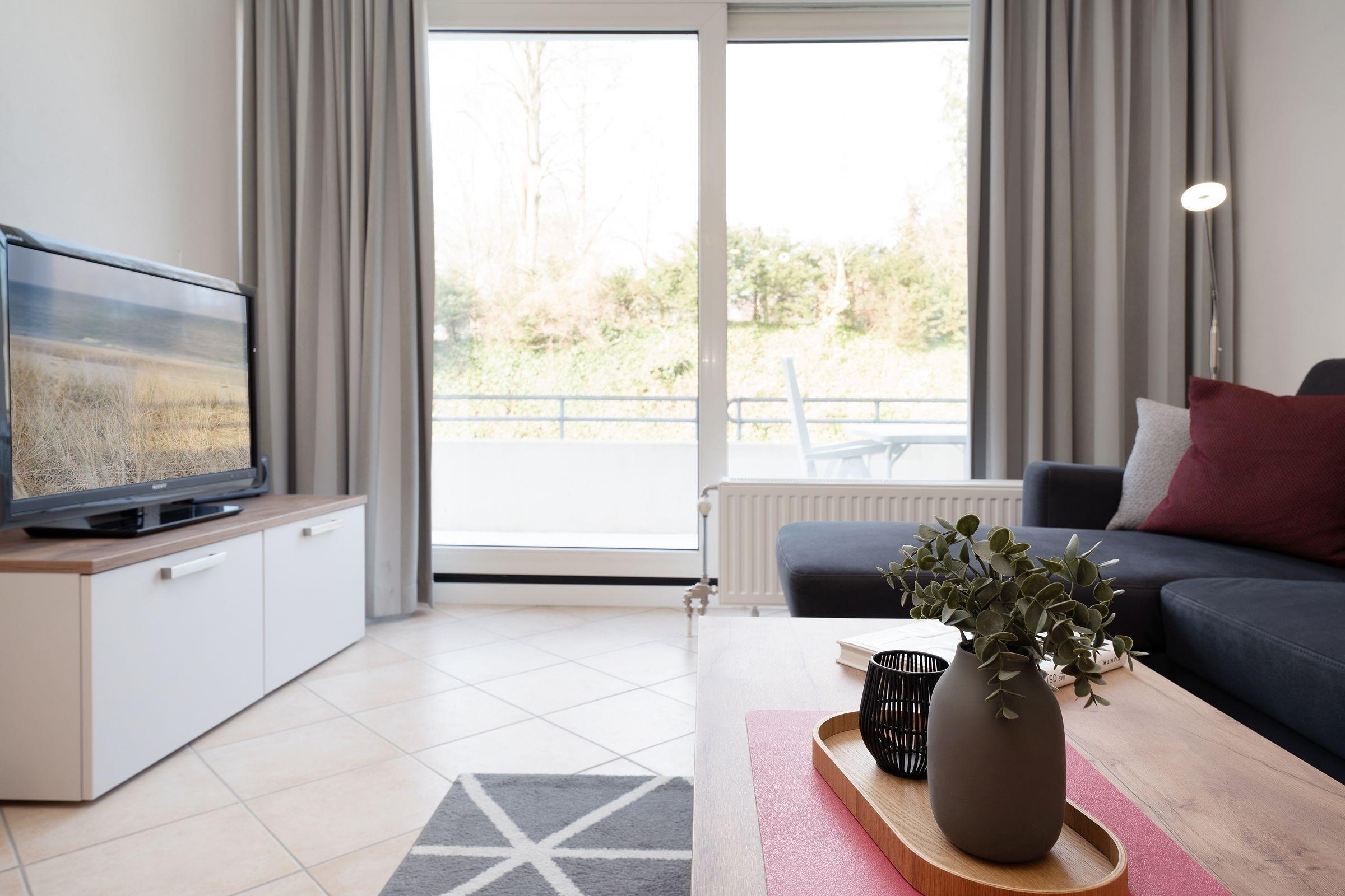 Das Herzstück dieser geschmackvolle 2-Zimmer-Ferienwohnung ist der offen gestaltete Wohn-/Essbereich mit moderner integrierter Küche, stilvollem Essplatz für 4 Personen, komfortabler Sofalandschaft mit Flatscreen-TV sowie Blick ins Grüne und Balkonzugang Richtung Kurpark. Auf 55 m² Wohnfläche finden hier bis zu 4 Personen ausreichend Platz und Komfort.
