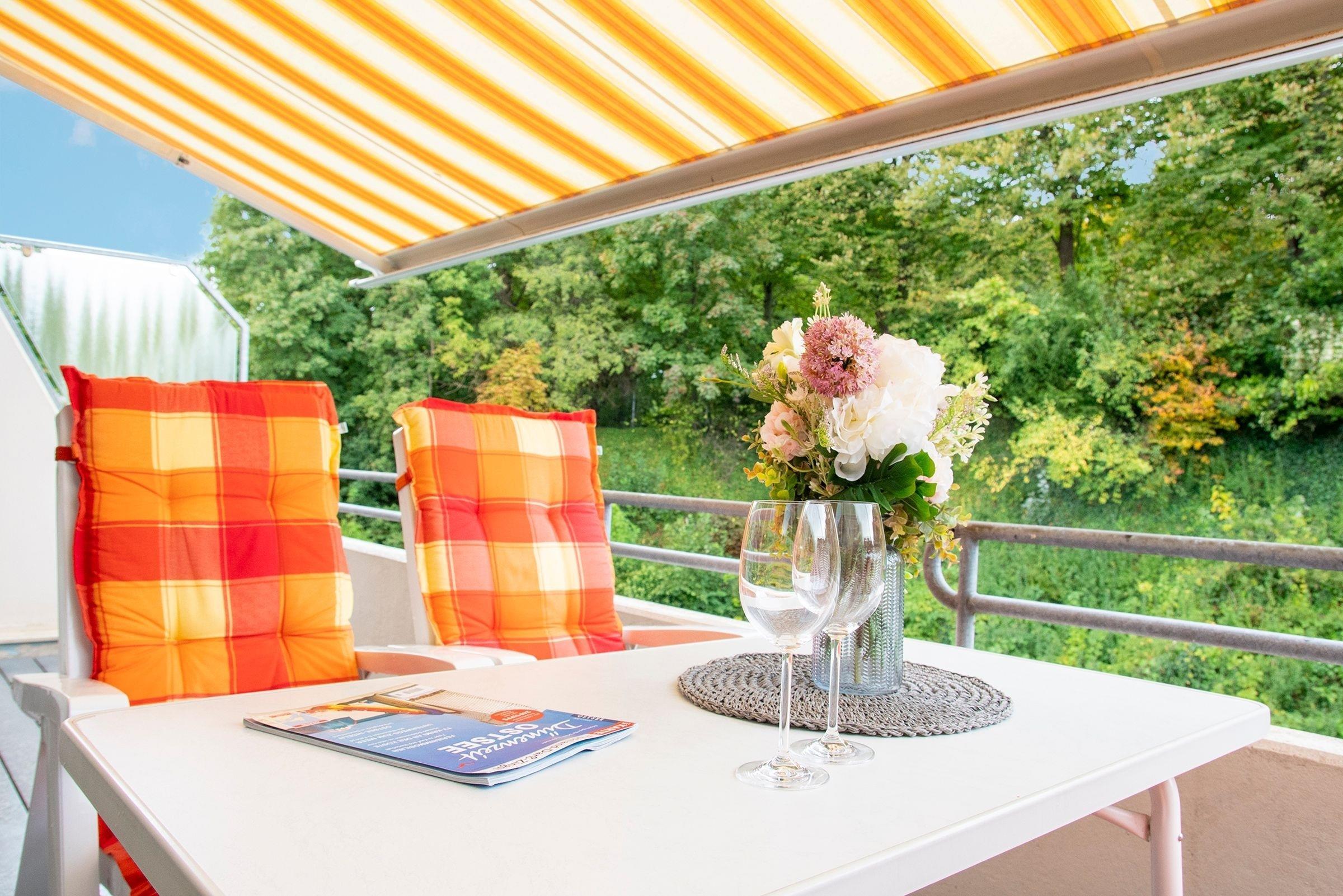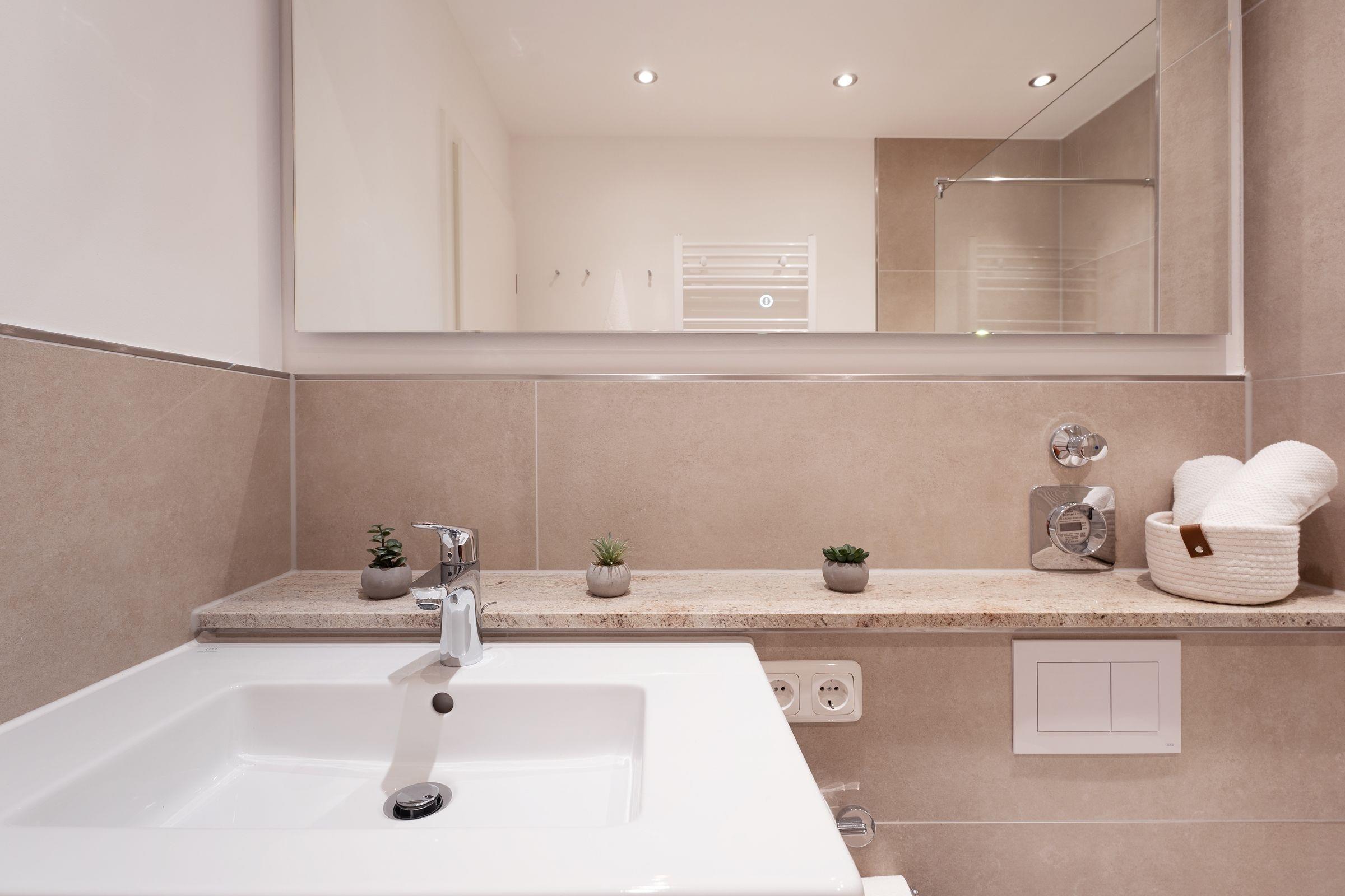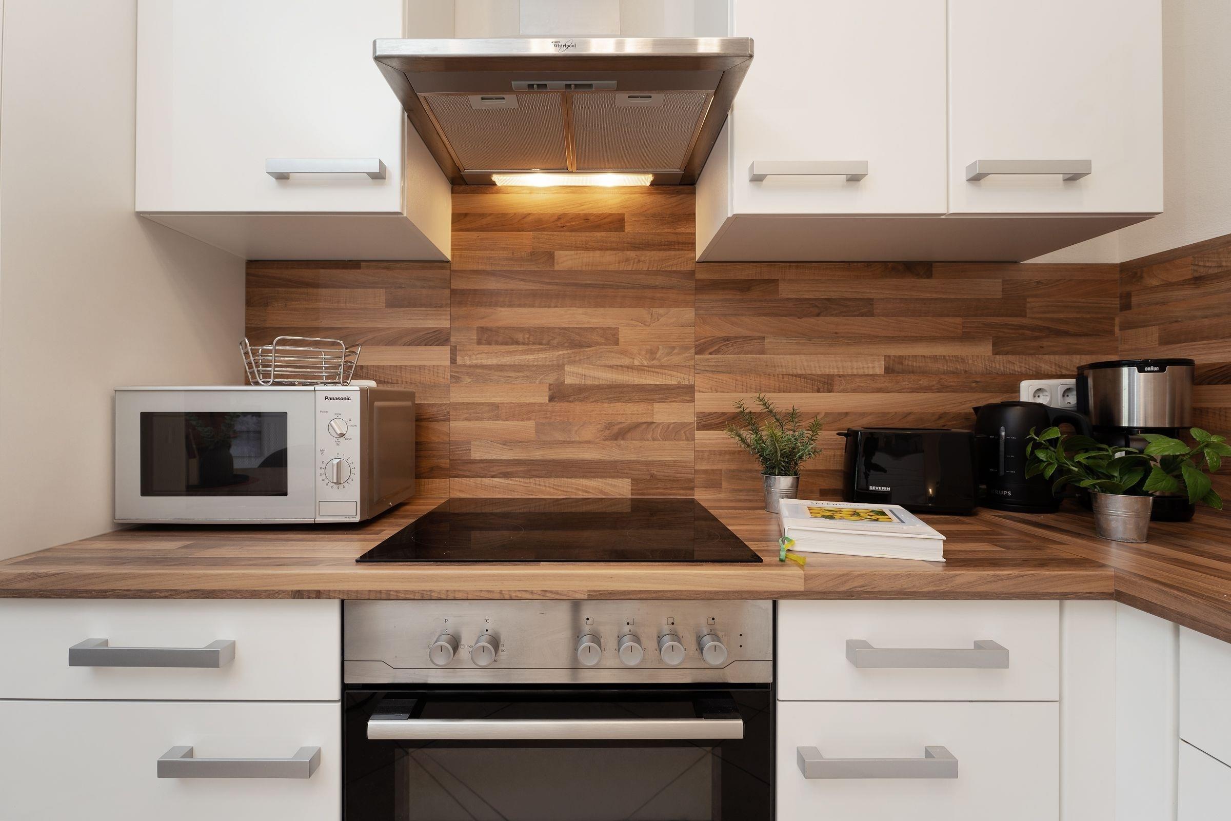 Das Herzstück dieser geschmackvolle 2-Zimmer-Ferienwohnung ist der offen gestaltete Wohn-/Essbereich mit moderner integrierter Küche, stilvollem Essplatz für 4 Personen, komfortabler Sofalandschaft mit Flatscreen-TV sowie Blick ins Grüne und Balkonzugang Richtung Kurpark. Auf 55 m² Wohnfläche finden hier bis zu 4 Personen ausreichend Platz und Komfort.
