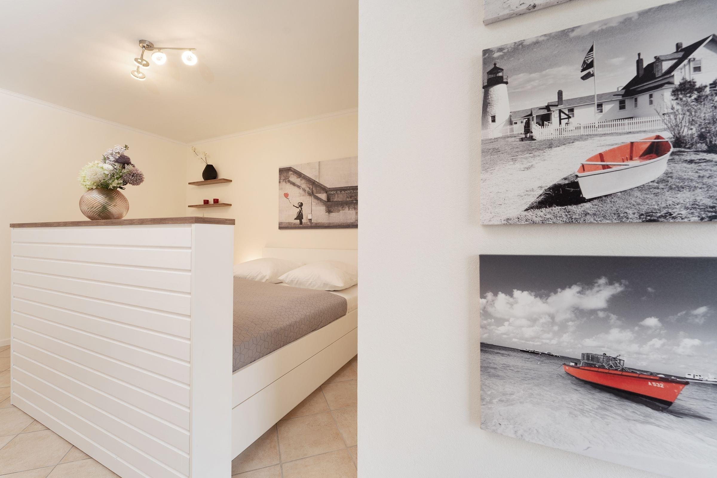 Das separate Schlafzimmer ist mit einem hochwertigen Boxspringbett (160 cm x 200 cm) und einem modernen Kleiderschrank mit ausreichend Staufläche ausgestattet, im Wohnzimmer bietet ein Schlafbereich mit einem bequemen Doppelbett (2x 80x200 cm) einen weiteren Schlafplatz. Die Küche bietet tolle Alltagshelfer wie einen 4-Platten-Ceranherd, Kühlschrank mit Gefrierfach und Spülmaschine. Das moderne Badezimmer besticht durch eine stilvolle Dusche, hochwertige Armaturen und ein harmonisches Design, das Komfort und Eleganz vereint.