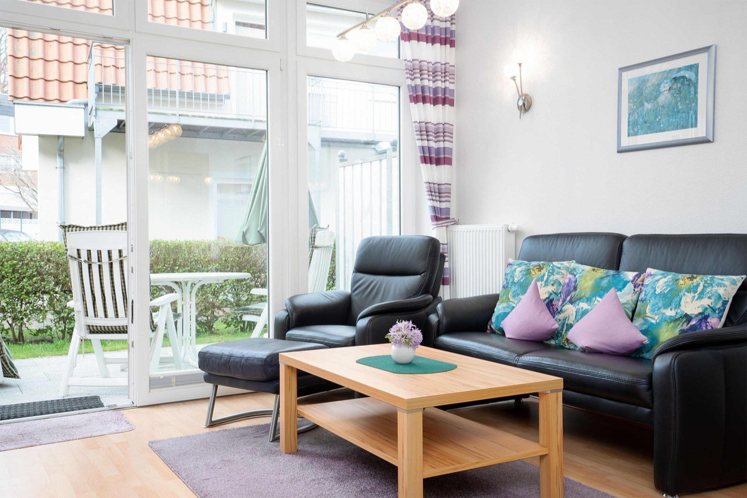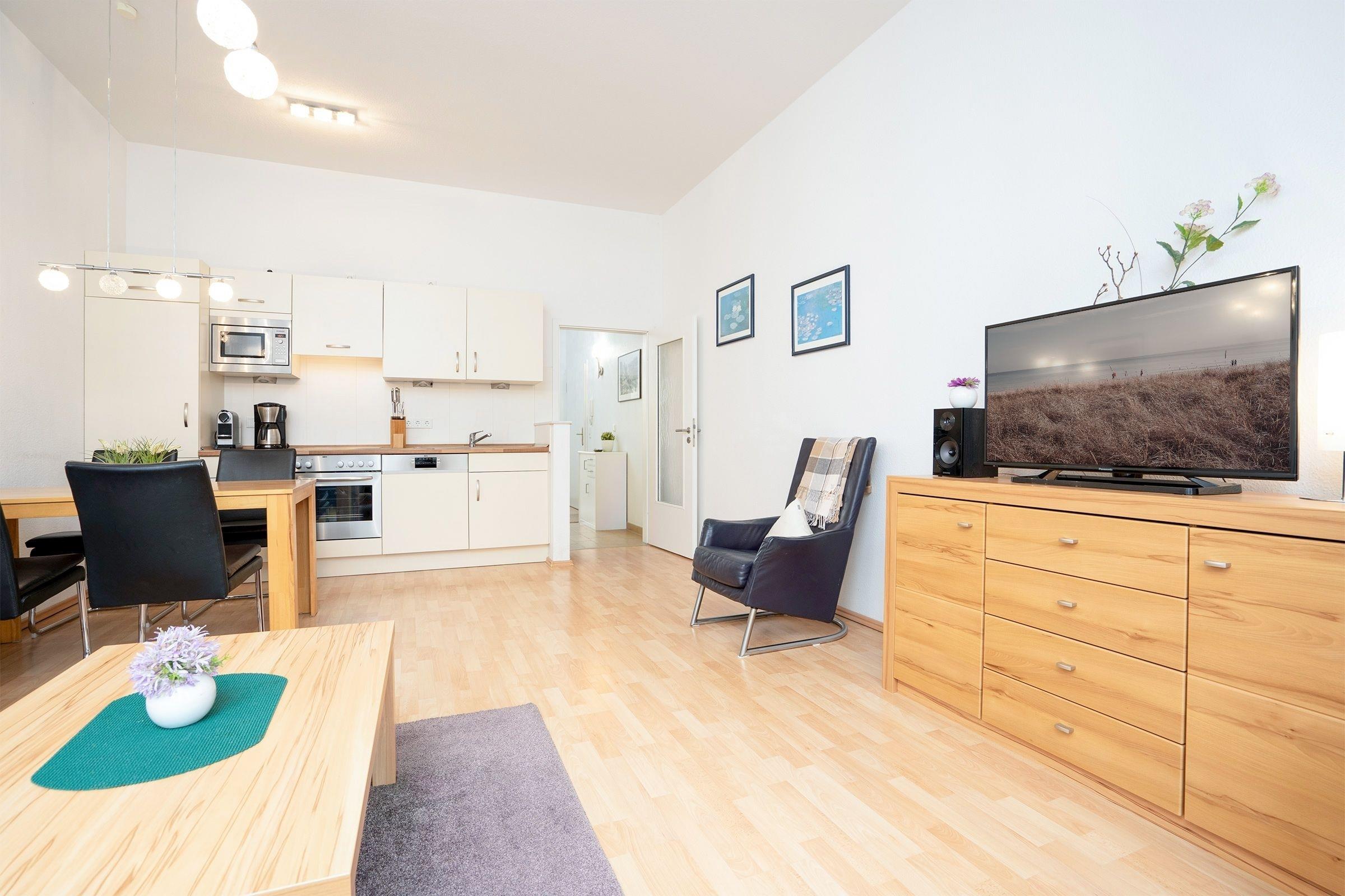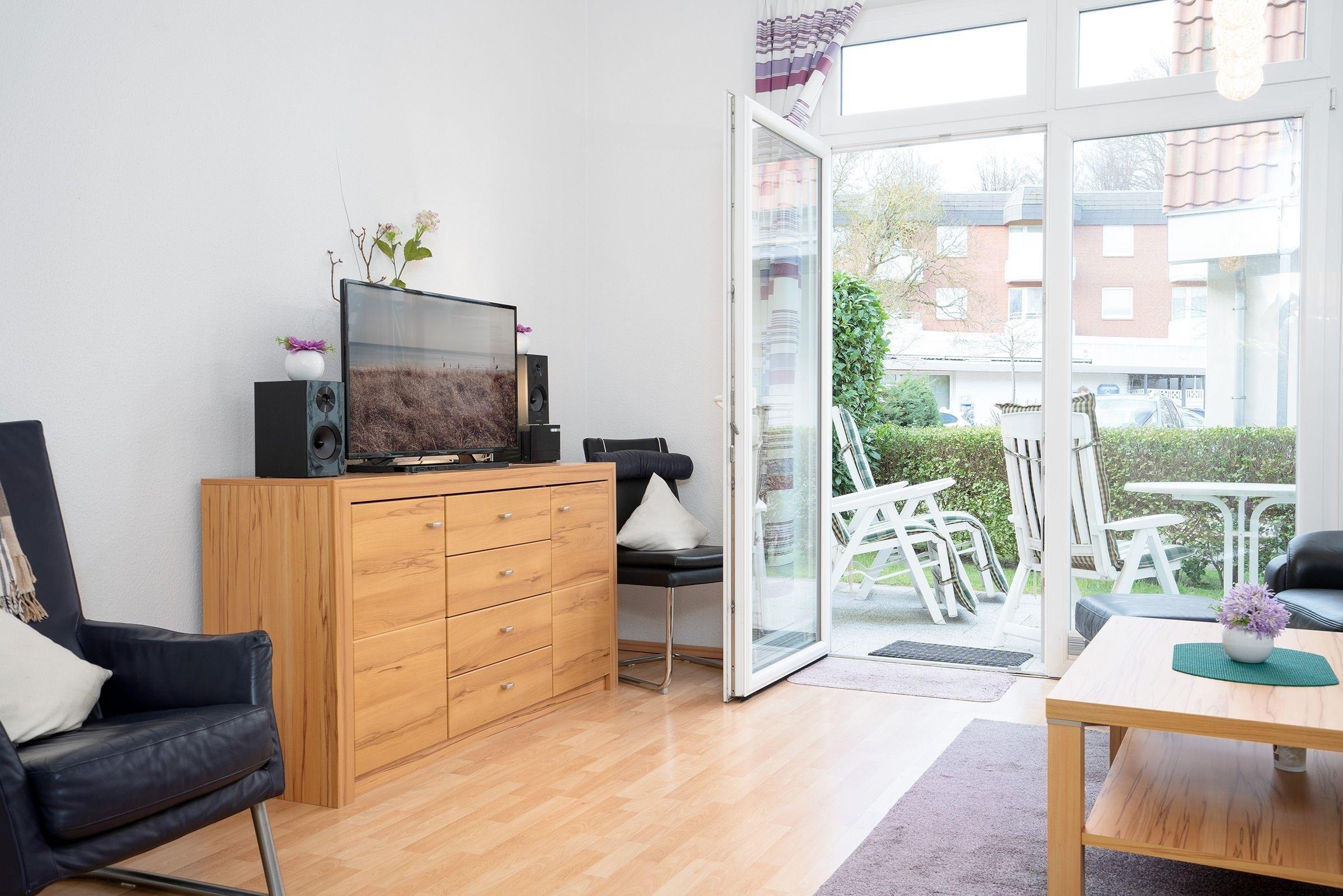 Das großzügig geschnittene Wohnzimmer mit gemütlicher Sofalandschaft lädt zum Entspannen und Wohlfühlen ein! Es gibt eine Essecke und eine offene, voll ausgestattete Küche mit einer Espressomaschine. Für gute Unterhaltung sorgen ein TV, sowie WLAN. Der Weg zum Bäcker ist nicht weit, sodass Sie sich jeden Tag frische Brötchen auf der nach Südwesten ausgerichteten, möblierten Terrasse bei einem ausgiebigen Frühstück schmecken lassen können. Außerdem verfügt dieses Feriendomizil über ein separates Schlafzimmer mit Doppelbett (2x 90x200cm) und großem Kleiderschrank mit Spiegeltür, sowie ein kleineres Schlafzimmer mit Einzelbett und Schlafsessel (je 90x200 cm). Beide Schlafzimmer sind mit einem zusätzlichen TV-Gerät ausgestattet. Ein großzügiges Bad mit komfortabler ebenerdiger Dusche, Waschbecken, Duschhocker und WC runden diese schöne Wohnung ab.