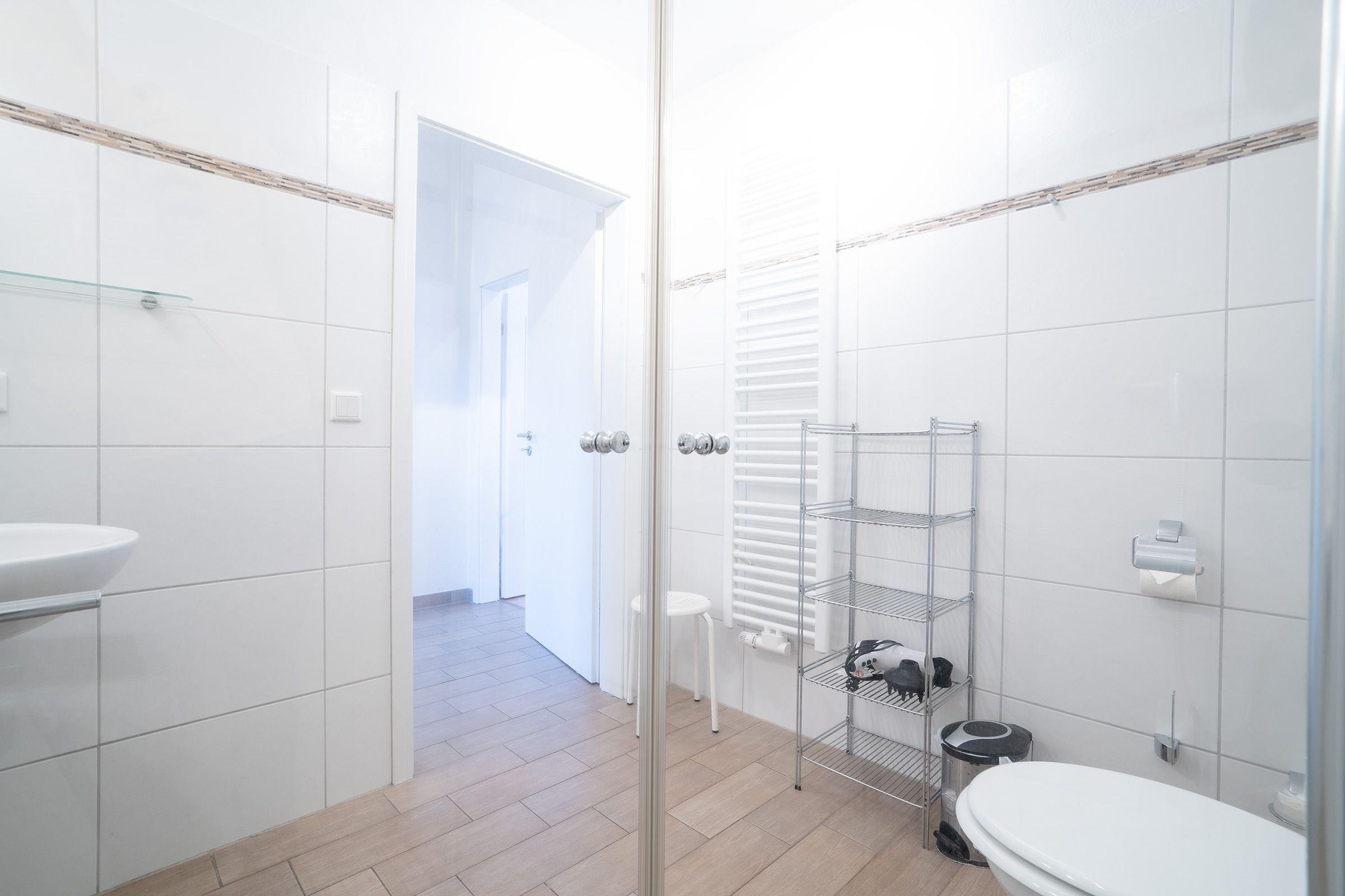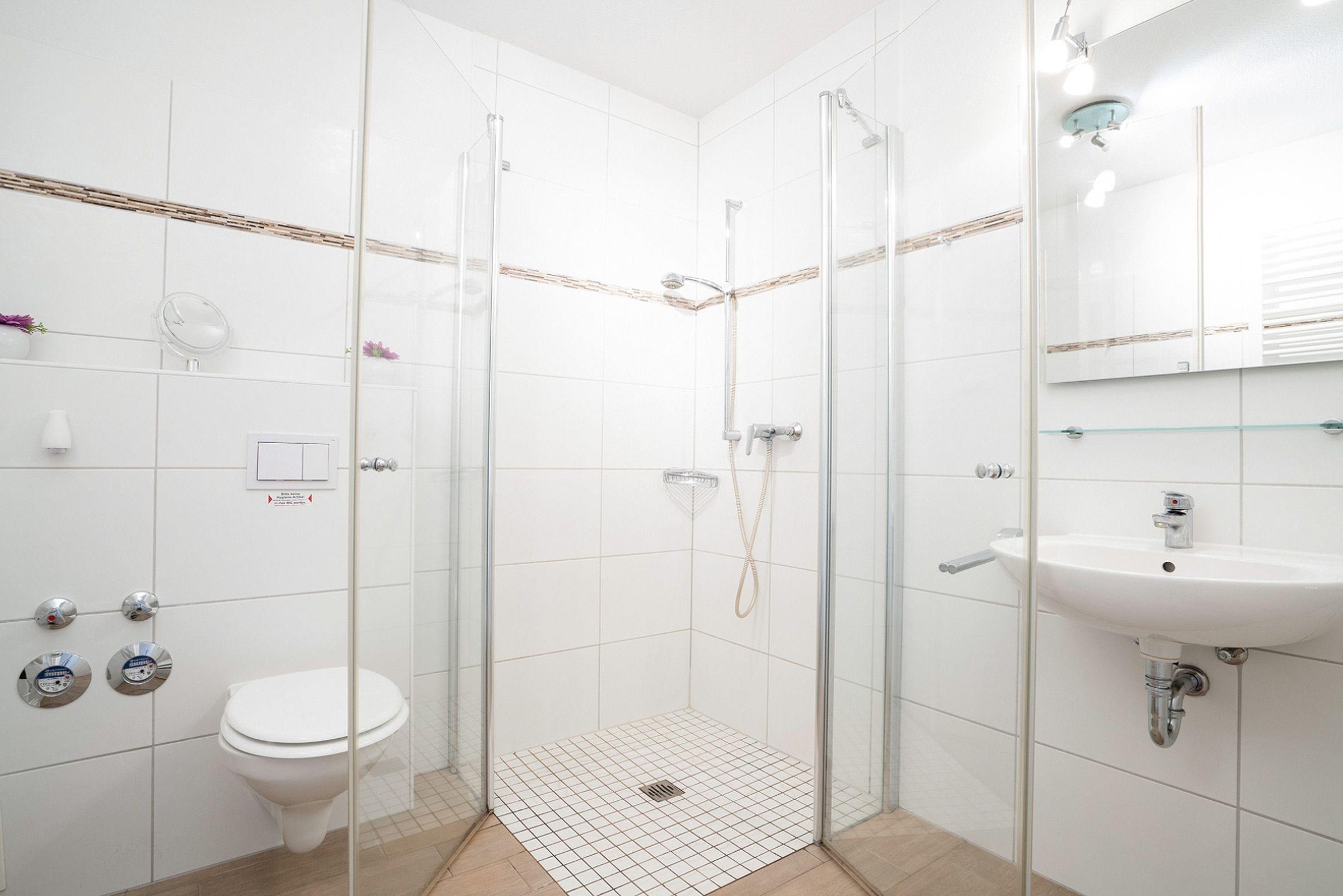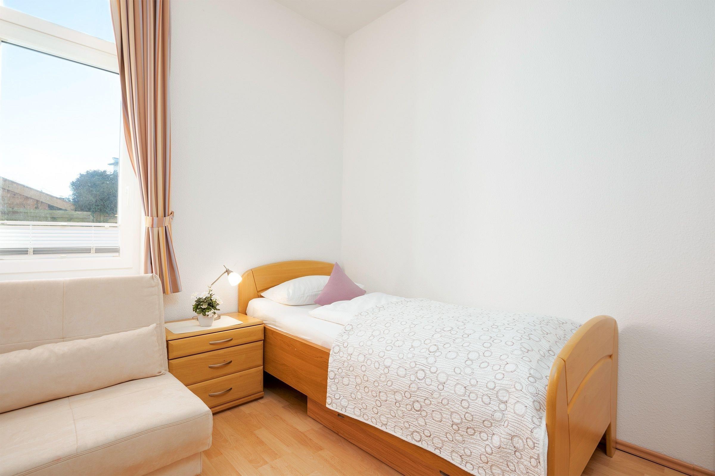 Das großzügig geschnittene Wohnzimmer mit gemütlicher Sofalandschaft lädt zum Entspannen und Wohlfühlen ein! Es gibt eine Essecke und eine offene, voll ausgestattete Küche mit einer Espressomaschine. Für gute Unterhaltung sorgen ein TV, sowie WLAN. Der Weg zum Bäcker ist nicht weit, sodass Sie sich jeden Tag frische Brötchen auf der nach Südwesten ausgerichteten, möblierten Terrasse bei einem ausgiebigen Frühstück schmecken lassen können. Außerdem verfügt dieses Feriendomizil über ein separates Schlafzimmer mit Doppelbett (2x 90x200cm) und großem Kleiderschrank mit Spiegeltür, sowie ein kleineres Schlafzimmer mit Einzelbett und Schlafsessel (je 90x200 cm). Beide Schlafzimmer sind mit einem zusätzlichen TV-Gerät ausgestattet. Ein großzügiges Bad mit komfortabler ebenerdiger Dusche, Waschbecken, Duschhocker und WC runden diese schöne Wohnung ab.