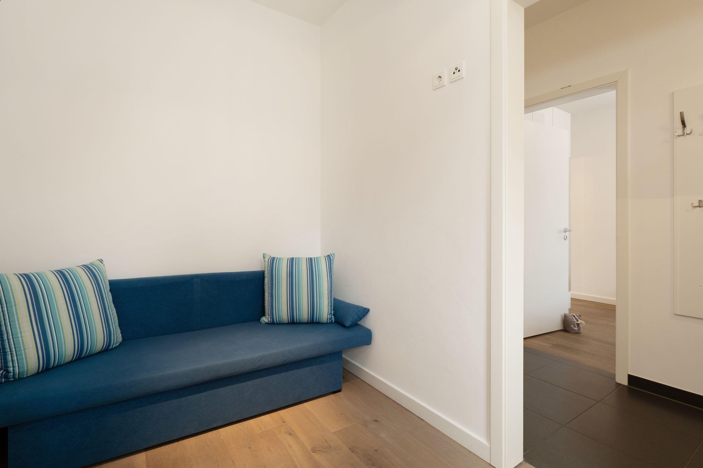 Alles ausgeräumt und verstaut? Dann wird es Zeit für einen frisch gebrühten Kaffee! Die in Wohn- und Essraum integrierte hochwertige Küchenzeile ist in weißem Hochglanz gehalten und verfügt über ein 4-er Ceranfeld, Backofen, Spülmaschine und einem eingebauten Kaffeeautomaten. Vom Wohnzimmer gelangen Sie direkt auf Ihre möblierte ruhig gelegene Terrasse Richtung Westen mit Markise. Vom Flur aus sind beide Schlafzimmer erreichbar: eines mit Doppelbett (2x90x200cm) und großem Kleiderschrank sowie Zugang zum Bad mit ebenerdiger Dusche, ein weiterer separater Schlafraum mit Einzelbett (90x200 cm) und einer Schlafcouch (ca. 120x195 cm). Vom Flur zugänglich befindet sich ein weiteres Duschbad. Alle Fenster sind mit Plissee-Jalousien und zusätzlich mit dunklen Fensterläden versehen. Ein Waschtrockner sowie kostenfreies WLAN stehen Ihnen ebenfalls zur Verfügung.
