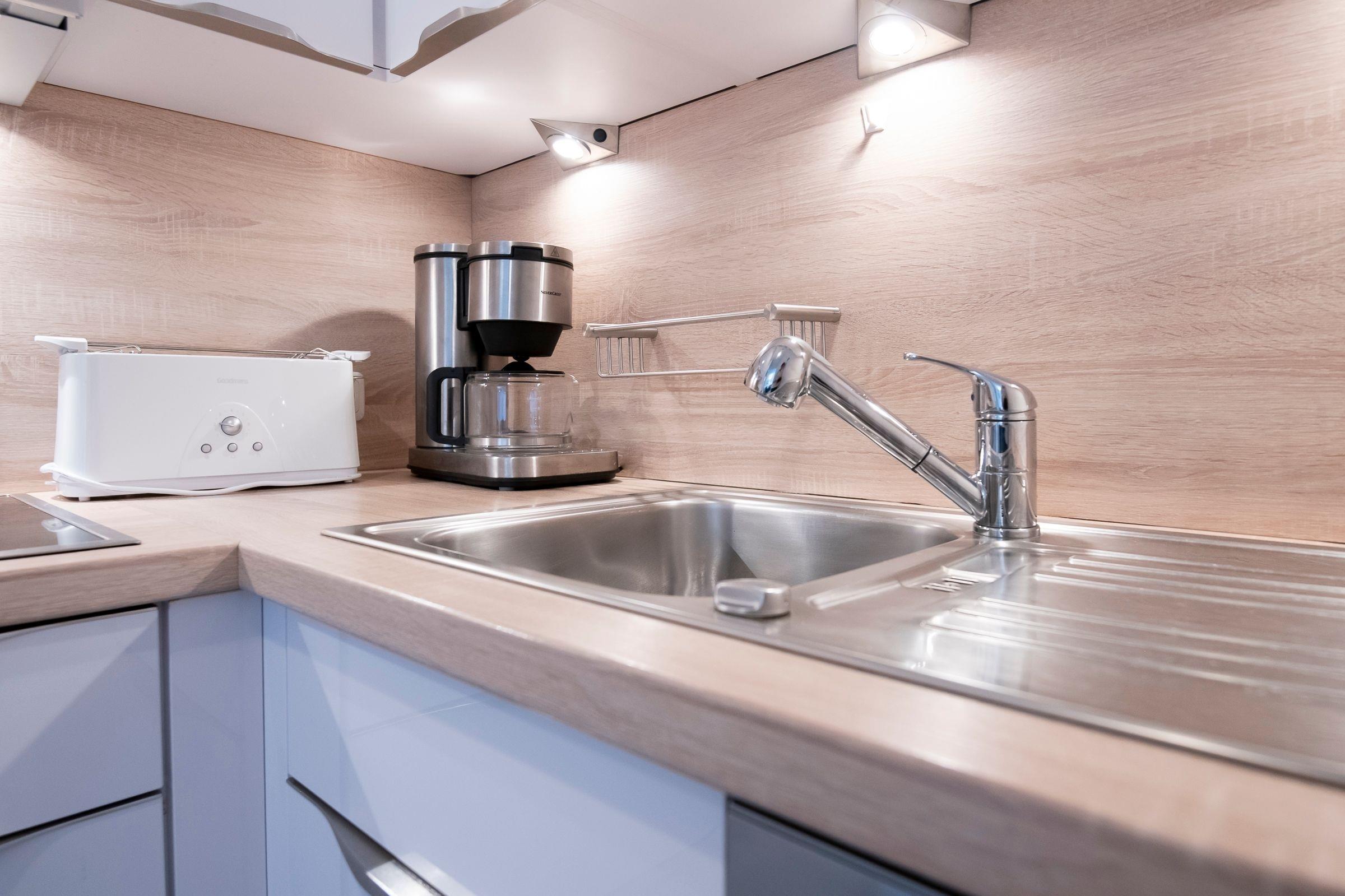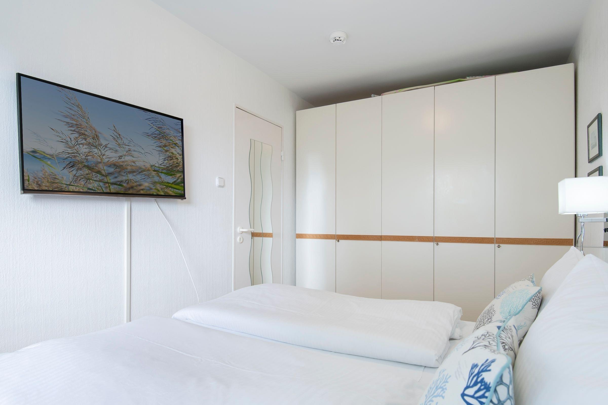 Lichtdurchflutet und hell begrüßt Sie der Wohnraum mit integriertem Essbereich. Eine komfortable Sofaecke und ein Flachbild-TV sorgen nach langen Strandspaziergängen für Entspannung. Über einen kostenlosen WLAN-Anschluss bleiben Sie auch im Urlaub für Ihre Lieben erreichbar. Vom Wohnzimmer führt ein direkter Zugang auf den möblierten Balkon mit seitlichem Blick Richtung Ostsee, eine Markise schützt hier an Sommertagen vor zu starker Sonne. In der kleinen separaten Küche (offene Tür) sind von der Mikrowelle, über den Backofen und den 4-Plattenceranherd diverse Alltagshelfer vorhanden und die Spülmaschine erledigt den Abwasch. Das größere der beiden Schlafzimmer ist mit einem Doppelbett (2x90x190cm), das zweite Schlafzimmer ist mit einem Etagenbett (je 90x200cm) ausgestattet. In beiden Schlafräumen sorgen Außenjalousien für angenehme Verdunklung und erholsamen Schlaf. Das geschmackvolle Designbad sorgt mit Wohlfühlausstattung wie Dusche, WC und Waschtisch mit Schminkspiegel gleich morgens für gute Laune.