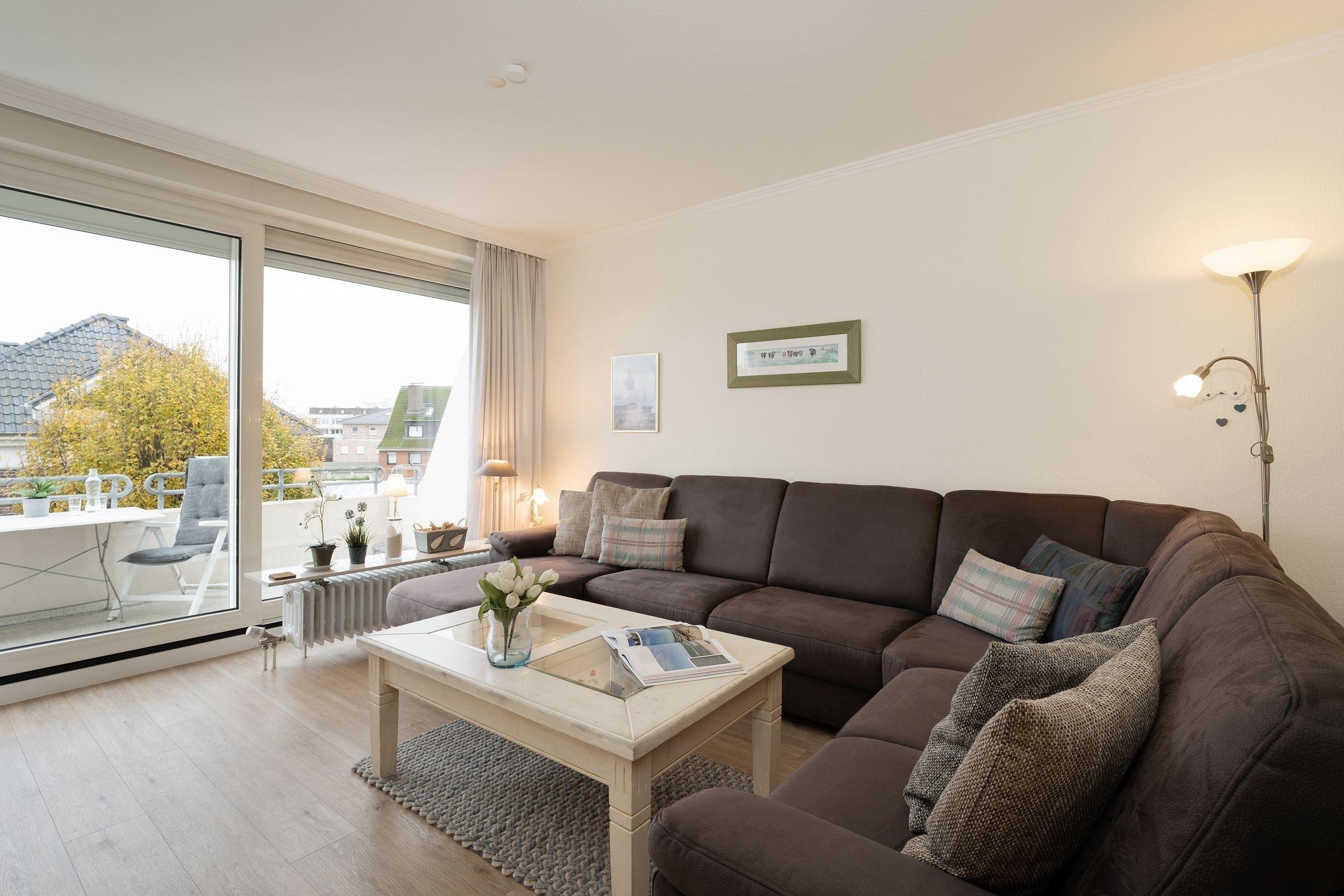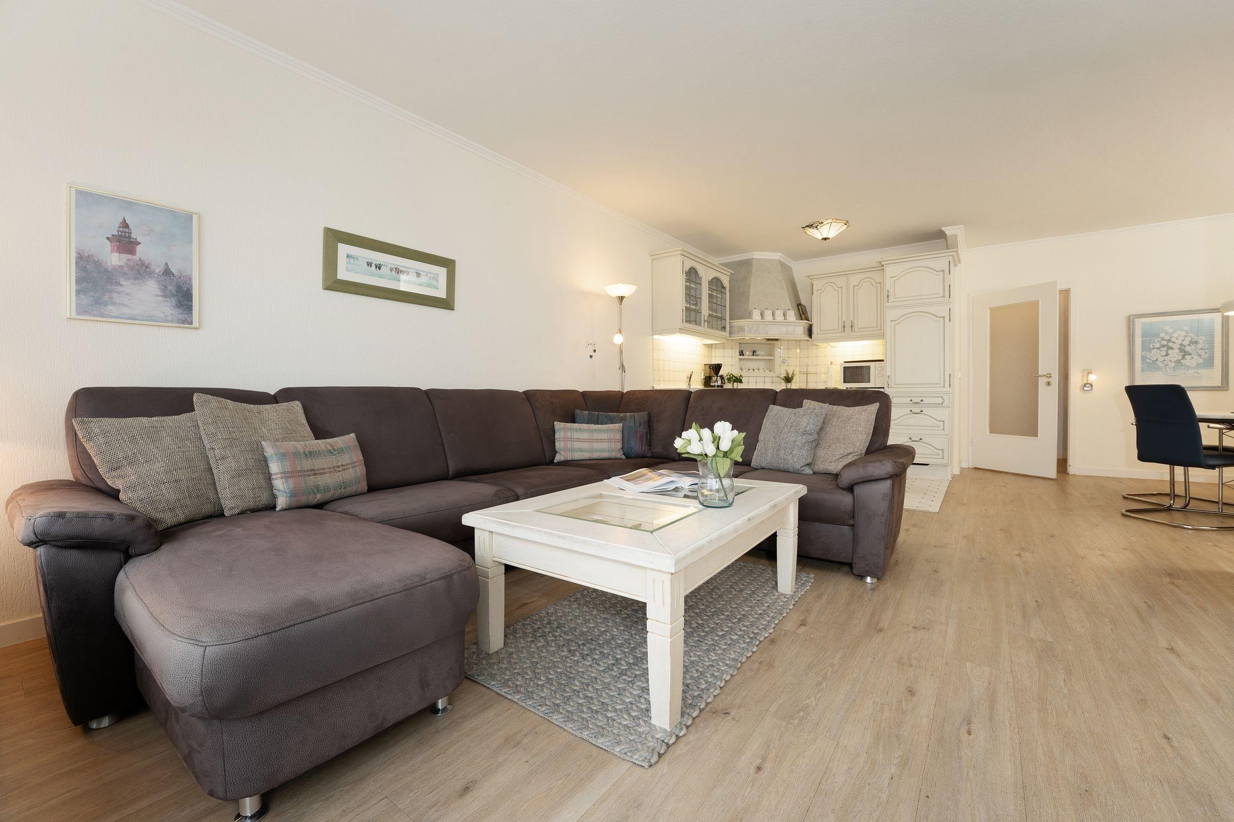Vom Eingangsbereich aus gelangen Sie in Ihre Dusche mit WC und Ihr gemütlich eingerichtetes Wohn-, Esszimmer mit schicker, voll ausgestatteter Küchenzeile. Hier wurde ein komplett neuer, heller Vinylfußboden verlegt und ein neues gemütliches Sofa lädt Sie zum Relaxen ein. Vom Wohnbereich gelangen Sie direkt in Ihr Schlafzimmer mit zwei Einzelbetten (je 90 cm breit). Ebenso gelangen sie von dort aus auf Ihren großzügigen Balkon. Von Ihrem großen Balkon, der mit entsprechenden Möbeln ausgestattet ist, schauen Sie auf das bunte Treiben in Grömitz.