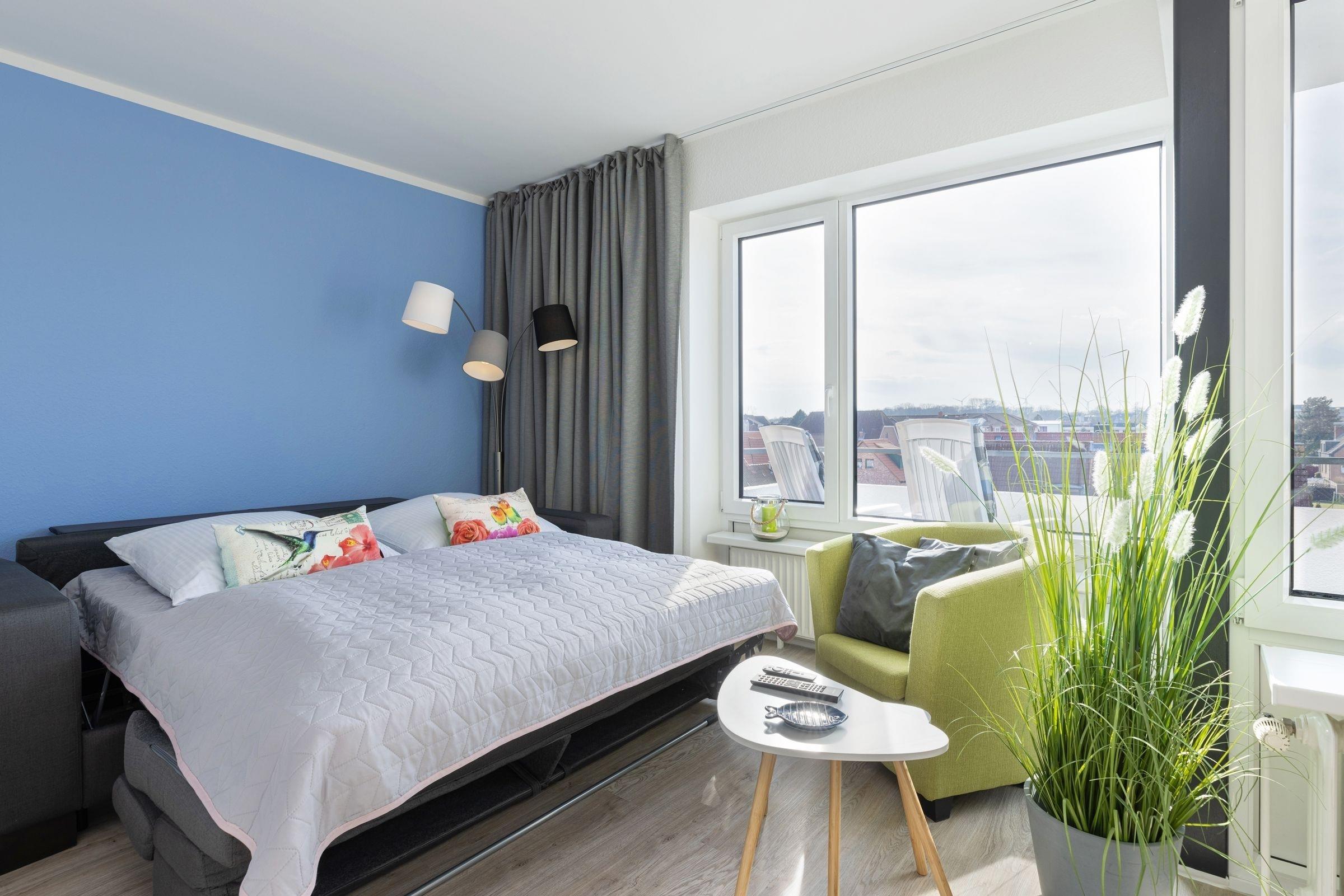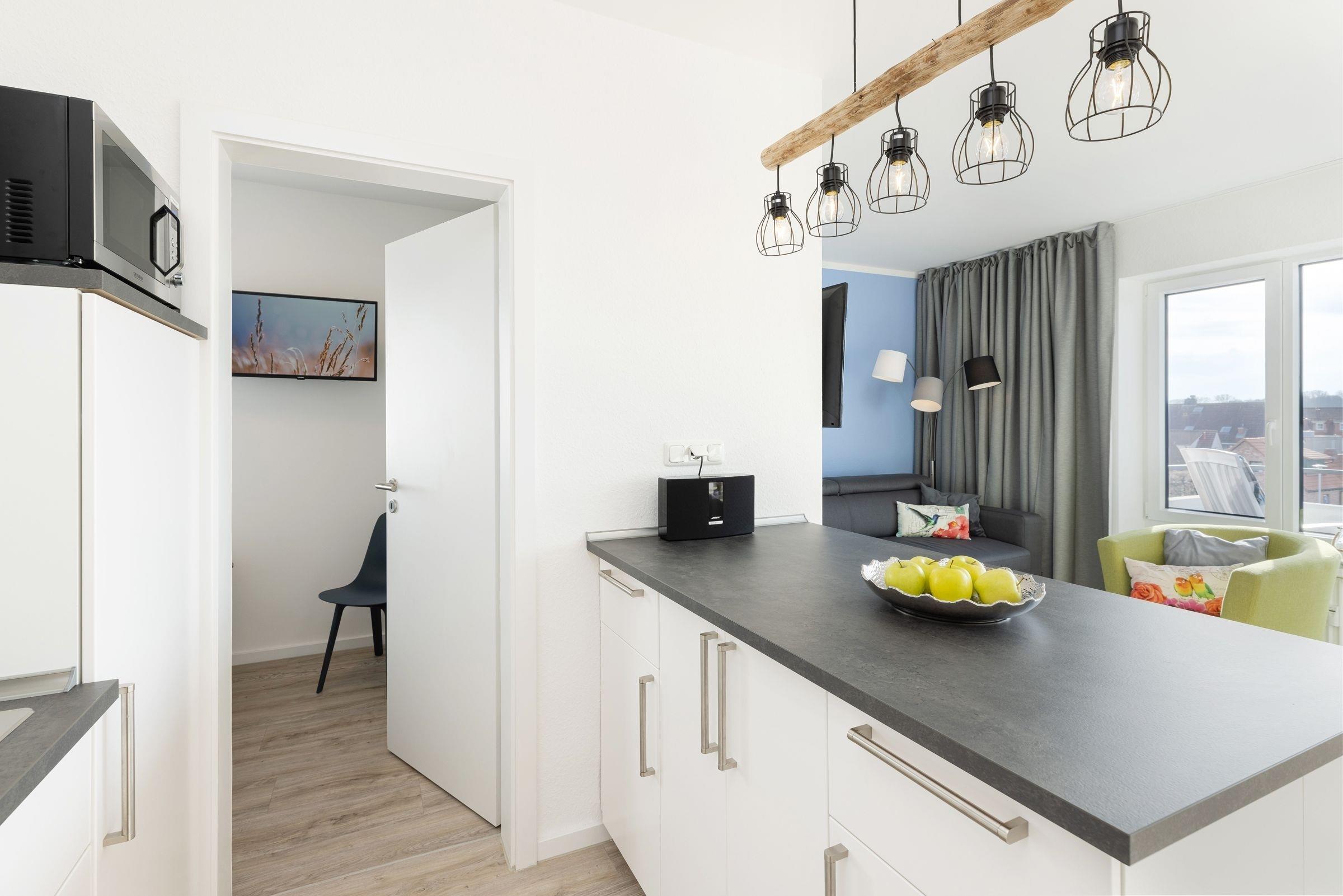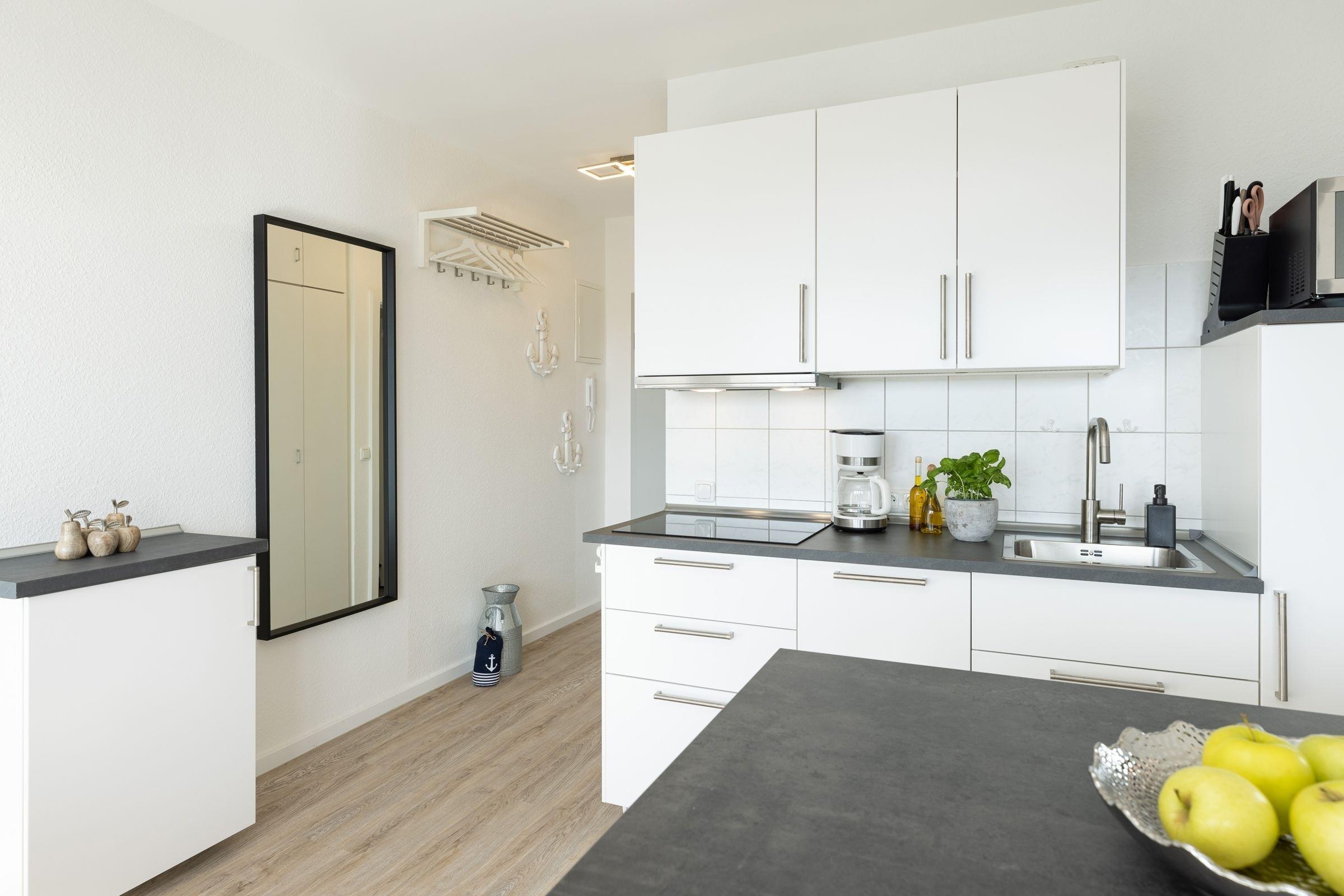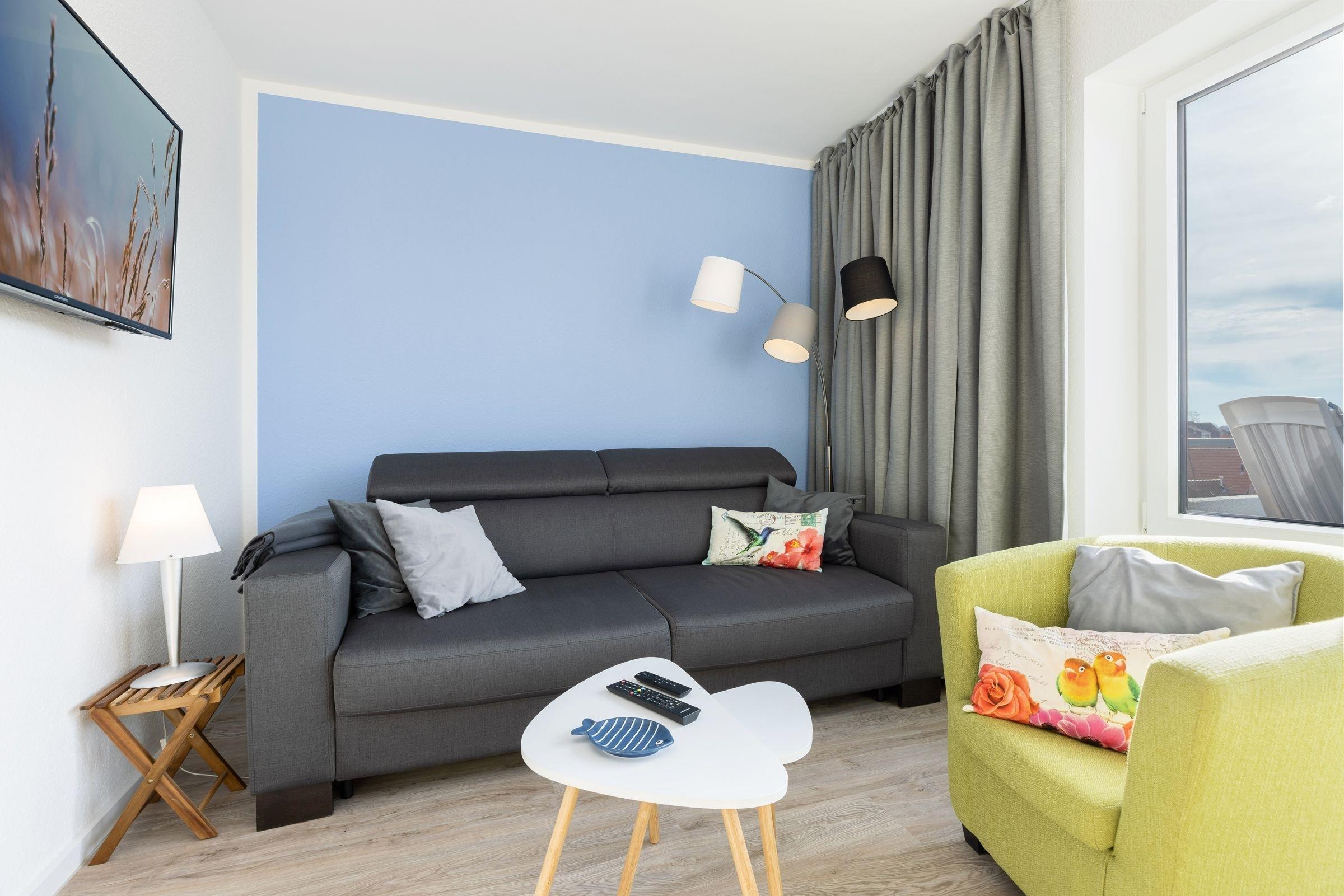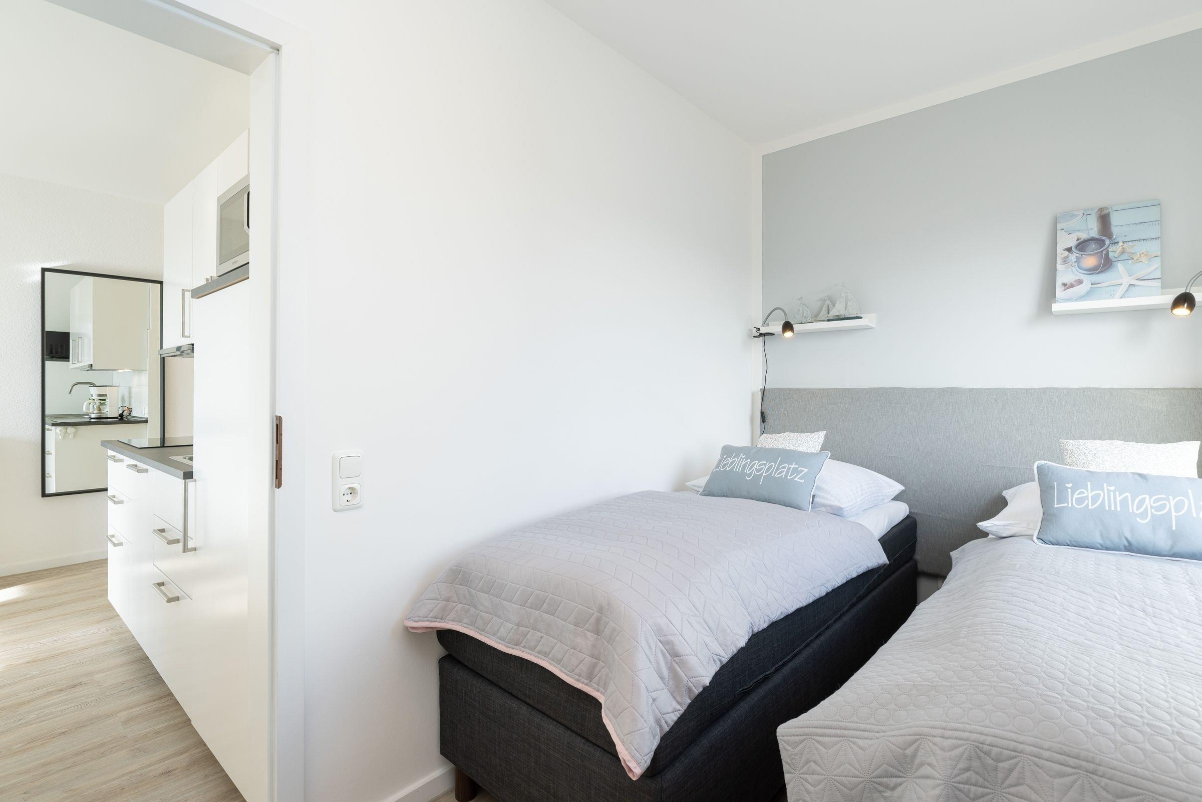 Die Wohnung bietet ihren Gästen einen geräumigen Wohnraum mit offener Küche und Zugang zum Balkon. Ein komfortables Schlafsofa -Prädikat Dauerschläfer- (160x192 cm) dient im Wohnbereich bei einer Belegung mit mehr als zwei Personen als Schlafmöglichkeit, ihre Urlaubsgarderobe können Sie im Sideboard verstauen. Der Flachbildschirm lässt sich sowohl zum Schlafsofa als auch zum runden Esstisch hin schwenken. In der zum Wohnraum offenen Küche sind z. B. Geschirrspüler, Herd mit Induktionskochfeld, Mikrowelle mit Backofenfunktion (Kombigerät), Kühlschrank mit Gefrierfach und Kaffeemaschine vorhanden. Das separate Schlafzimmer liegt nebenan und lädt mit seinen zwei Boxspringbetten (2x 80x200 cm) zum Träumen ein. Diese können bei Bedarf auch zusammengeschoben werden. Ein Flachbild-TV mit integriertem DVD-Player und Radio-Empfang sorgt für Unterhaltung. Das innenliegende Badezimmer ist funktional eingerichtet und verfügt über eine Dusche und ein WC. Auf dem möblierten West-Balkon genießen Sie die Sonne ab mittags bis in den Abend hinein. Lassen Sie Ihren Urlaubstag bei atemberaubenden Sonnenuntergängen ausklingen.