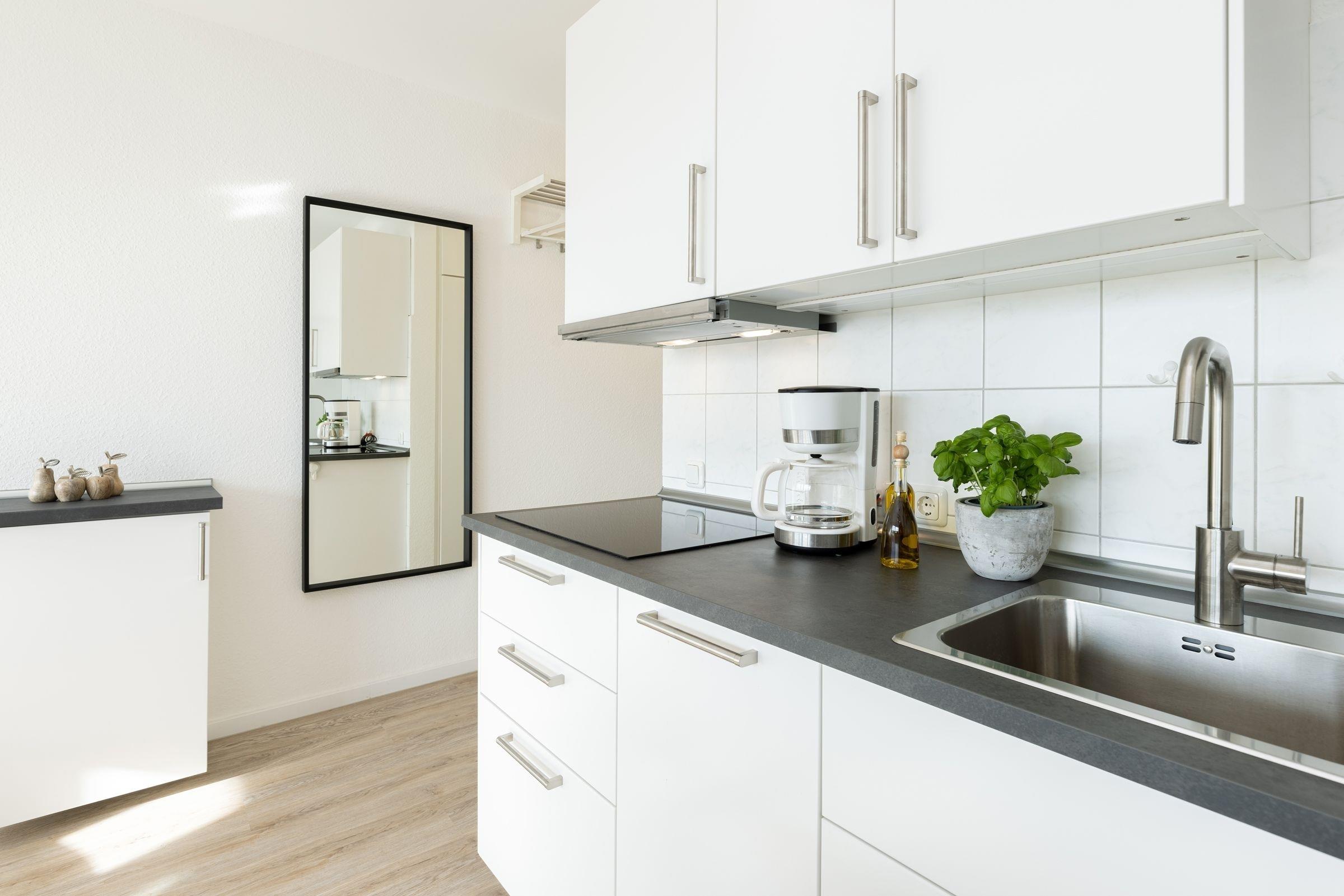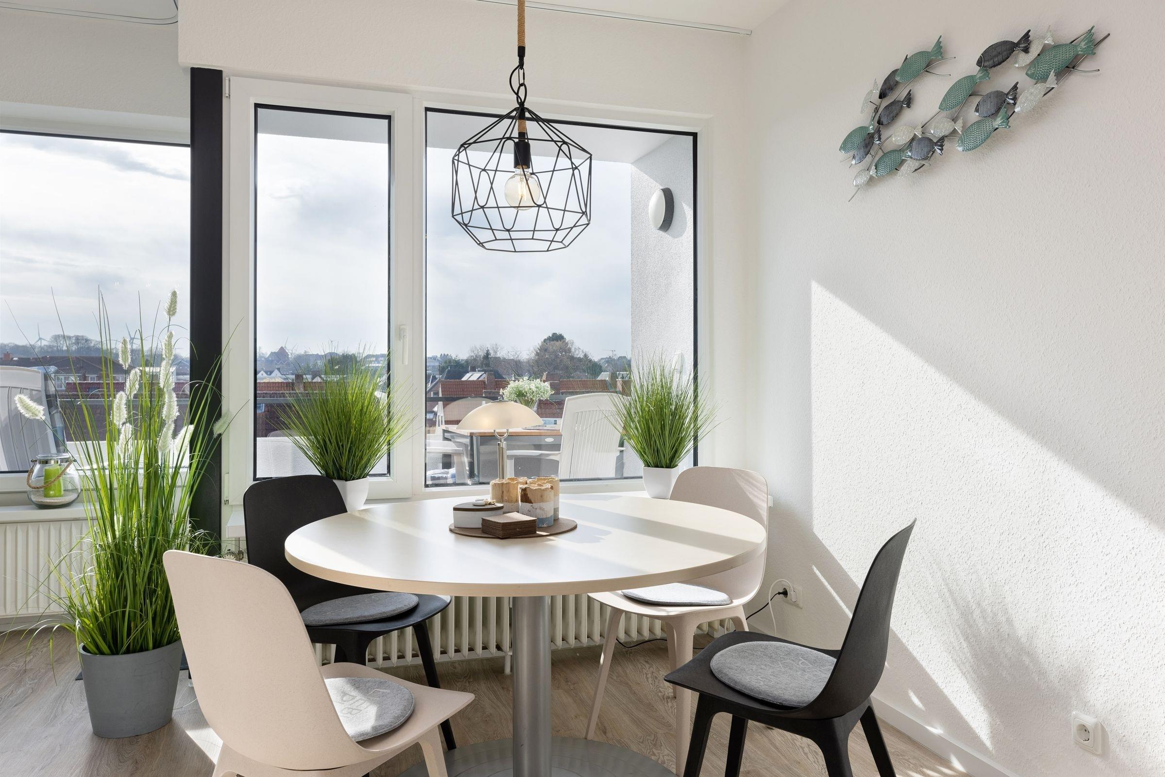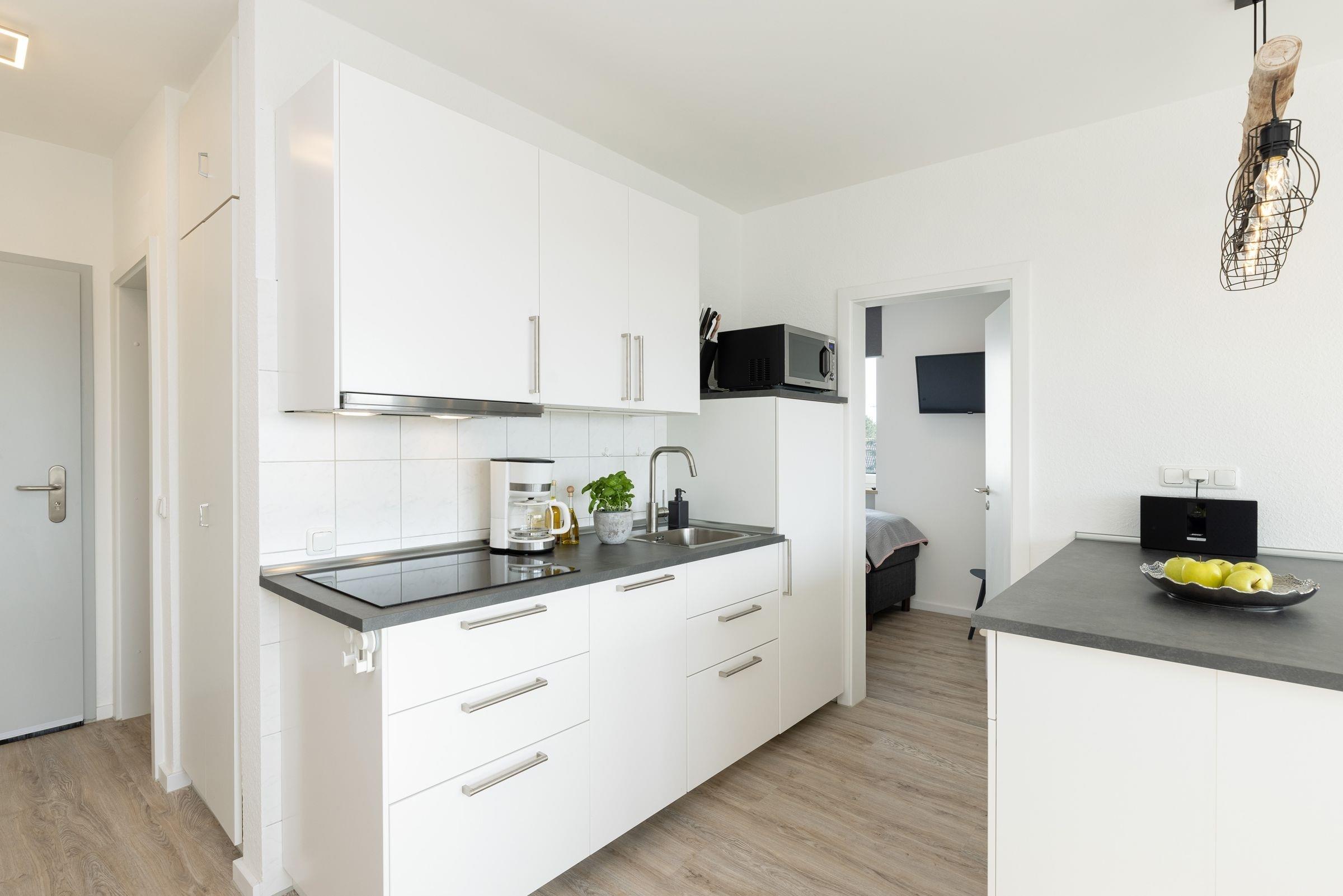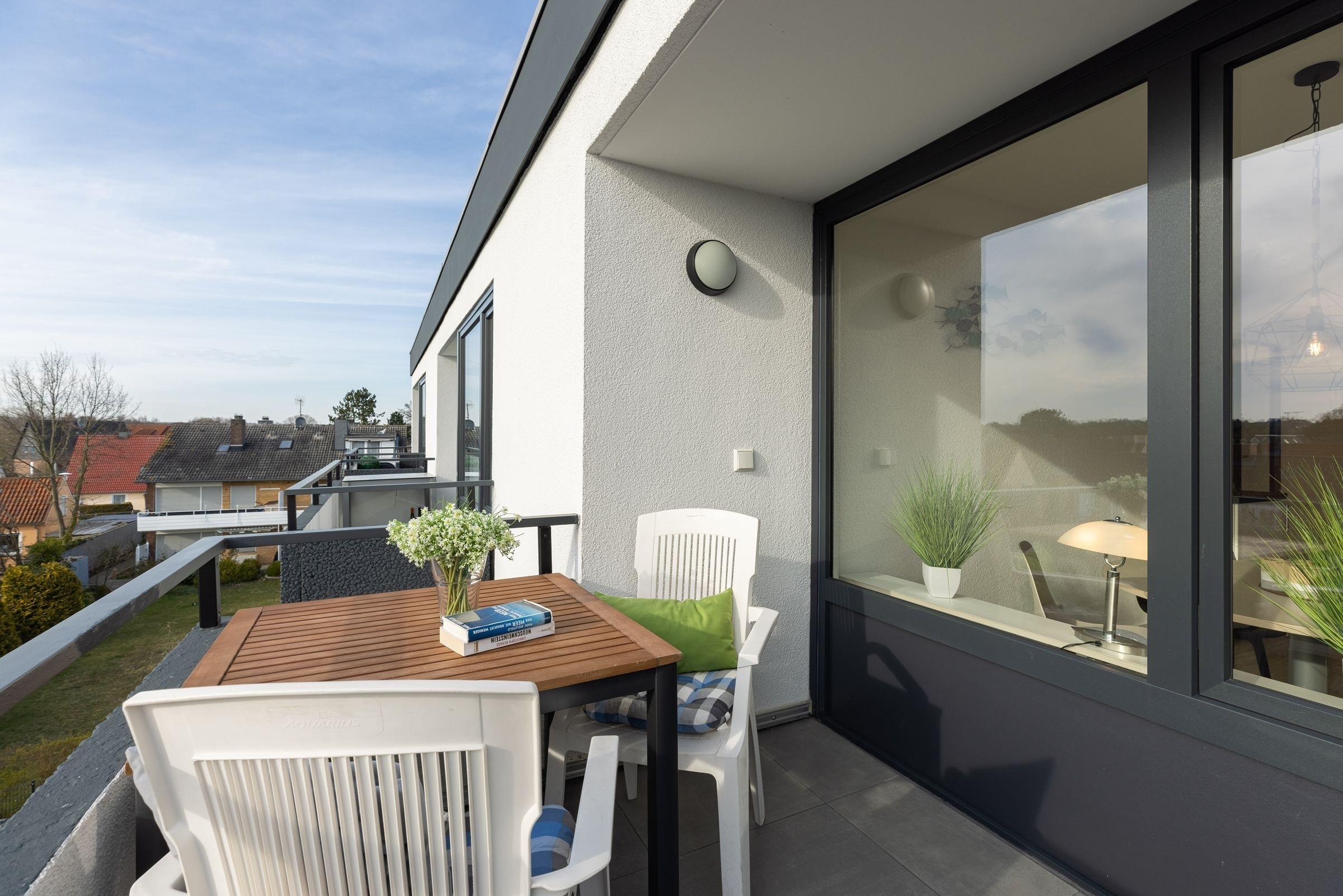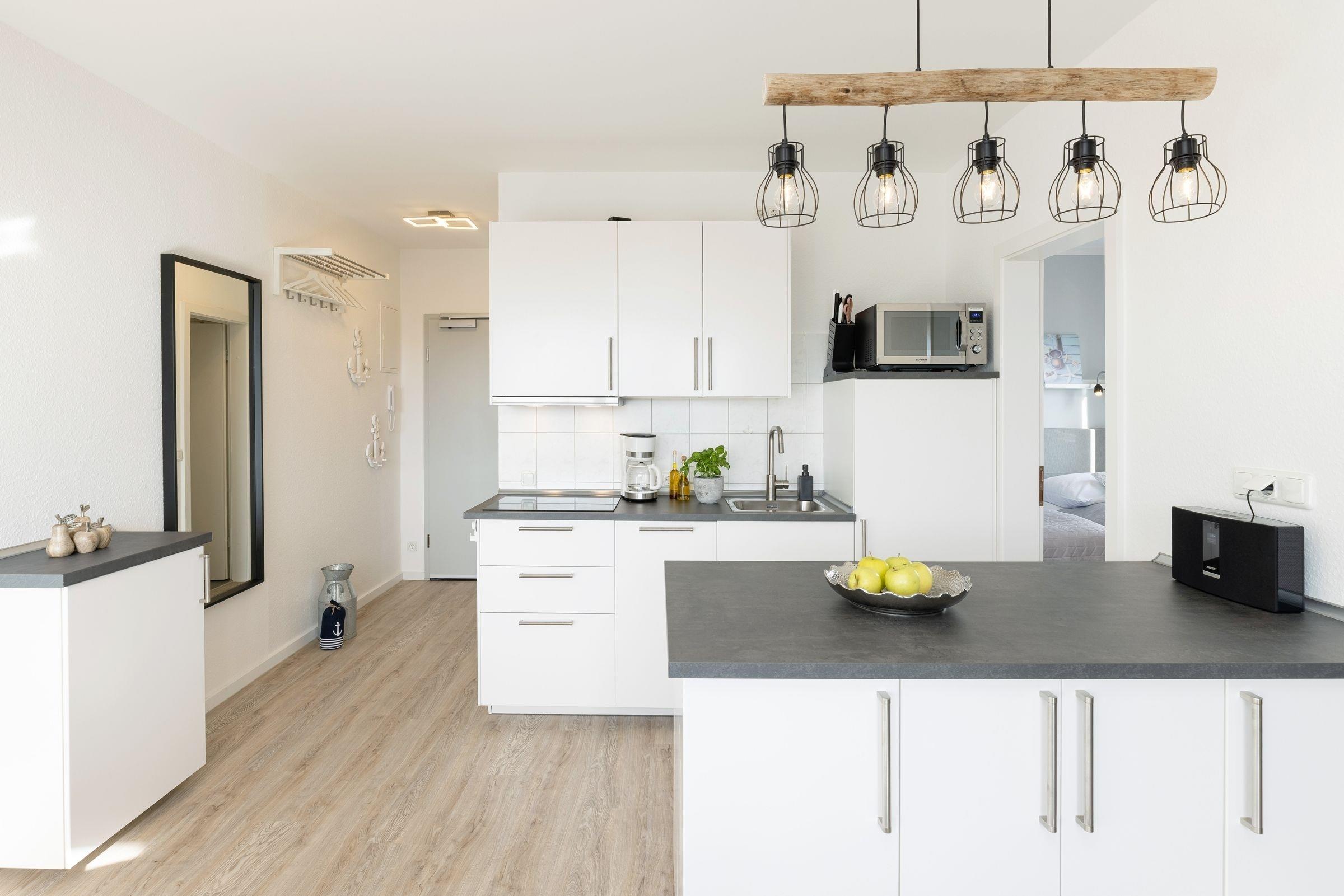 Die Wohnung bietet ihren Gästen einen geräumigen Wohnraum mit offener Küche und Zugang zum Balkon. Ein komfortables Schlafsofa -Prädikat Dauerschläfer- (160x192 cm) dient im Wohnbereich bei einer Belegung mit mehr als zwei Personen als Schlafmöglichkeit, ihre Urlaubsgarderobe können Sie im Sideboard verstauen. Der Flachbildschirm lässt sich sowohl zum Schlafsofa als auch zum runden Esstisch hin schwenken. In der zum Wohnraum offenen Küche sind z. B. Geschirrspüler, Herd mit Induktionskochfeld, Mikrowelle mit Backofenfunktion (Kombigerät), Kühlschrank mit Gefrierfach und Kaffeemaschine vorhanden. Das separate Schlafzimmer liegt nebenan und lädt mit seinen zwei Boxspringbetten (2x 80x200 cm) zum Träumen ein. Diese können bei Bedarf auch zusammengeschoben werden. Ein Flachbild-TV mit integriertem DVD-Player und Radio-Empfang sorgt für Unterhaltung. Das innenliegende Badezimmer ist funktional eingerichtet und verfügt über eine Dusche und ein WC. Auf dem möblierten West-Balkon genießen Sie die Sonne ab mittags bis in den Abend hinein. Lassen Sie Ihren Urlaubstag bei atemberaubenden Sonnenuntergängen ausklingen.