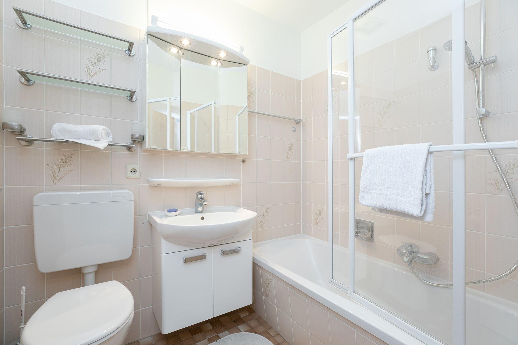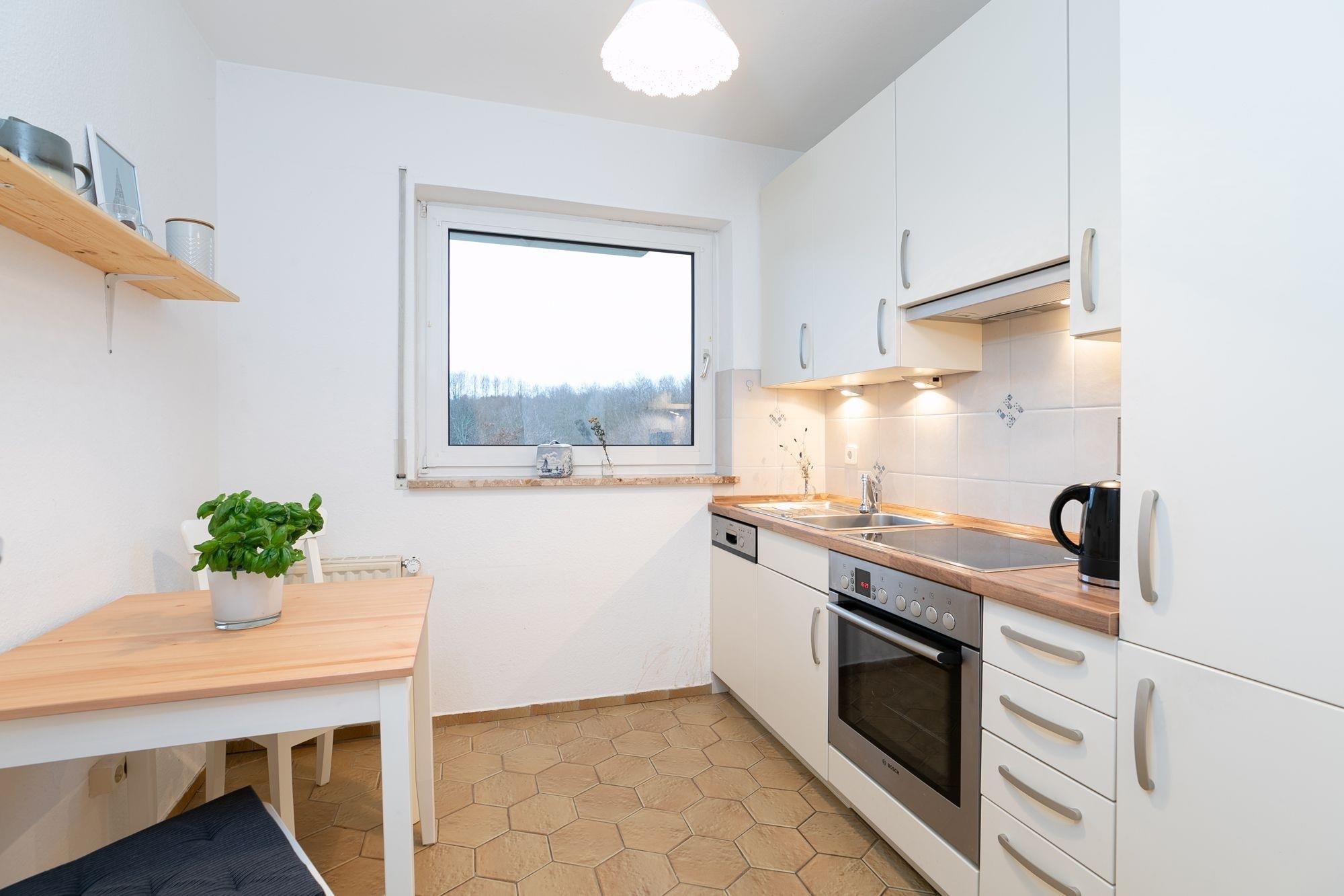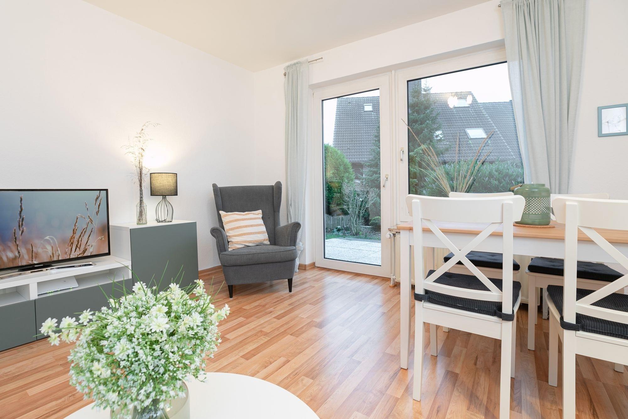 Der moderne Wohnbereich im nordischen Stil überzeugt mit schlichter Eleganz. Relaxen und kuscheln Sie auf dem gemütlichen Sofa vor dem Fernseher oder essen und spielen Sie gemeinsam am geräumigen Esstisch. Über den kostenlosen WLAN-Anschluss bleiben Sie erreichbar und mit Ihren Lieben daheim verbunden. Zur Nacht haben Sie bei Bedarf die Möglichkeit die Eckcouch in einen komfortablen Schlafplatz für einen 5. Reisegast zu verwandeln (140x200 cm). Zu einem Urlaub gehört auch gutes Essen - in der separaten Küche finden Sie alles, um sich und Ihre Lieben kulinarisch zu verwöhnen. Nach einem ereignisreichen Tag können Sie dann in zwei separaten Schlafzimmern die Seele baumeln lassen und neue Energie tanken. In beiden Schlafzimmern bieten Kleiderschränke ausreichend Stauraum für Ihre Urlaubsgarderobe. Für eine angenehme Nachtruhe sorgen entweder ein bequemes Doppelbett (160x200 cm)oder zwei Einzelbetten (je 90x200 cm). Ein Badezimmer mit Badewanne und Duschwand rundet die Ausstattung dieser Ferienwohnung ab. Nutzen Sie die möblierte Terrasse für ein ausgiebiges Frühstück bei Sonnenschein oder für entspannte Stunden bei einem guten Glas Wein. Der Ausblick in den zum Haus gehörenden Garten sorgt für Entspannung.