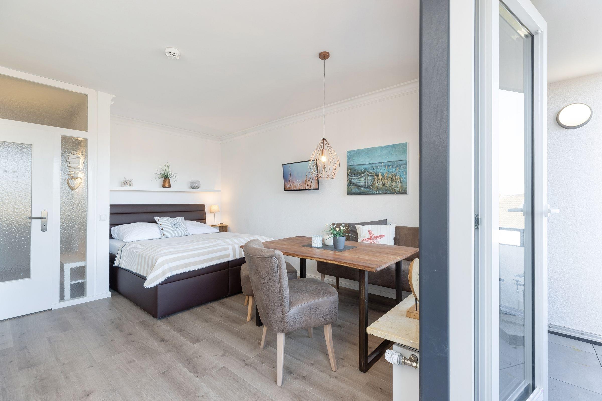 Diese stilvoll eingerichtete 1-Zimmer-Ferienwohnung mit Balkon empfängt auf einer Wohnfläche von ca. 31 m² bis zu 2 Erwachsene und 1 Kind. Die Wohnung befindet sich in der 2. Etage und ist bequem mit dem Fahrstuhl erreichbar.