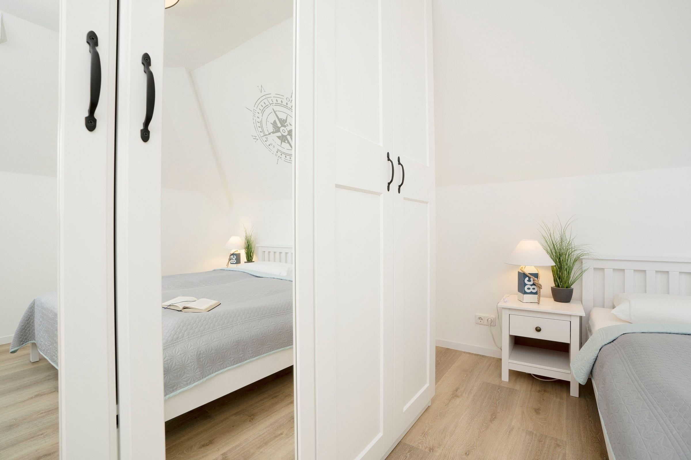 Schlafzimmer 2: 2 Einzelbetten (2x90x200 cm), Kleiderschrank, Verdunkelung (Plissees+ Raffrollos), Platz für Babybett, TV