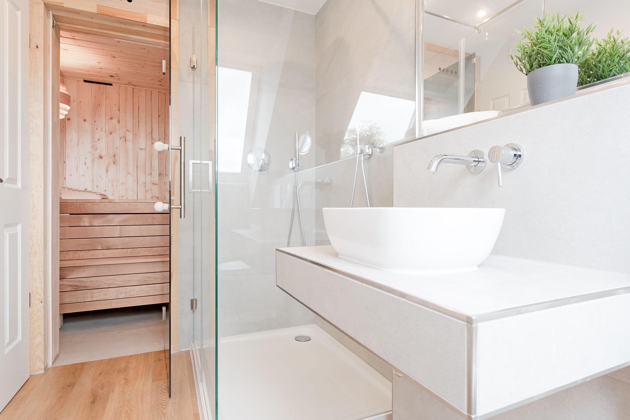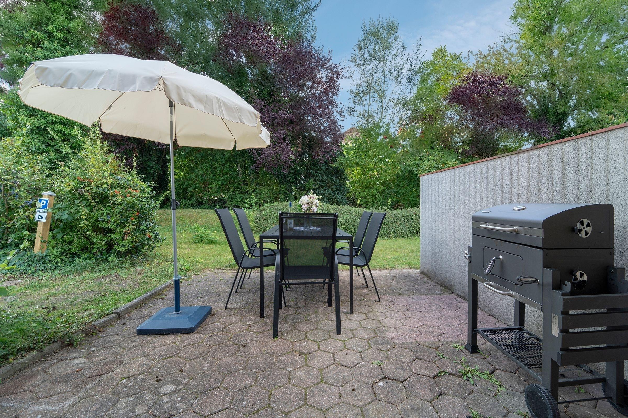 Der Wohn-/Essbereich mit offener Küche lädt zum gemeinsamen Essen, Fernsehen und erholsamen Urlaubsstunden ein. In der offenen voll ausgestatteten Küche finden Sie alles, um sich und Ihre Lieben kulinarisch zu verwöhnen. Vom Wohnbereich gelangen Sie auf die Terrasse mit Gartenmöbel, der perfekte Ort, um einen ereignisreichen Urlaubstag bei einem Glas Wein ausklingen zu lassen. Das angrenzende Gartenstück wird gemeinschaftlich von allen Bewohnern der Anlage genutzt. Drei Schlafzimmer und zwei moderne Bäder, befinden sich in der 1. Etage. Zwei Schlafzimmer sind jeweils mit einem Doppelbett (2x 90x200 cm) und Kleiderschrank ausgestattet. Das dritte Schlafzimmer verfügt über ein Einzelbett (90x200 cm). Die modernen und hell gefliesten Badezimmer, wovon eins mit einer Sauna ausgestattet ist, runden diese Ferienwohnung mit Dusche (Schwelle nur 2cm) und Fußbodenheizung ab.