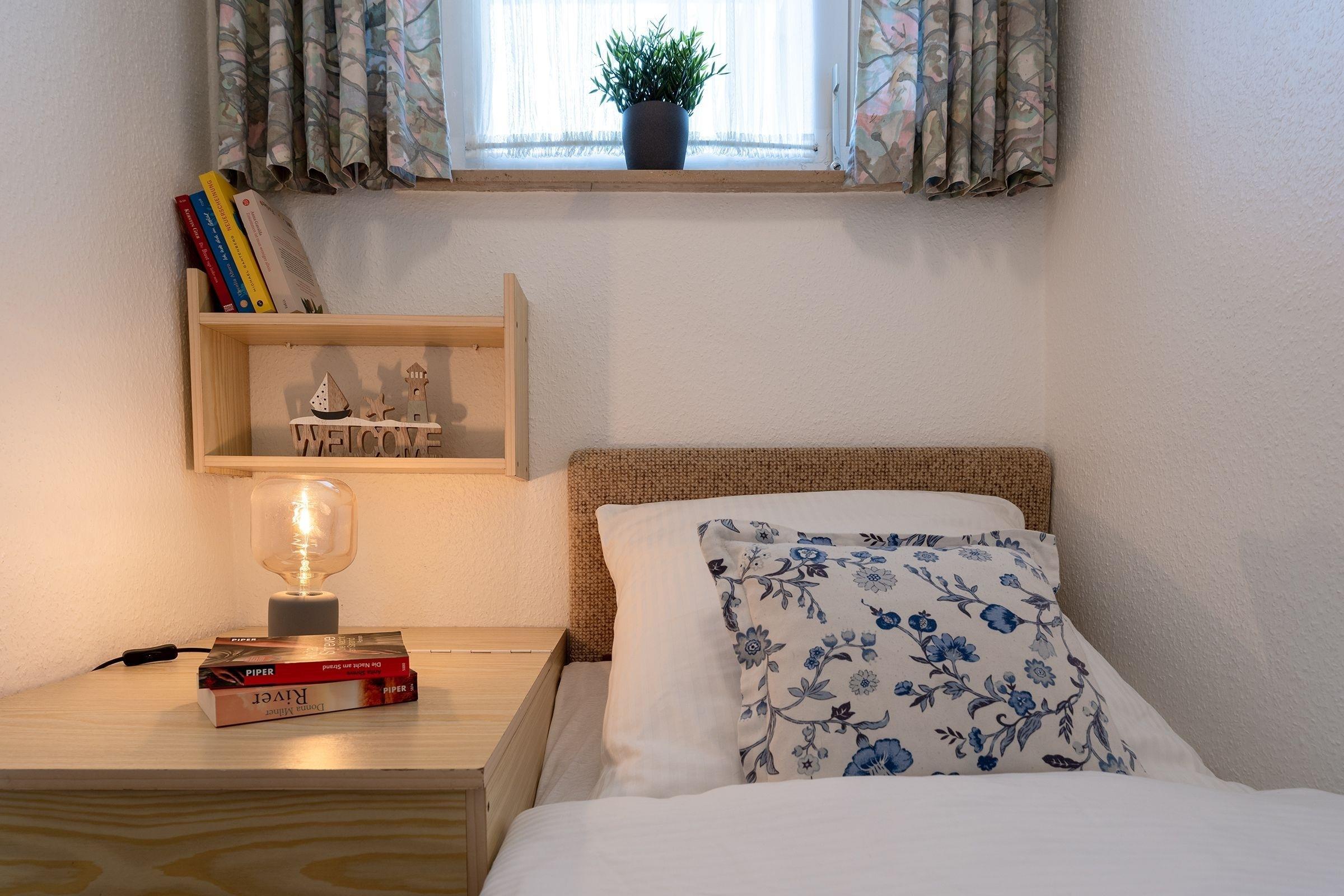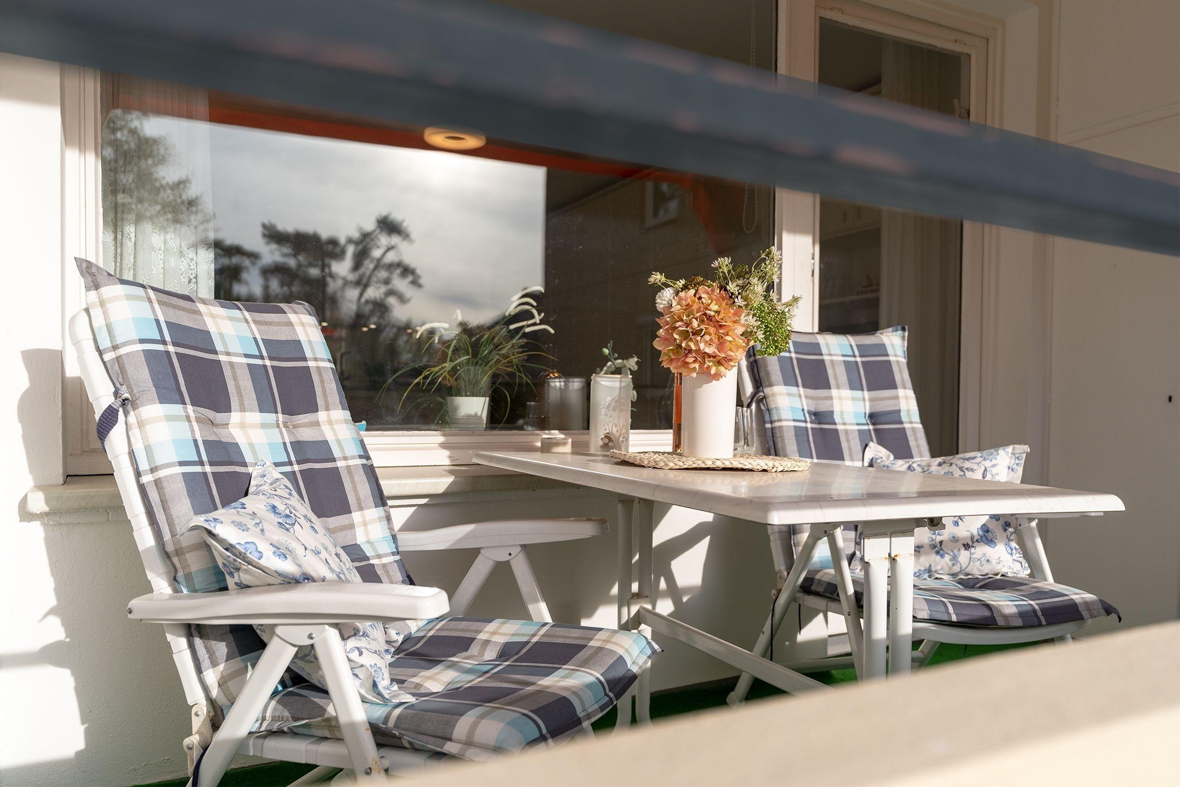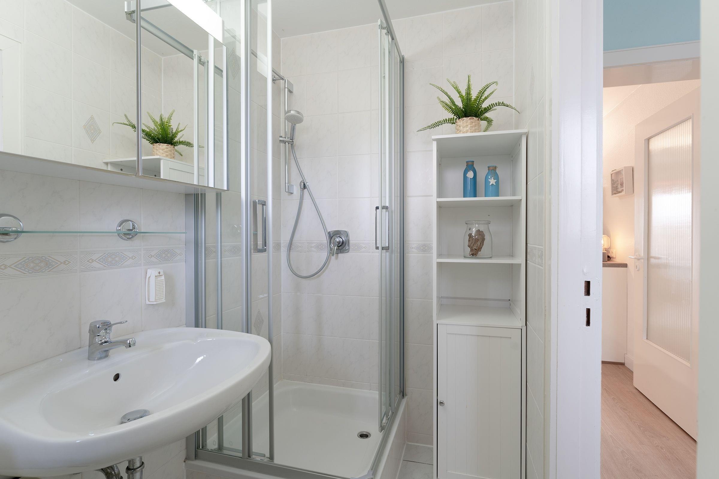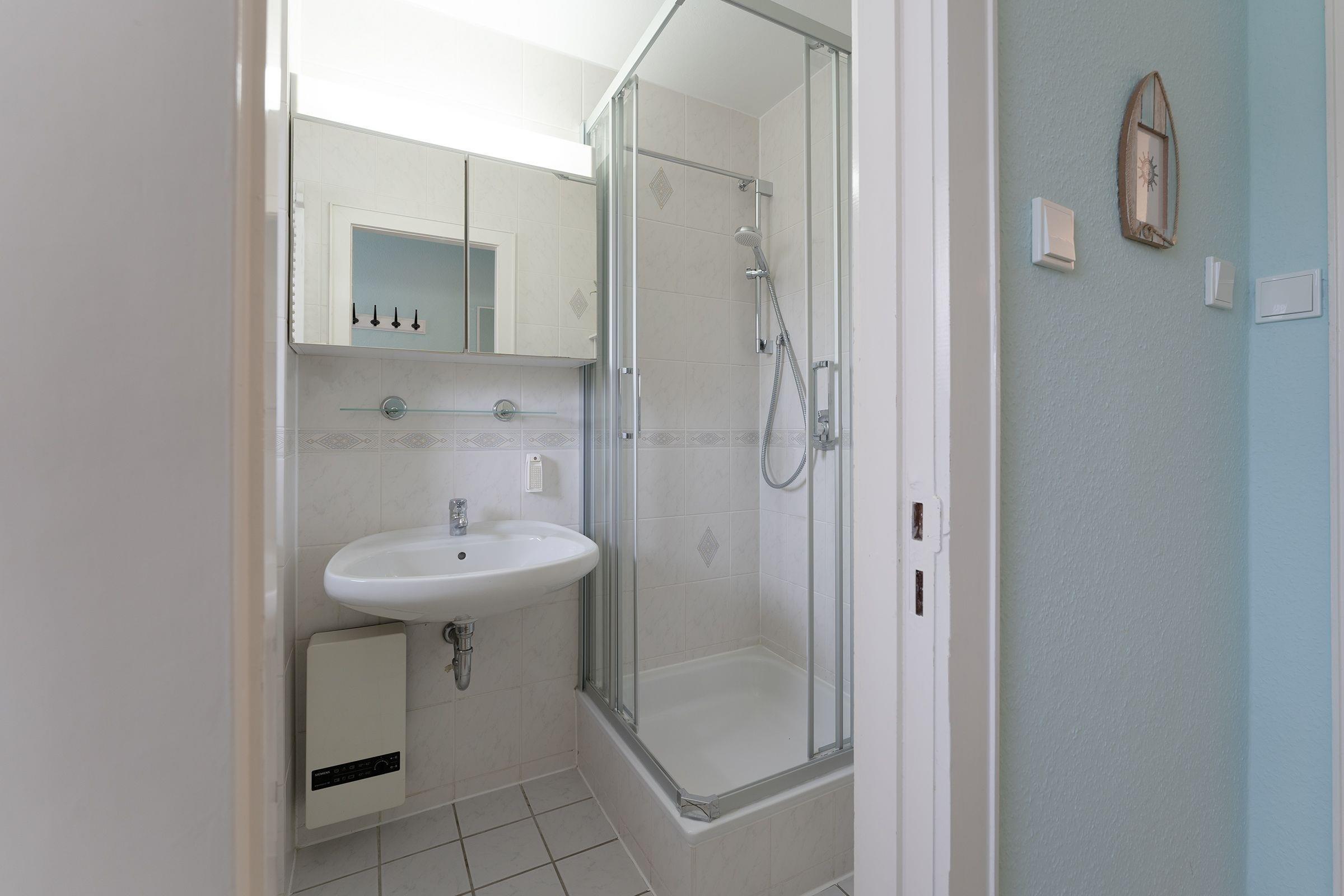 Der offen gestaltete Wohnraum bietet Ihnen neben einem gemütlichen Sofa zwei der drei Schlafplätze durch ein platzsparendes Schrankbett (2x 100x200 cm). Das angrenzende Schlafzimmer verfügt über ein ausklappbares Einzelbett (80x190 cm) für den dritten mitreisenden Gast. Mit der modernen Küche mit Induktionsherd sind Sie bestens gewappnet, wenn Sie sich selbst verpflegen wollen. Für einen gelungenen Start in den Tag bietet diese Wohnung ein Tageslichtbad mit Duschkabine und beheizbarem Handtuchhalter. Wenn Sie am Nachmittag vom nur 50m entfernten Strand zurück kommen, können Sie die Nachmittagssonne auf dem überdachten Balkon mit Markise genießen.