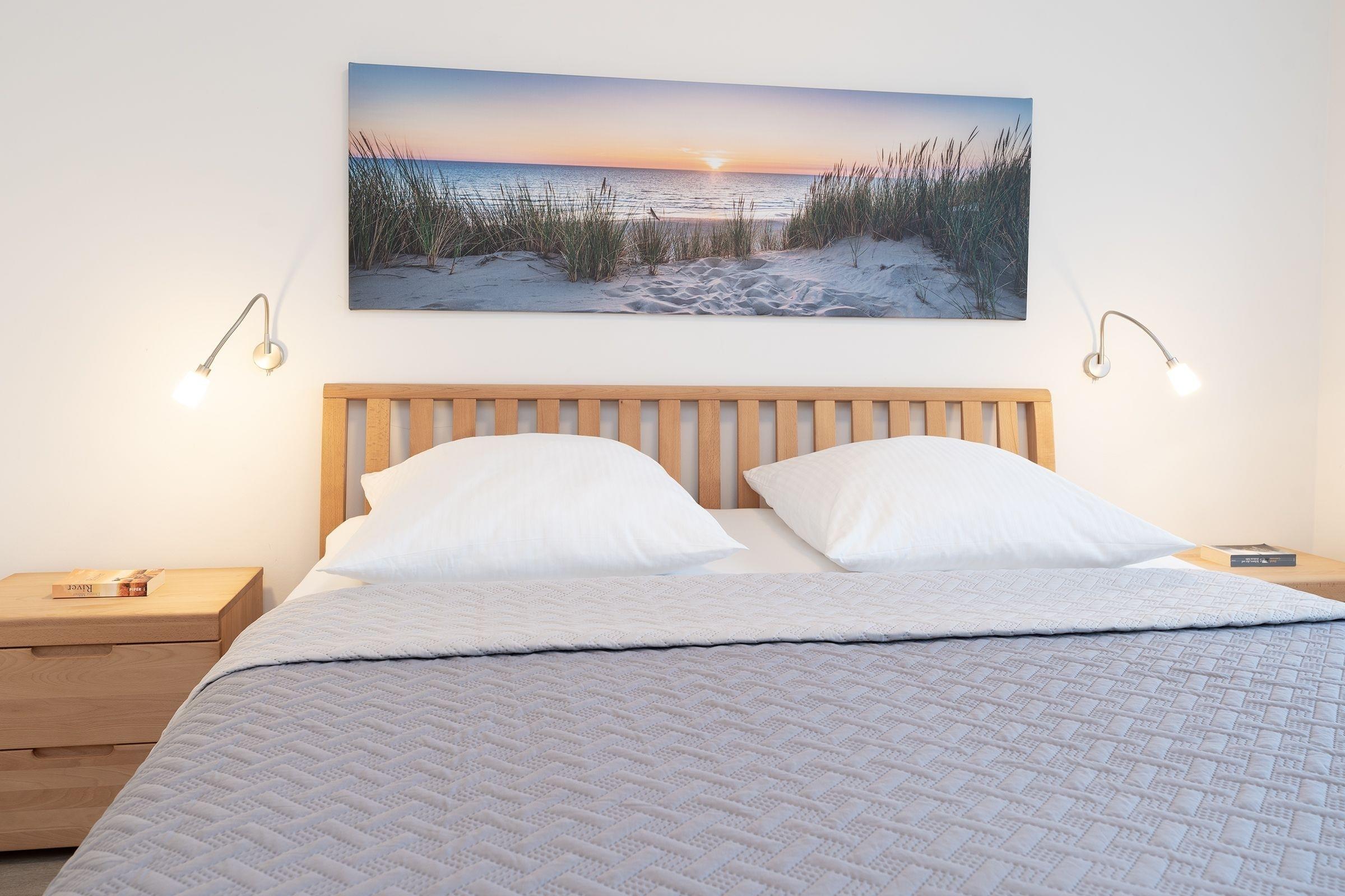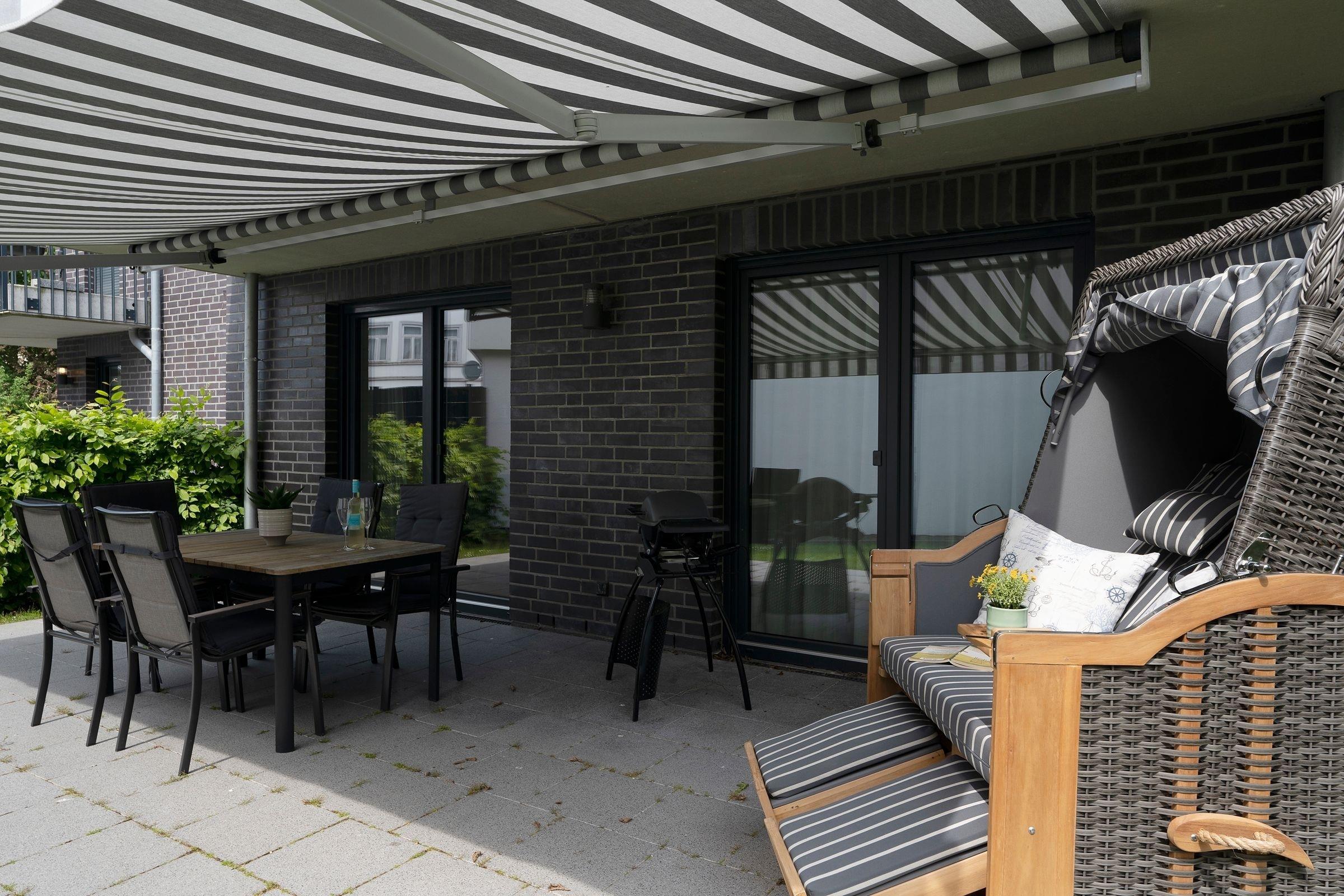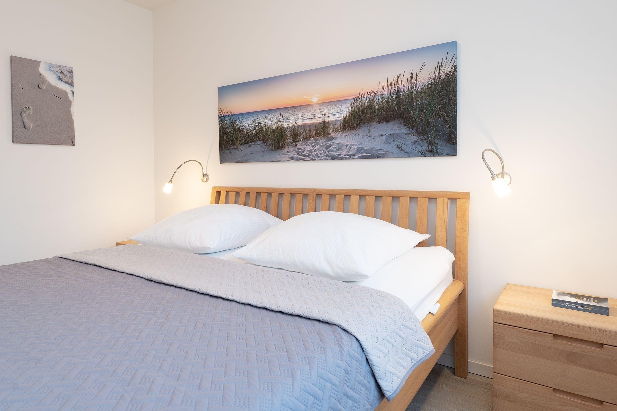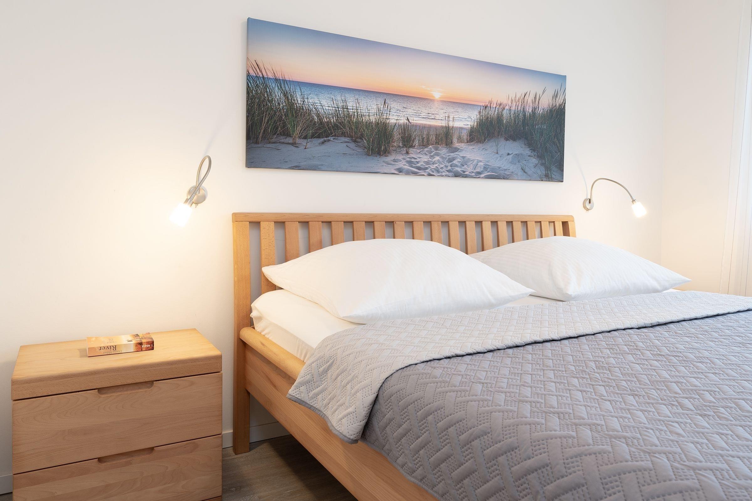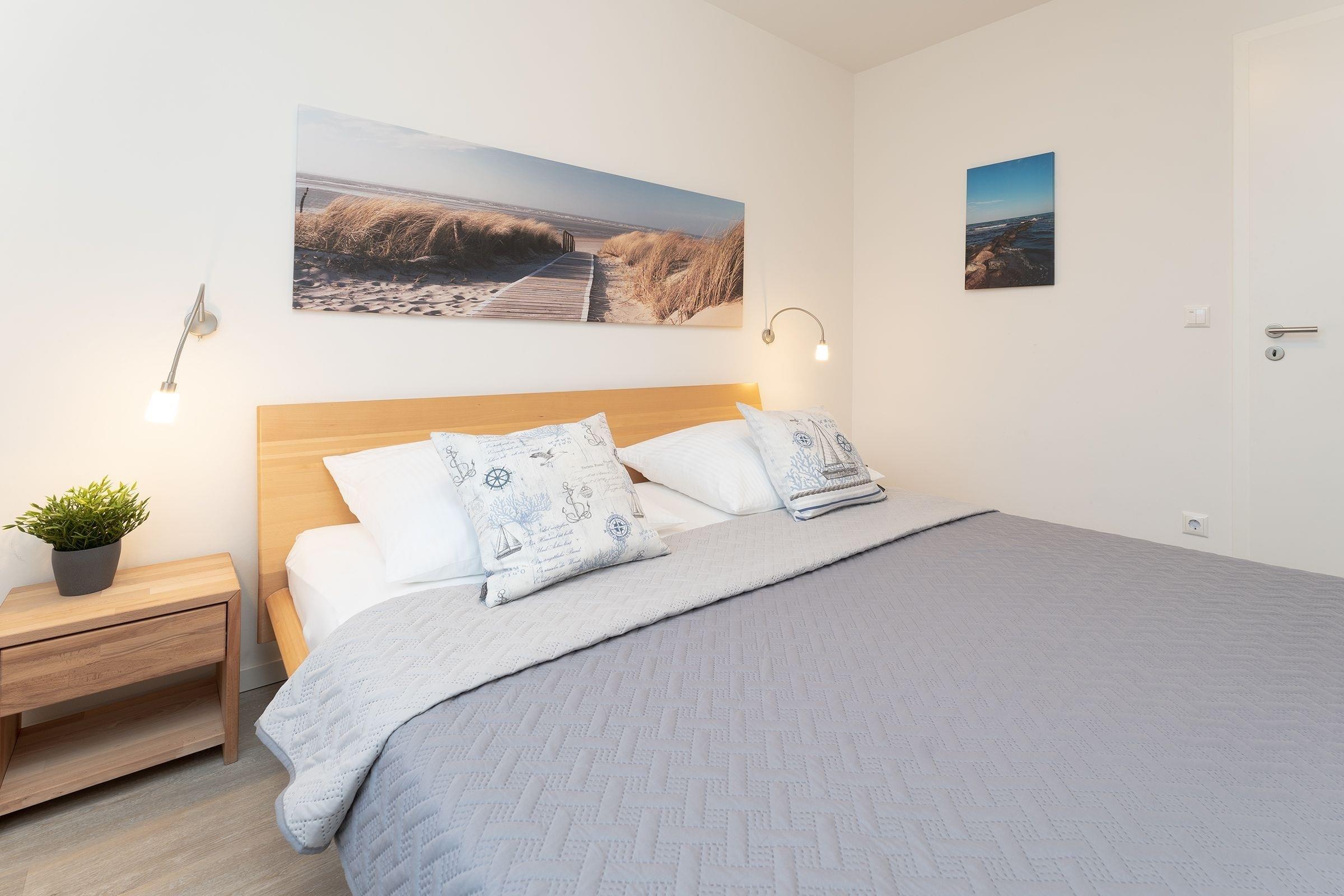 Ein offen und modern gestalteter Wohnbereich bildet das Zentrum Ihres Urlaubsreiches. Von dort aus gelangen Sie auf die Sonnenterrasse inklusive eigenem Strandkorb, Elektrogrill und großzügigem Garten. Das Wohnzimmer bietet mit HiFi - Anlage und Smart TV gute Unterhaltung, während in der offenen Wohnküche das Abendessen auf dem Induktionsherd köchelt. Das Schlafsofa lässt sich ausklappen und als Bett (150x200cm) für eine Einzelperson nutzen. Die weiteren Gäste verteilen sich auf die beiden Schlafzimmer, die jeweils über einen Kleiderschrank, elektrische Außenjalousien und ein großes Doppelbett (2x 90x200cm) verfügen. Als weitere Räume finden Sie hier einen Abstellraum, ein separates Gäste-WC, sowie das Tageslichtbad mit ebenerdiger Dusche und beheizbarem Handtuchhalter. Besonderen Komfort bietet die Fußbodenheizung in der gesamten Wohnung.