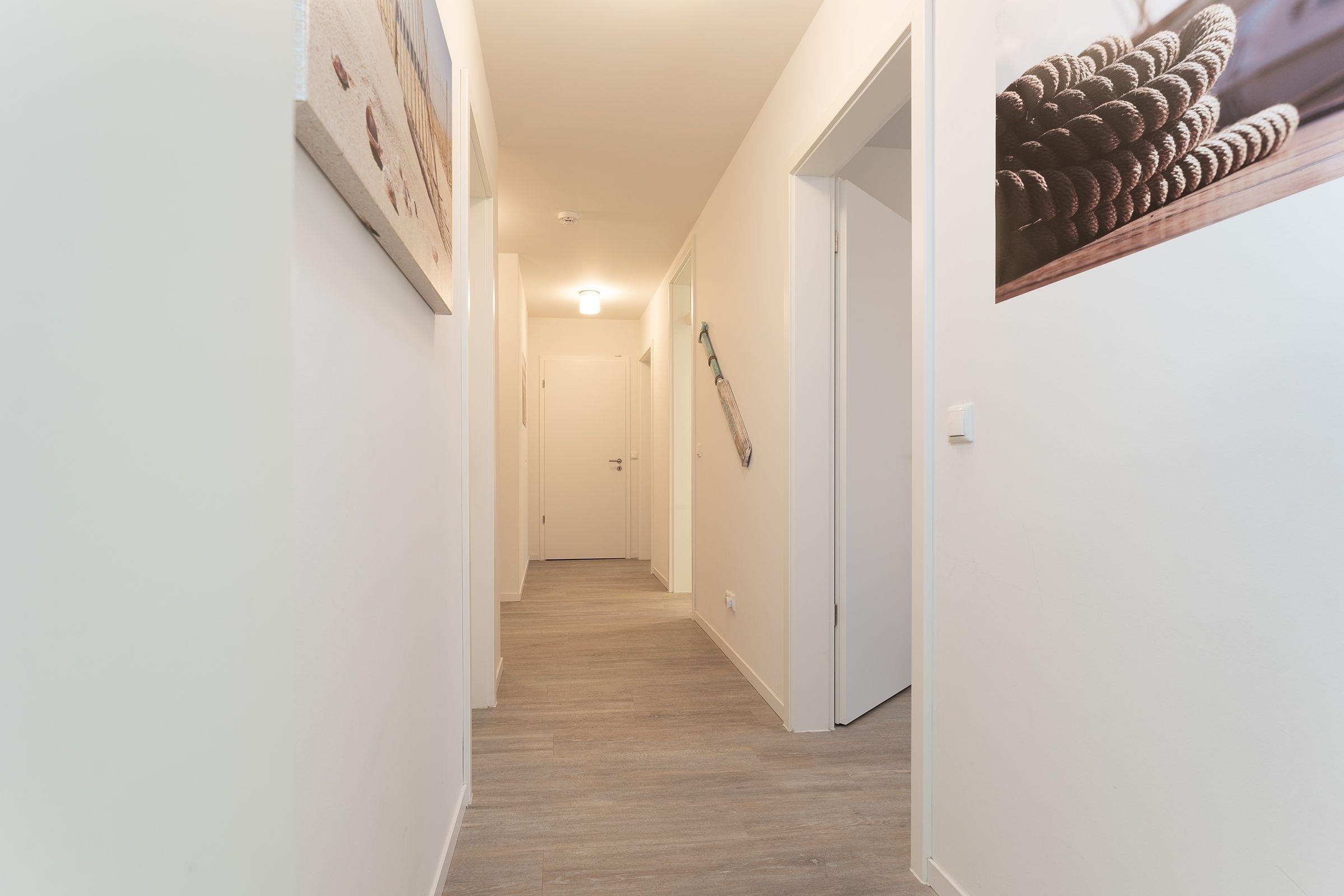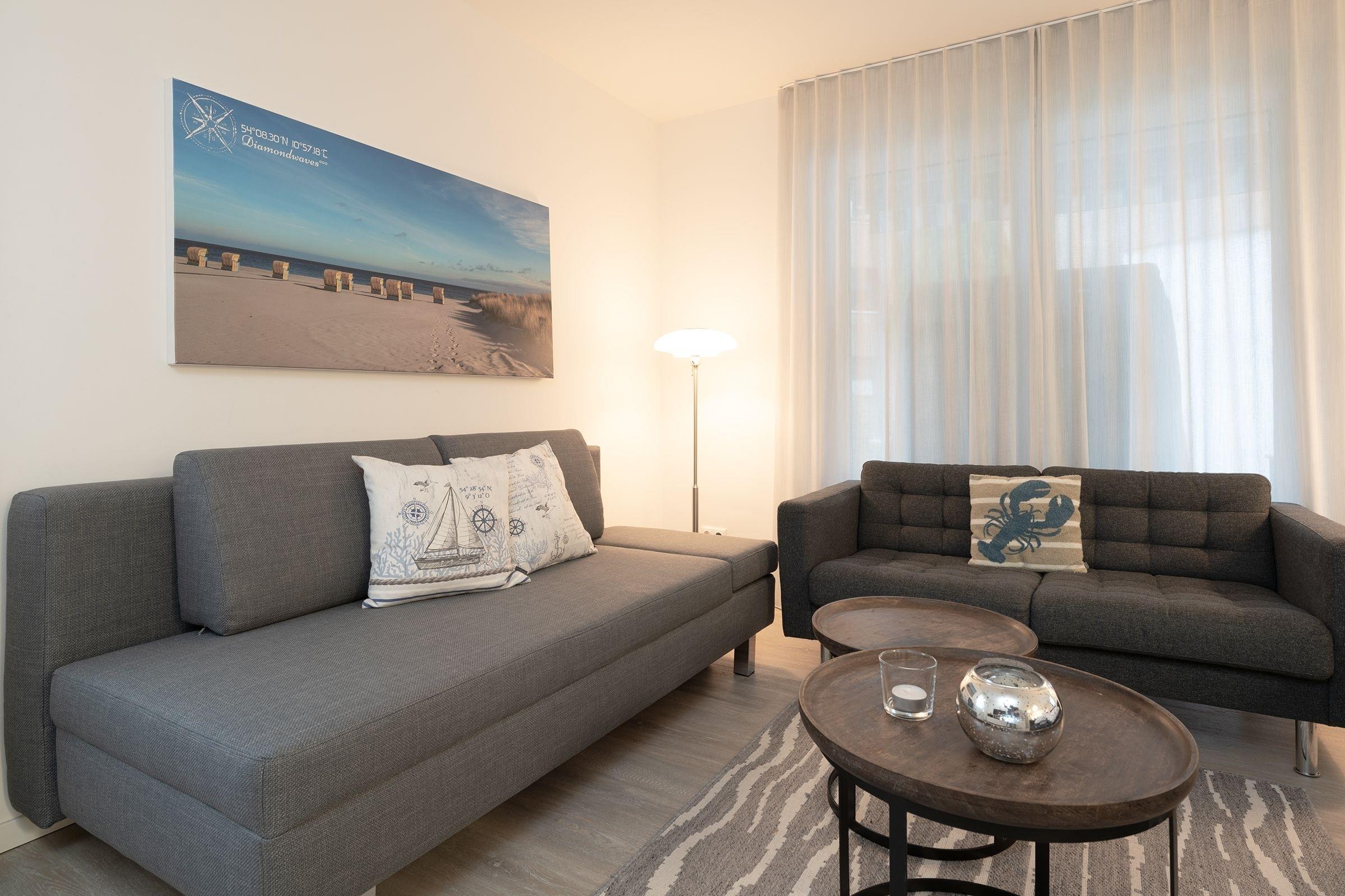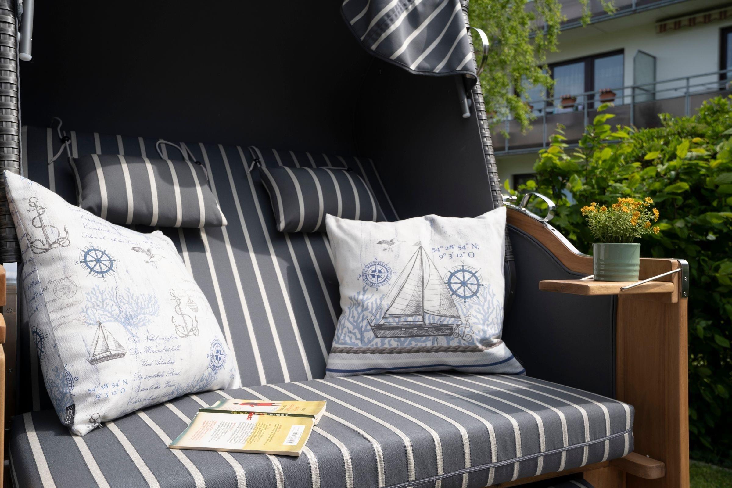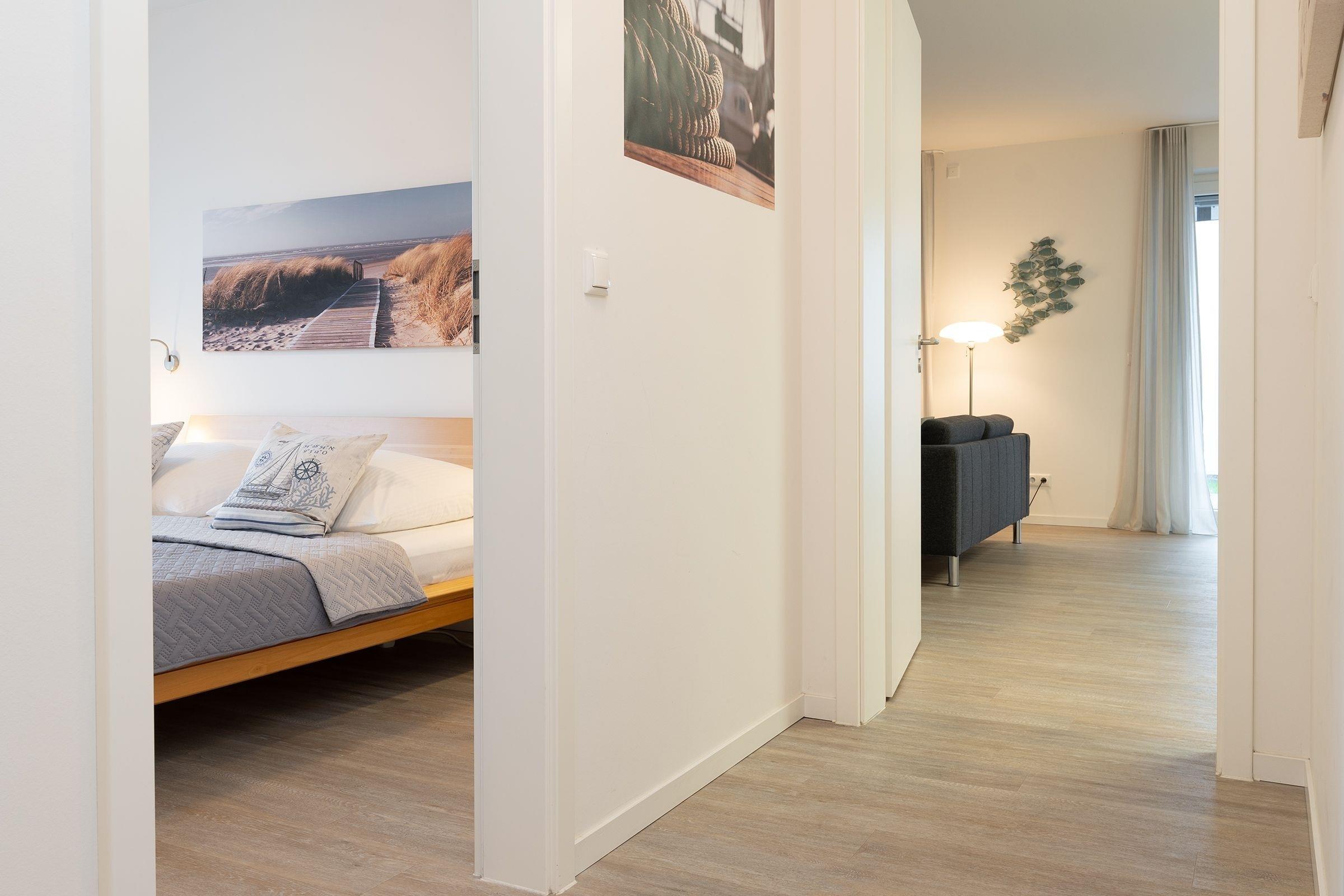Ein offen und modern gestalteter Wohnbereich bildet das Zentrum Ihres Urlaubsreiches. Von dort aus gelangen Sie auf die Sonnenterrasse inklusive eigenem Strandkorb, Elektrogrill und großzügigem Garten. Das Wohnzimmer bietet mit HiFi - Anlage und Smart TV gute Unterhaltung, während in der offenen Wohnküche das Abendessen auf dem Induktionsherd köchelt. Das Schlafsofa lässt sich ausklappen und als Bett (150x200cm) für eine Einzelperson nutzen. Die weiteren Gäste verteilen sich auf die beiden Schlafzimmer, die jeweils über einen Kleiderschrank, elektrische Außenjalousien und ein großes Doppelbett (2x 90x200cm) verfügen. Als weitere Räume finden Sie hier einen Abstellraum, ein separates Gäste-WC, sowie das Tageslichtbad mit ebenerdiger Dusche und beheizbarem Handtuchhalter. Besonderen Komfort bietet die Fußbodenheizung in der gesamten Wohnung.