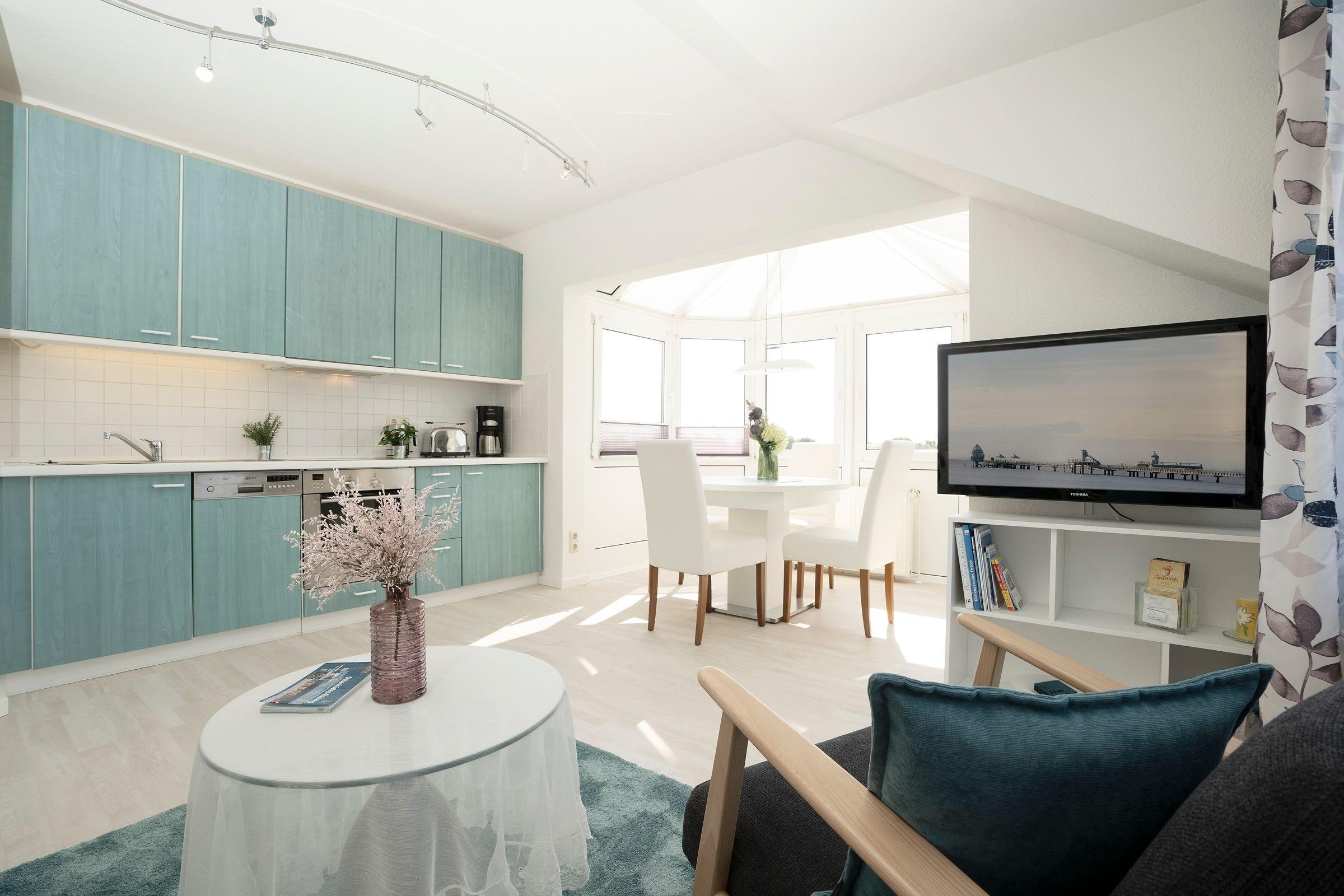 Freuen Sie sich auf diese charmante Dachgeschoss-Ferienwohnung im 2. OG der Grüntal Residenz in Grömitz, die mit ca. 49 m² verteilt auf 3 Zimmer ausreichend Platz für einen Aufenthalt mit bis zu 4 Personen bietet.