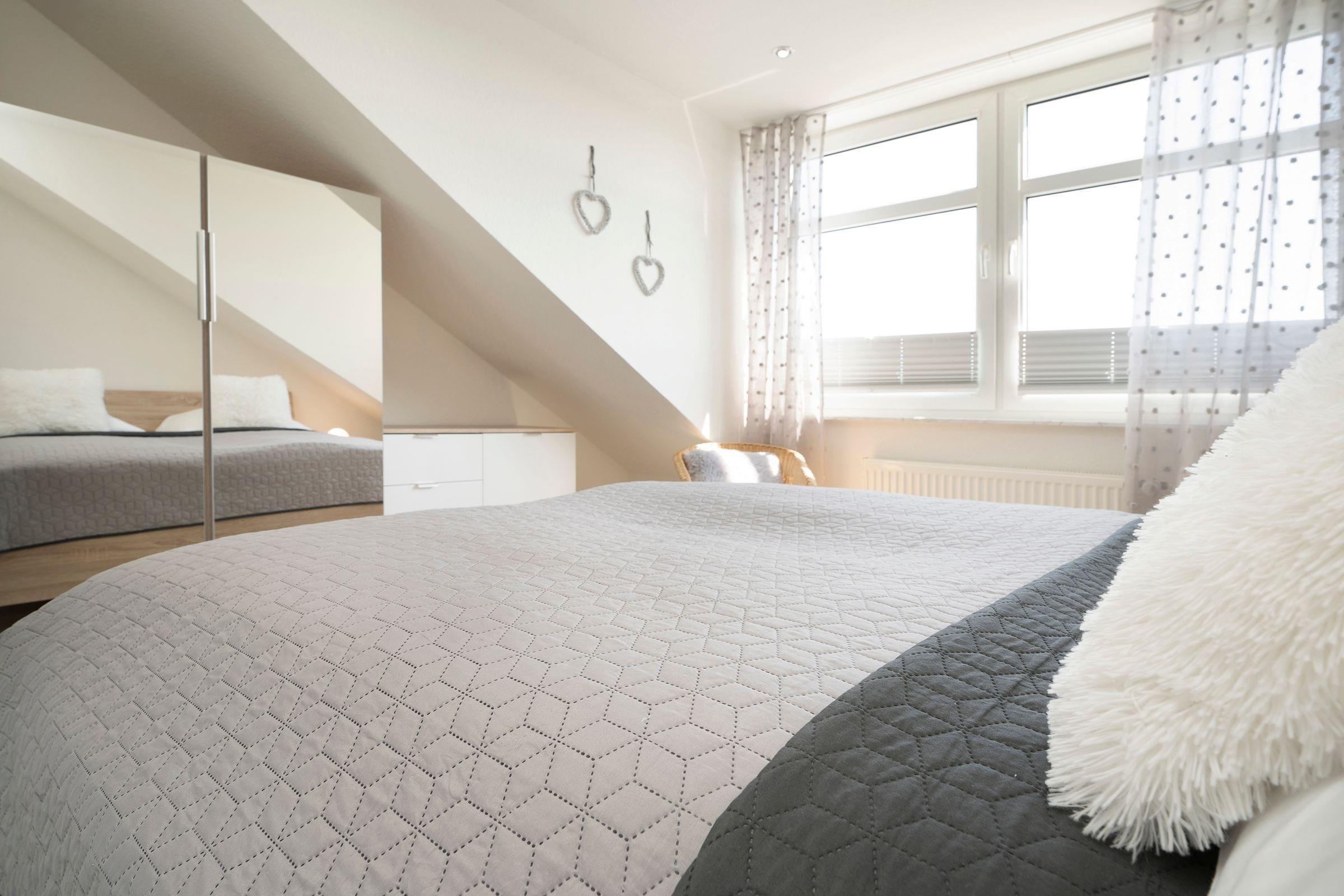 Schlafzimmer 1: 1 Doppelbett (2x 90x200 cm), Kleiderschrank, TV, Verdunkelung (Jalousien), Platz für Babybett vorhanden