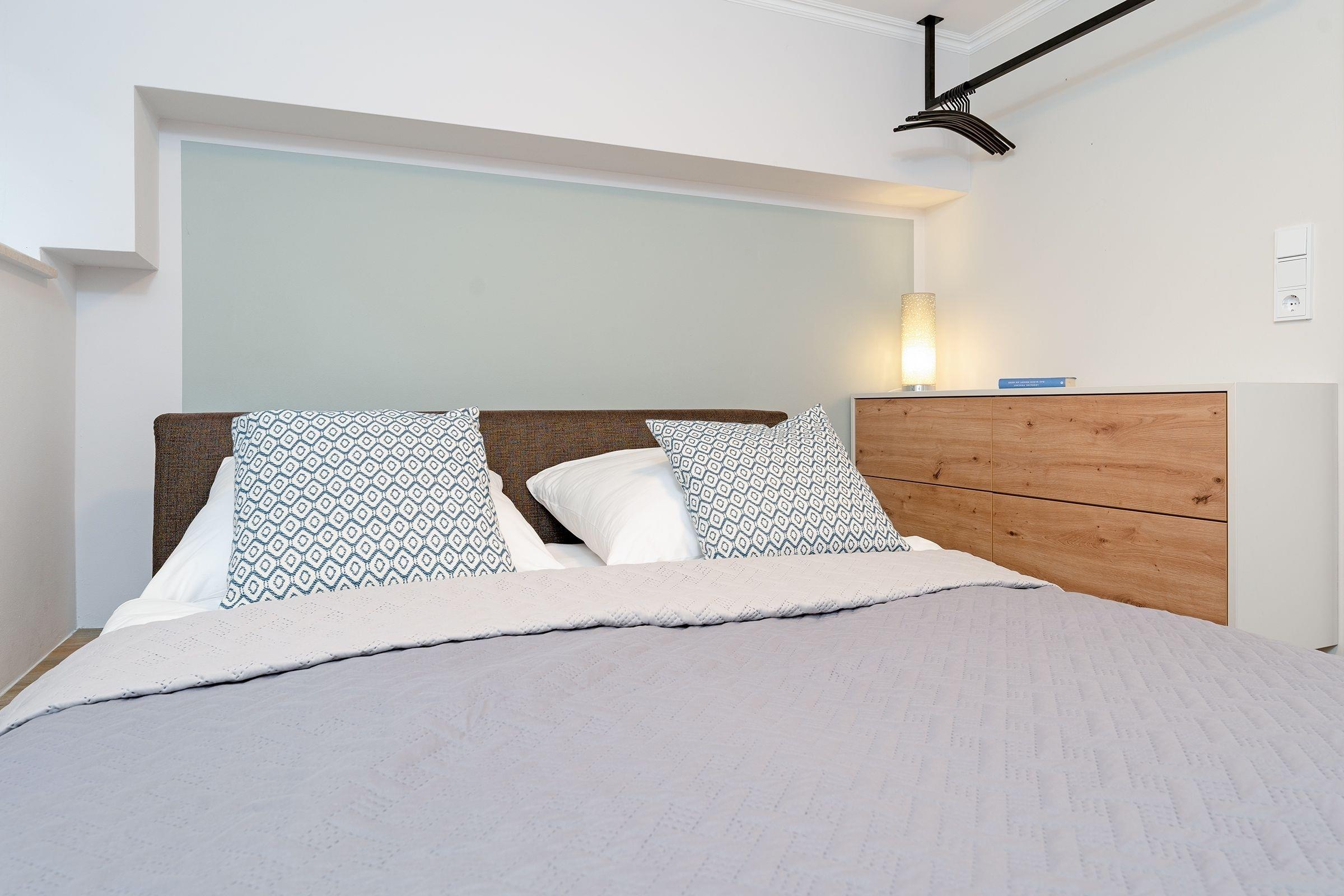 Schlafzimmer 2 (Souterr.): 1 Boxspringbett (180x200 cm), Kleiderschrank, Verdunklungsplissees, TV, Platz für Babybett