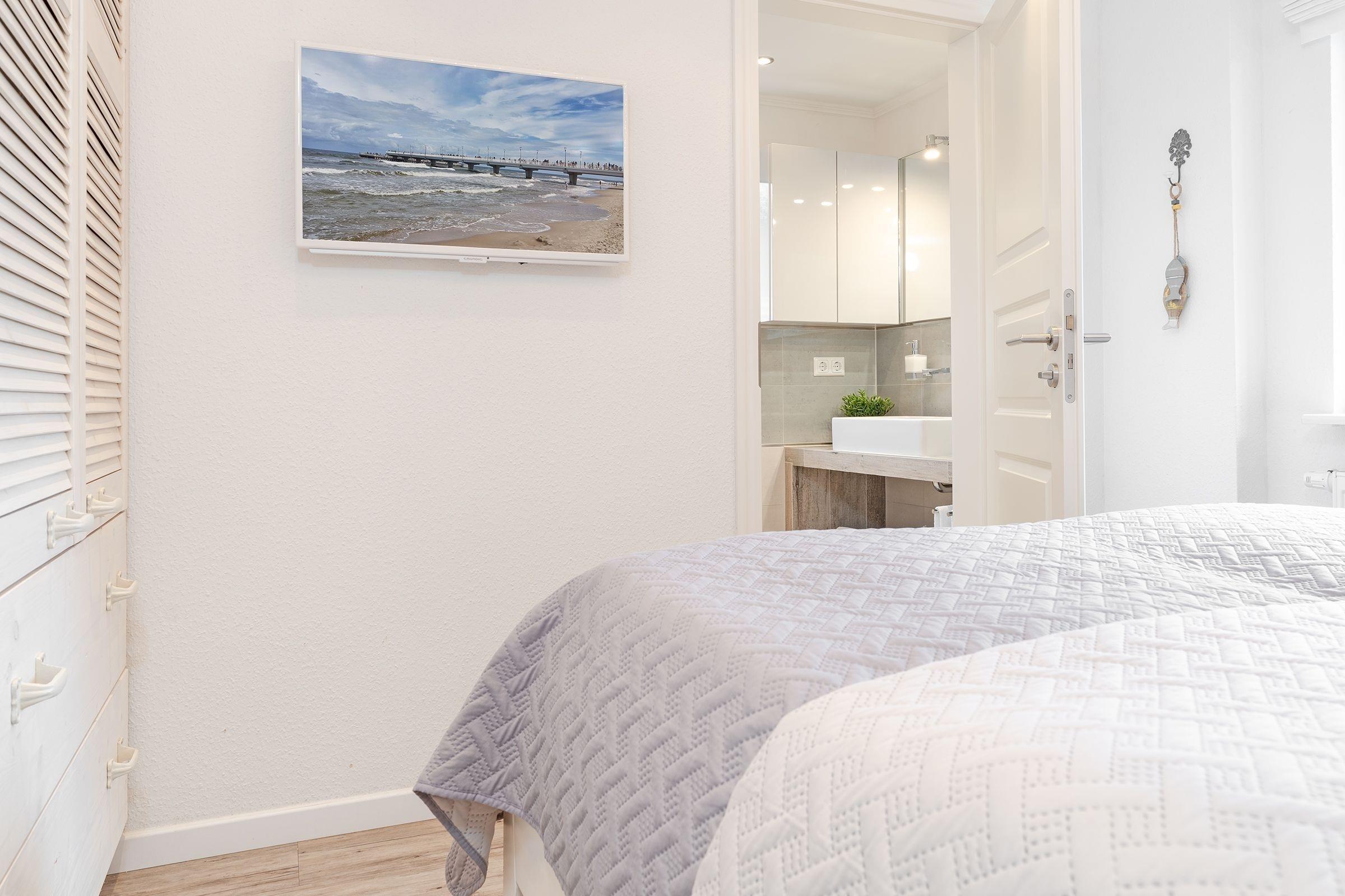 Schlafzimmer: 1 Doppelbett (160x200 cm), Kleiderschrank, Verdunklungsmöglichkeit: Blickdichte Rollos, TV, Bad en suite