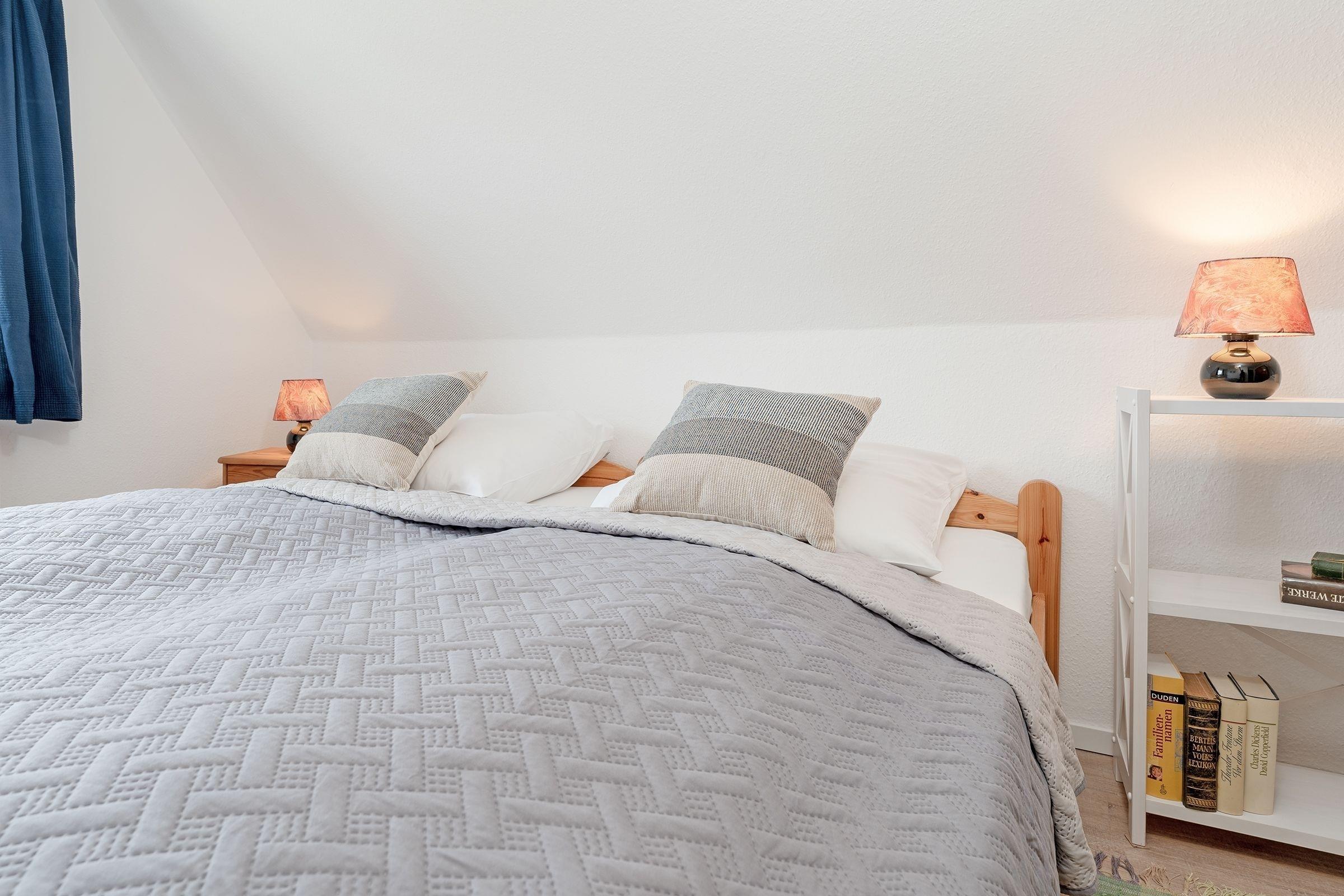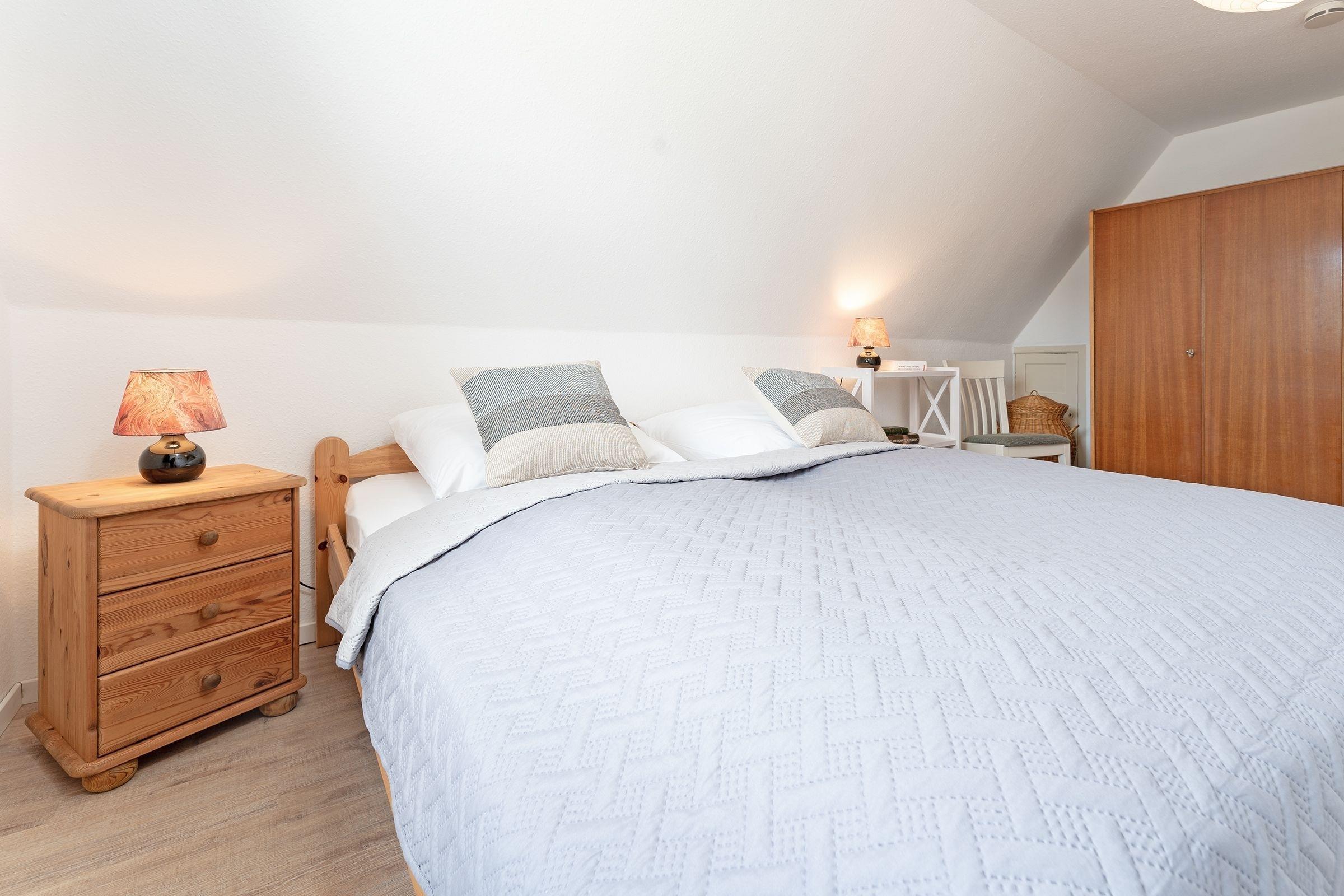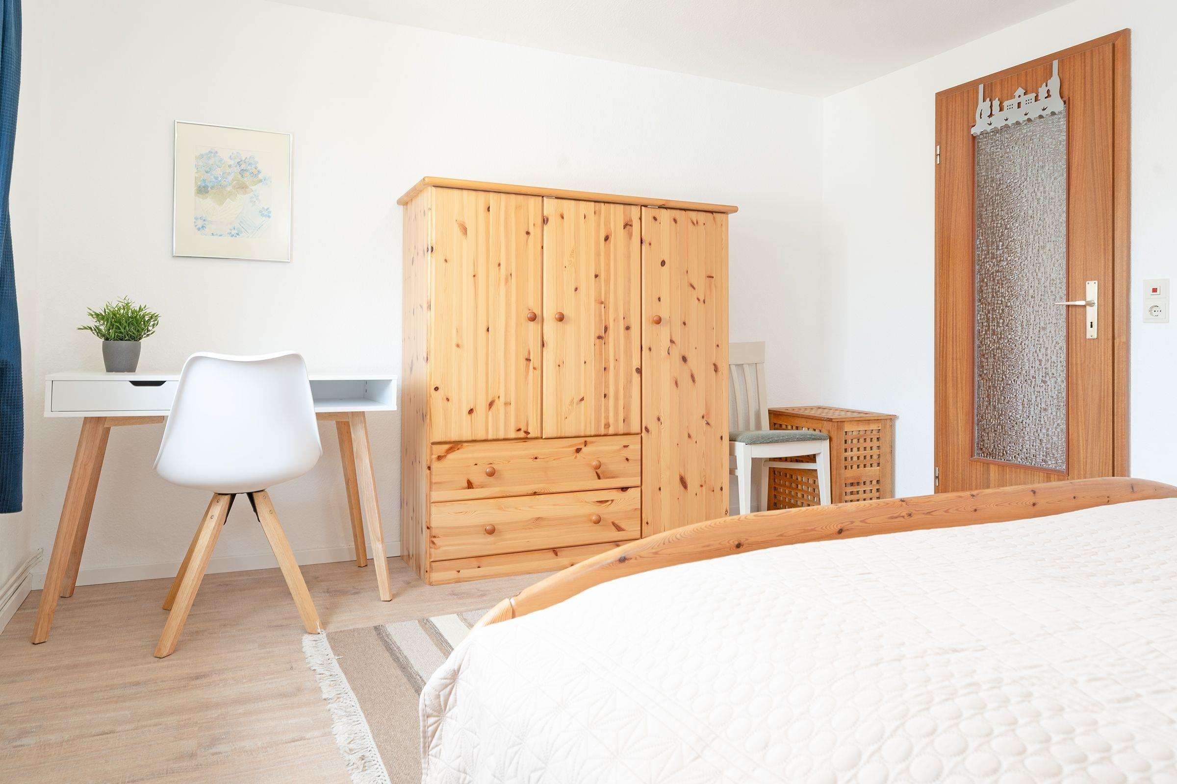 Schlafzimmer 2 (1.OG): 1 Doppelbett (2x 90x200 cm), Kleiderschrank, Verdunklungsmöglichkeit: Vorhang und Plissee, Platz für Babybett vorhanden