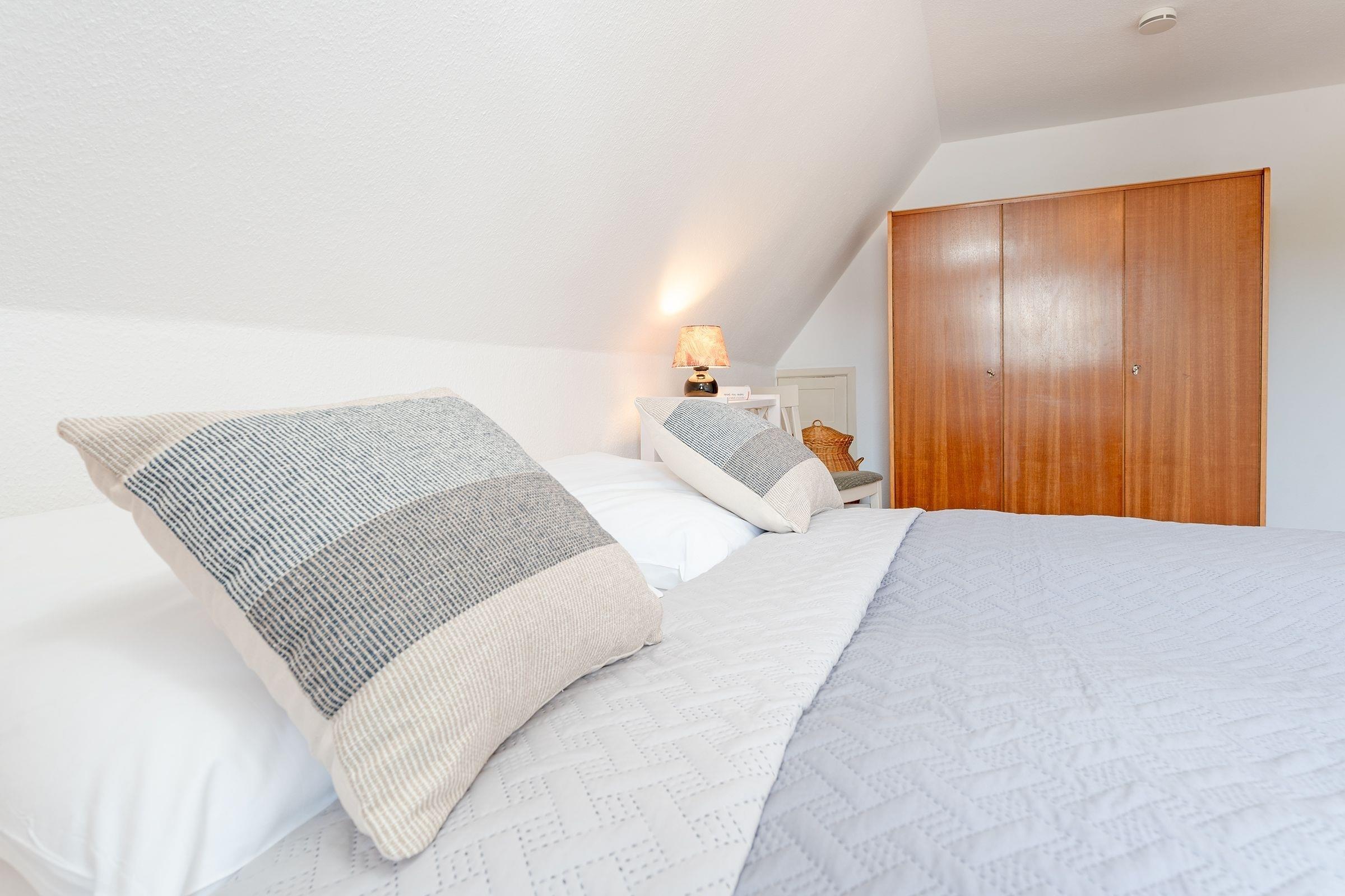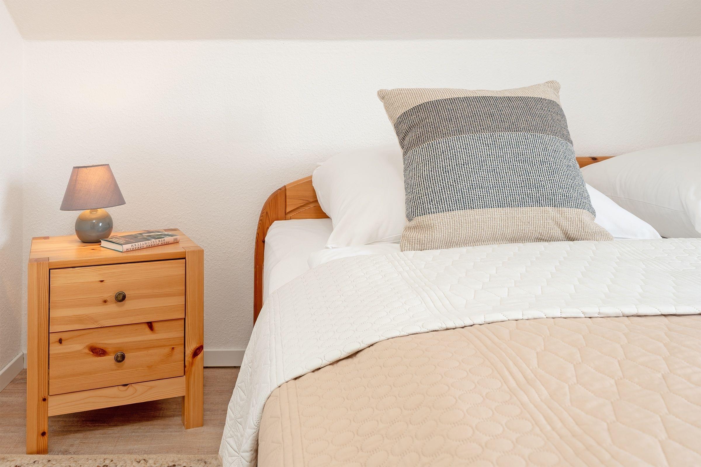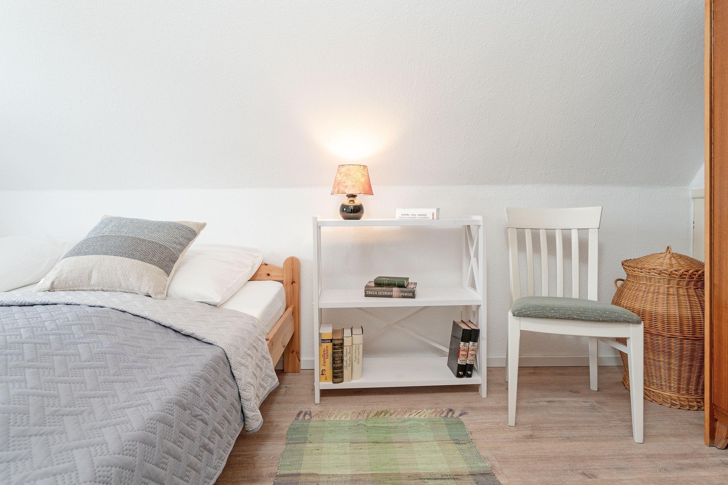 Schlafzimmer 2 (1.OG): 1 Doppelbett (2x 90x200 cm), Kleiderschrank, Verdunklungsmöglichkeit: Vorhang und Plissee, Platz für Babybett vorhanden
