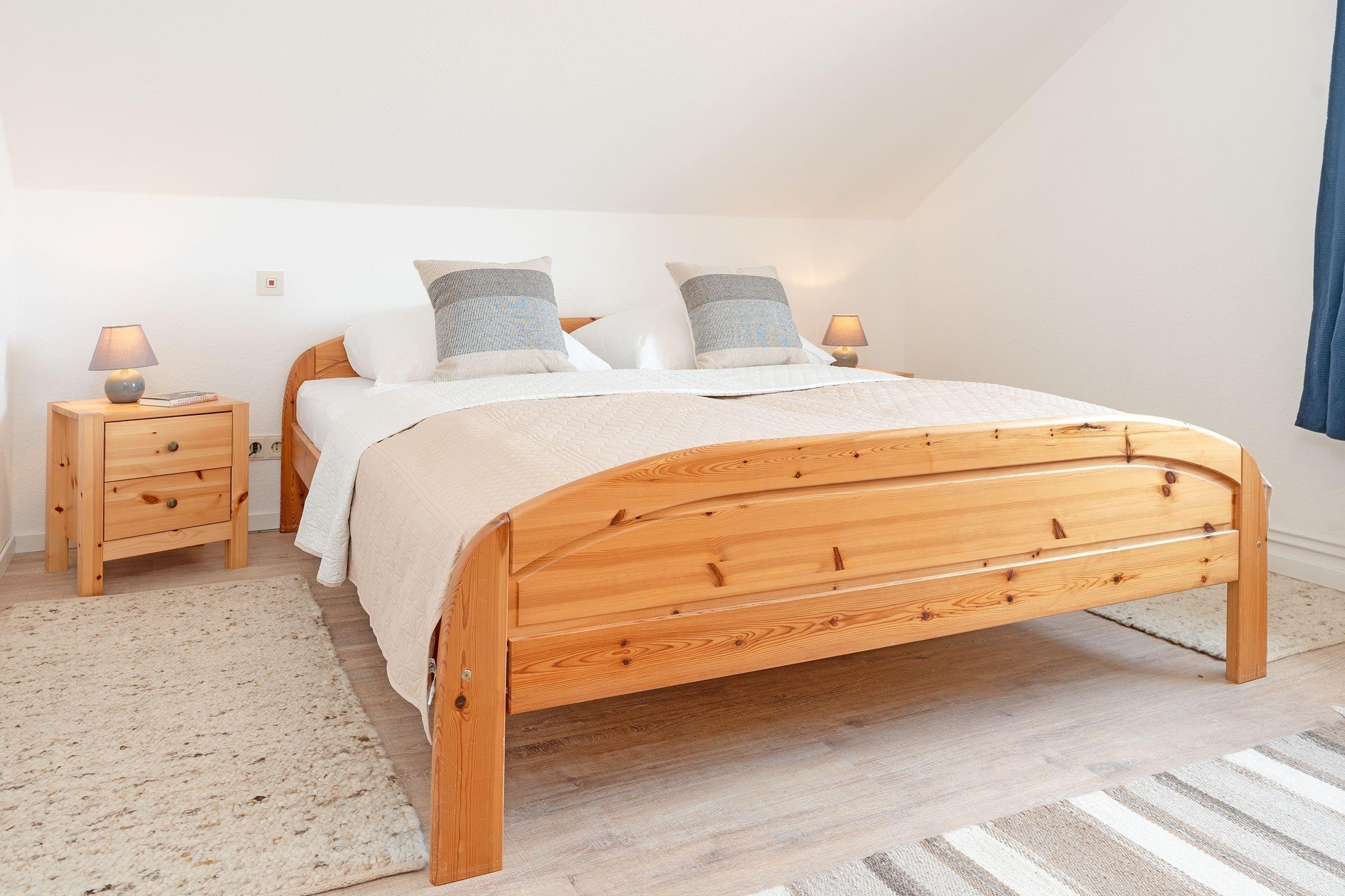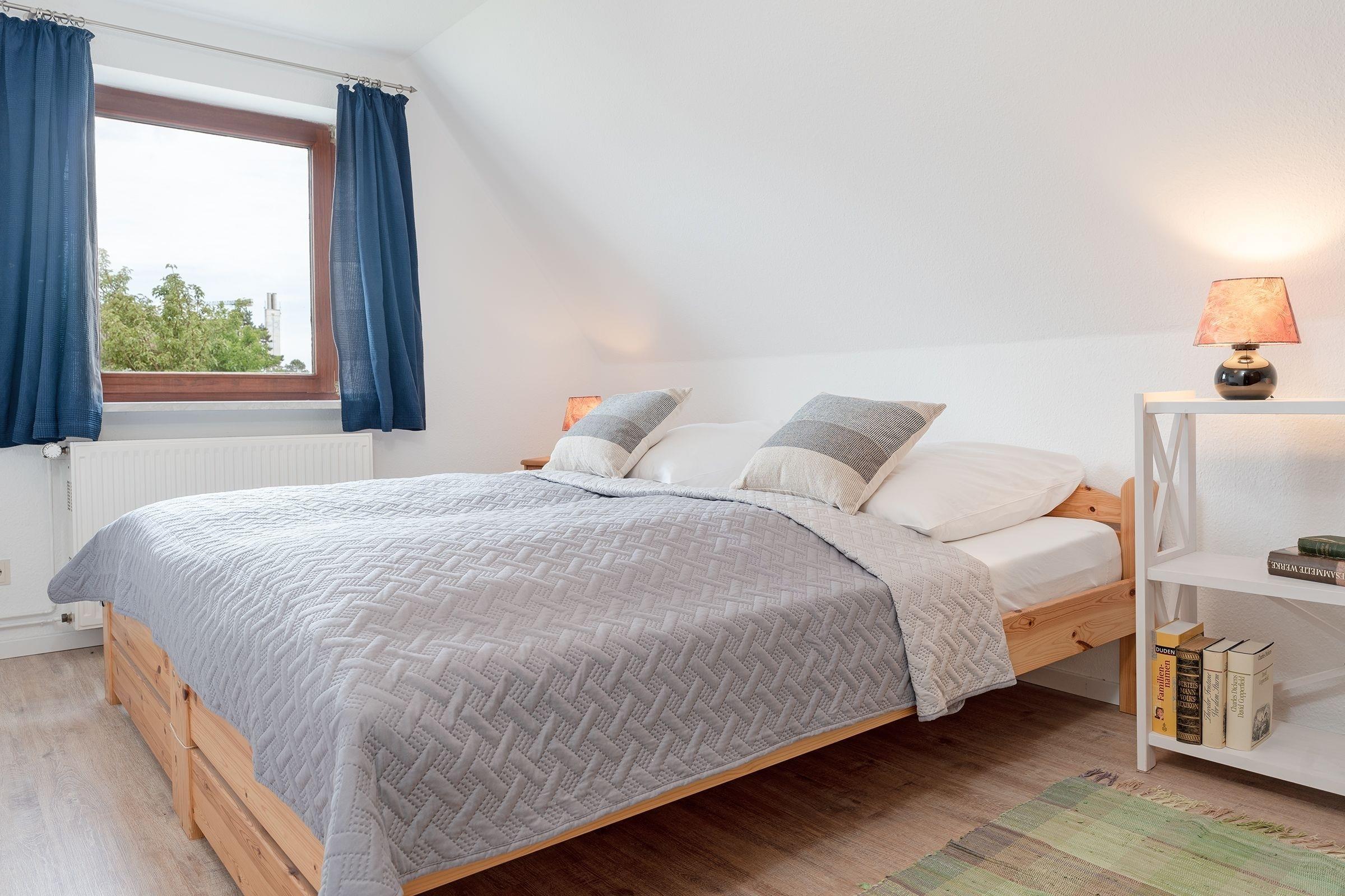 Schlafzimmer 1 (1.OG): 1 Doppelbett (2x 90x200 cm), Kleiderschrank, Verdunklungsmöglichkeit: Vorhang und Plissee, Platz für Babybett vorhanden