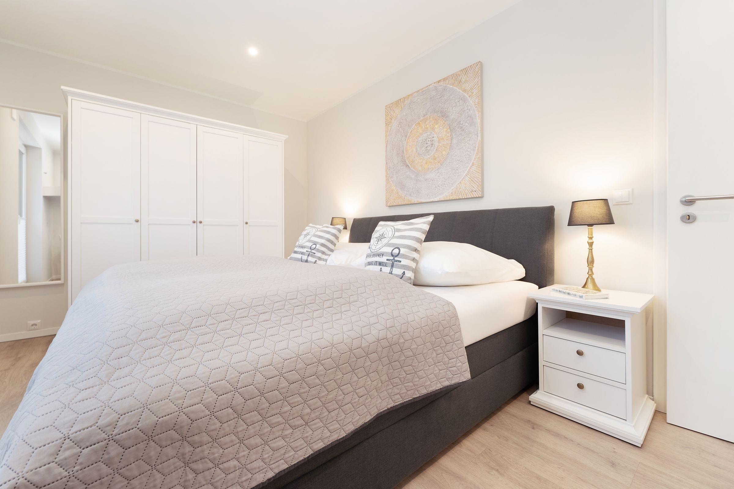 Schlafzimmer 1: 1 Doppelboxspringbett (180x200 cm), TV, Kleiderschrank, Verdunkelung: Rollläden, Platz für ein Babybett vorhanden