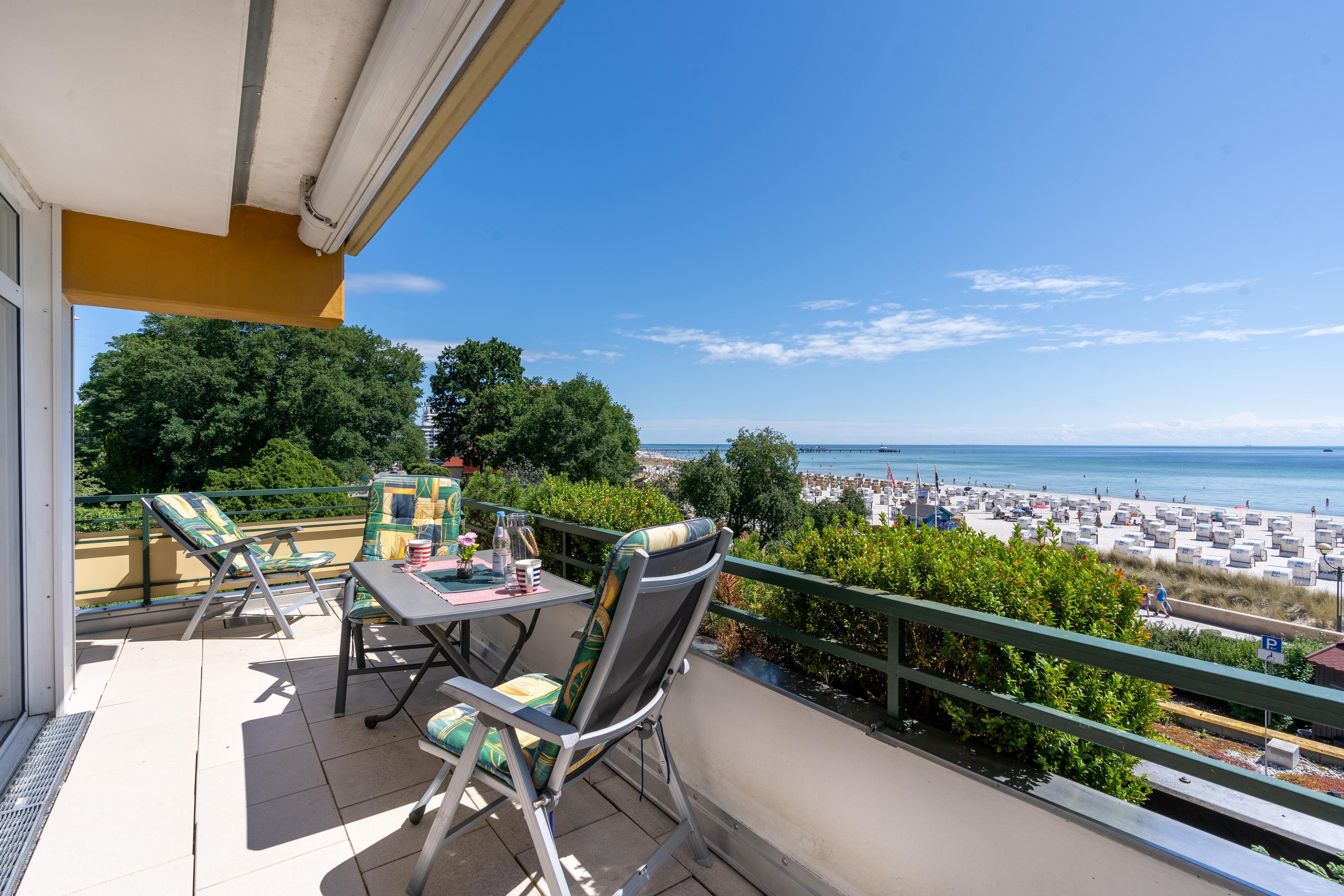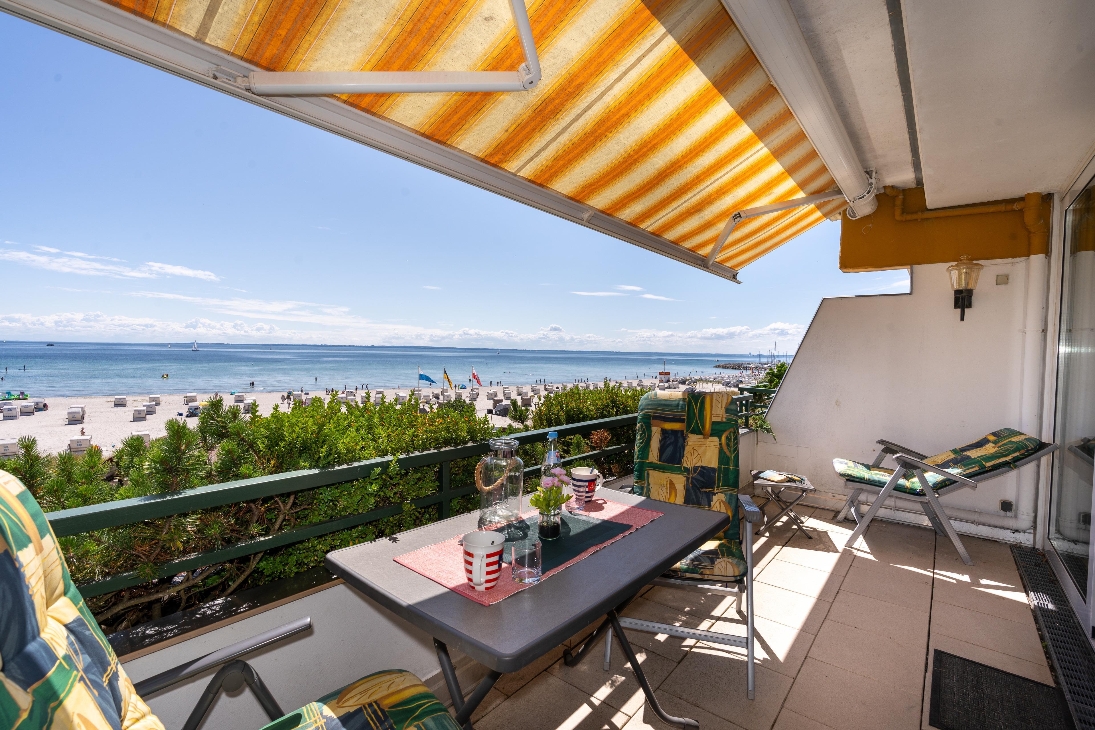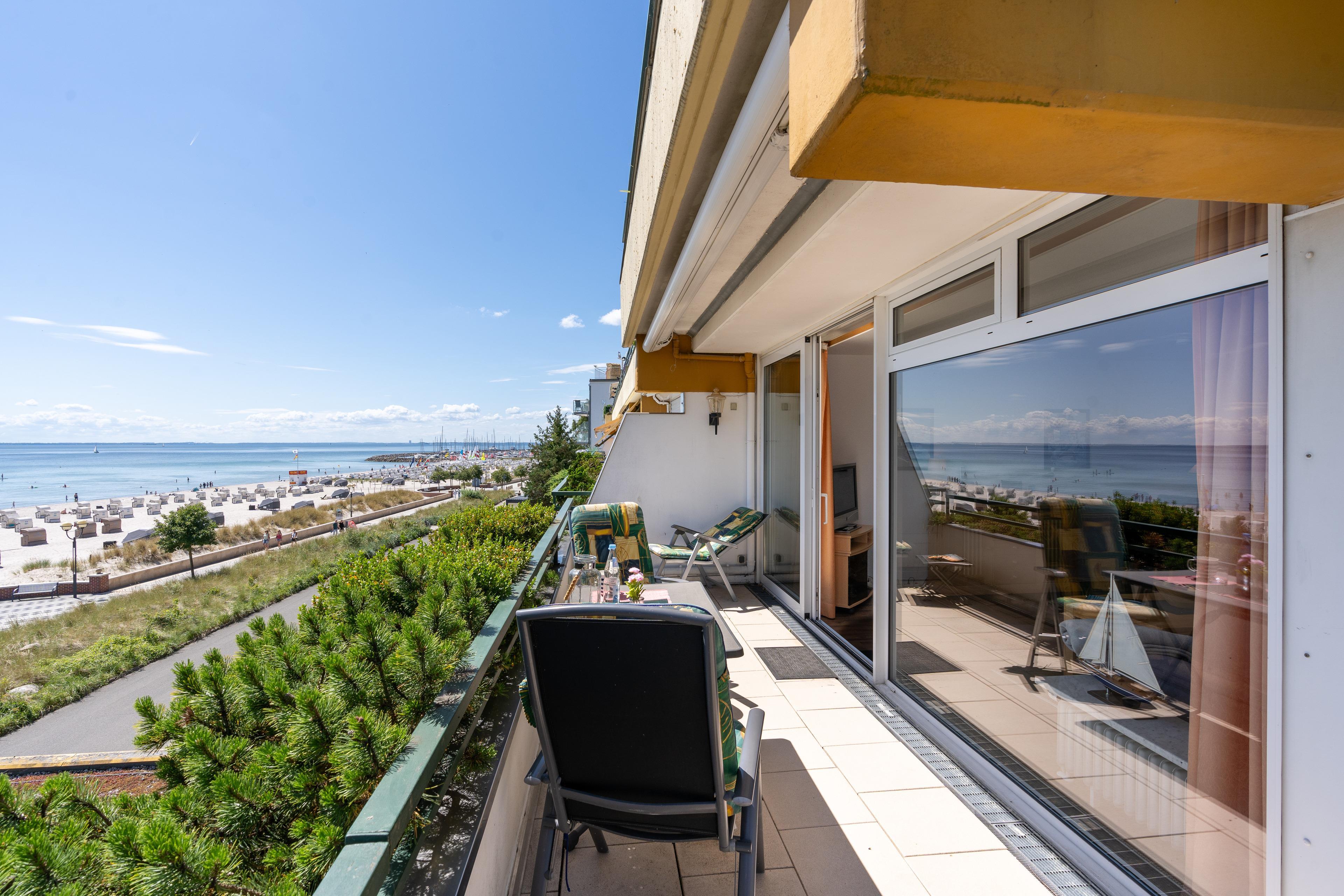 Traumhafter Blick auf das Meer und die Seebrücke von Grömitz. Schöne Wohnung im Hause Miramar, ca. 65 m² groß, 2-Zimmer-Ferienwohnung 308 im 3. Stock. Diese geschmackvoll eingerichtete Unterkunft bietet Platz für bis zu 4 Personen und wartet mit einem großzügigen Balkon in direkter Nähe zum Strand auf.
