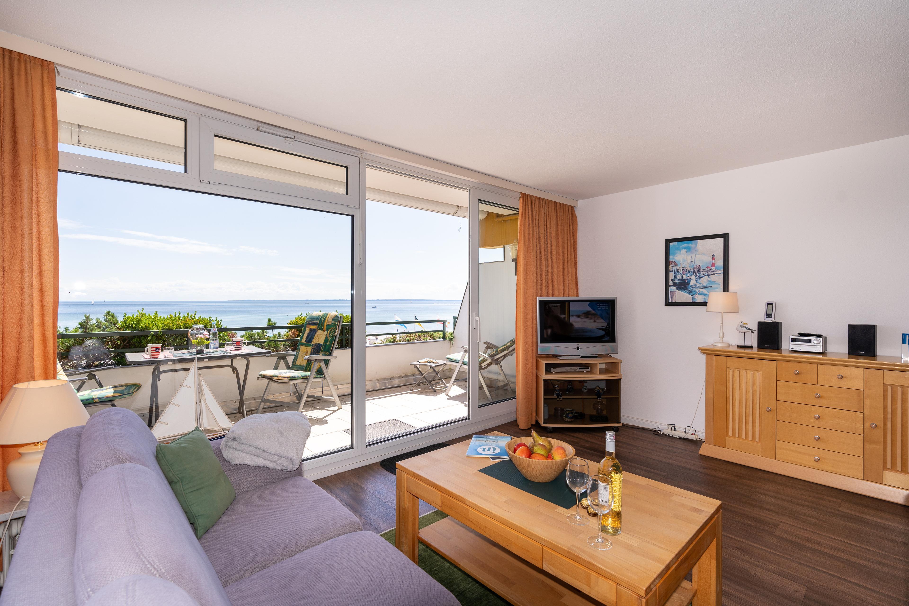 Vom Flur aus gelangen Sie in den lichtdurchfluteten Wohn-/Essbereich, der mit einem komfortablen Sofa und zwei praktischen Schrankbetten ausgestattet ist – ideal für zusätzliche Schlafgelegenheiten. Der große, möblierte Südost-Balkon lädt auf ca. 28qm zum Verweilen ein; genießen Sie sonnige Tage auf dem Eck-Balkon und traumhafte Ausblicke auf den Strand, die Ostsee und die Seebrücke.
