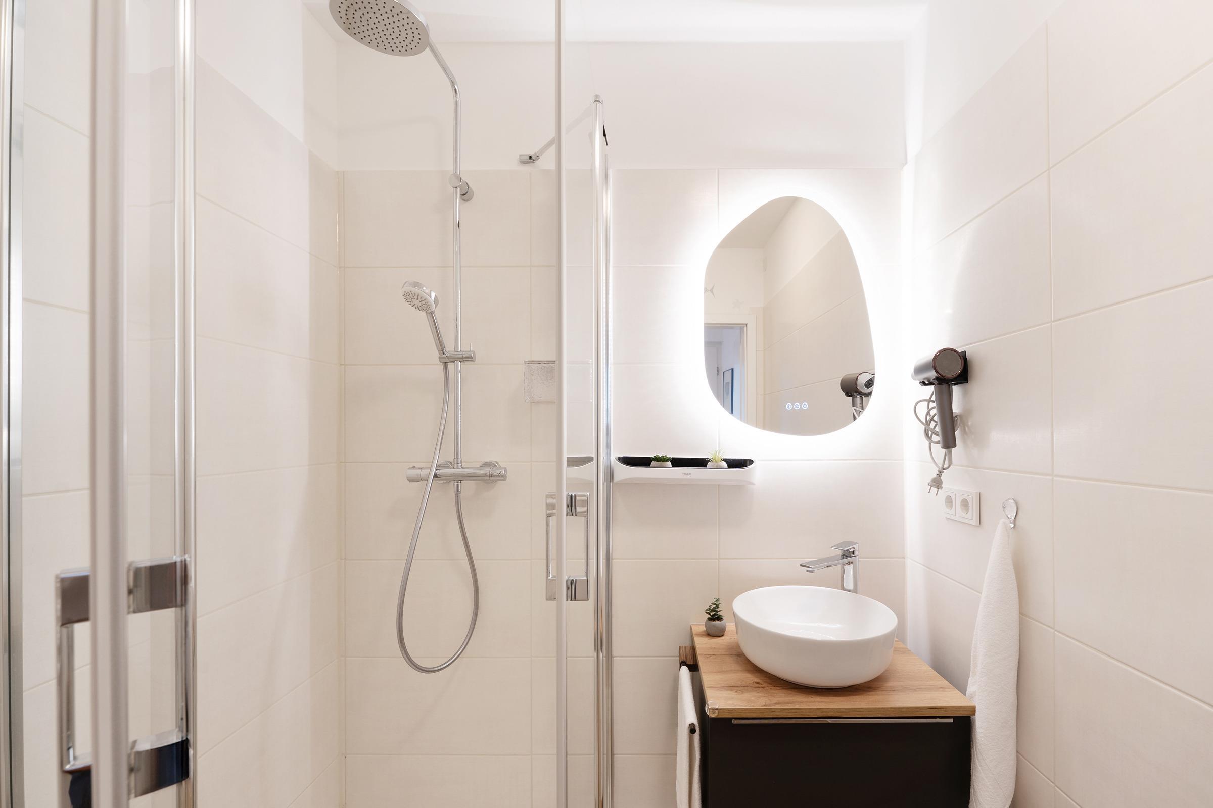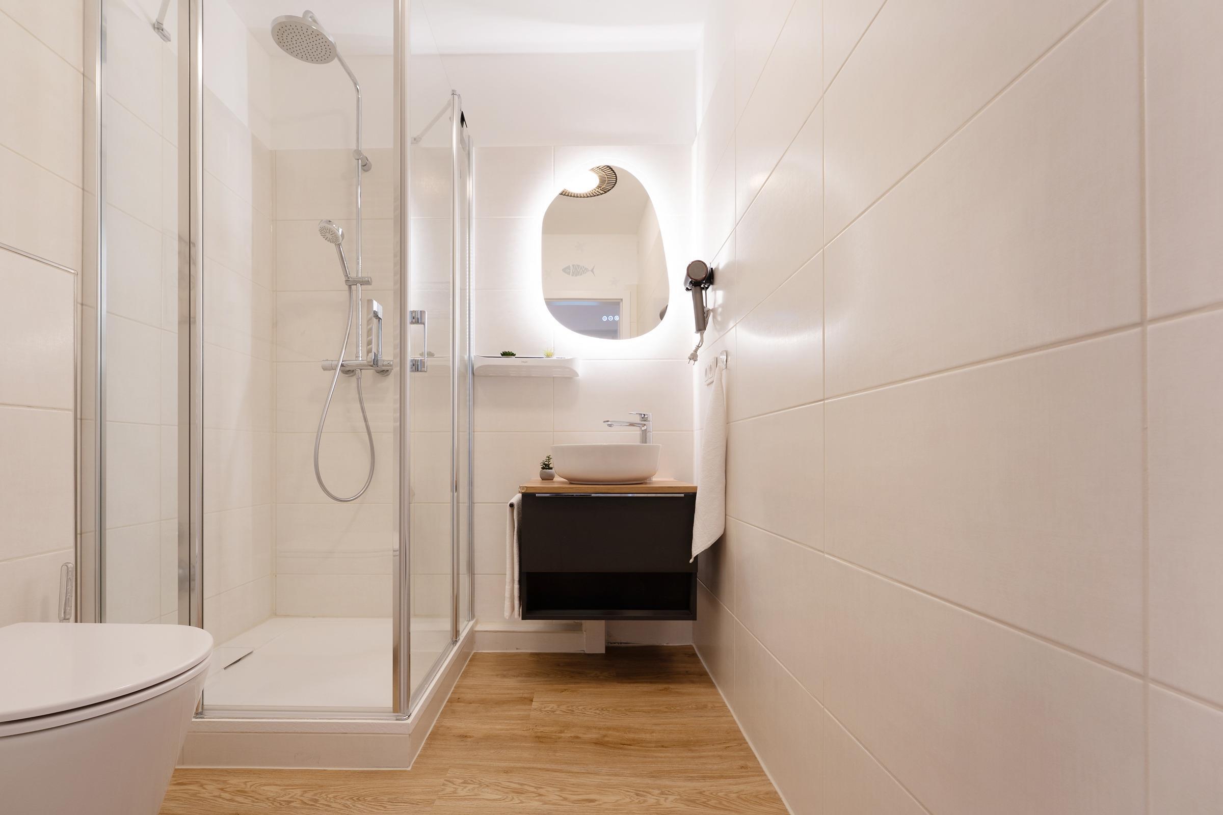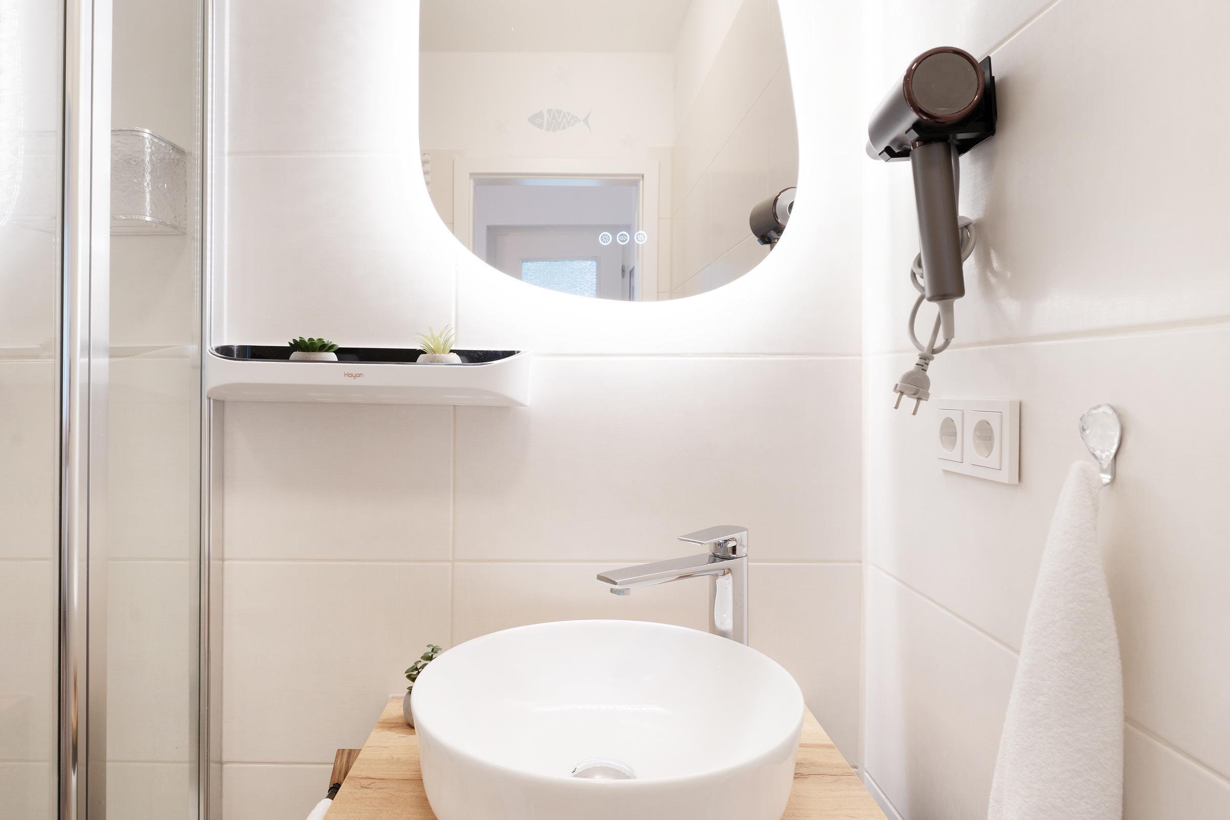 Der lichtdurchflutete Wohnbereich bietet ein komfortables Sofa, einen Fernseher sowie einen Zugang zum Balkon, der mit Möbeln ausgestattet ist und zum Verweilen an der frischen Ostseeluft einlädt. Hier können Sie den Tag mit einem Kaffee beginnen oder abends die laue Brise genießen. Die angrenzende Küche ist bestens ausgestattet mit Backofen, Ceran-Herd, Kühlschrank mit Gefrierfach, Kaffeemaschine, Toaster und Wasserkocher und lässt keine Wünsche für die Selbstversorgung offen. Der Essbereich lädt zu gemeinsamen Mahlzeiten ein. Im Schlafzimmer sorgt ein gemütliches Doppelbett für erholsame Nächte, während ausreichend Stauraum für Ihre Garderobe vorhanden ist. Eine Sauna zur gemeinschaftlichen Nutzung steht Ihnen gegen Aufpreis zur Verfügung. Das moderne Badezimmer verfügt über eine Dusche, WC, Kosmetikspiegel und Haartrockner. Waschmaschine und Trockner zur gemeinschaftlichen Nutzung mit Münzeinwurf sind im Wäschekeller vorhanden.