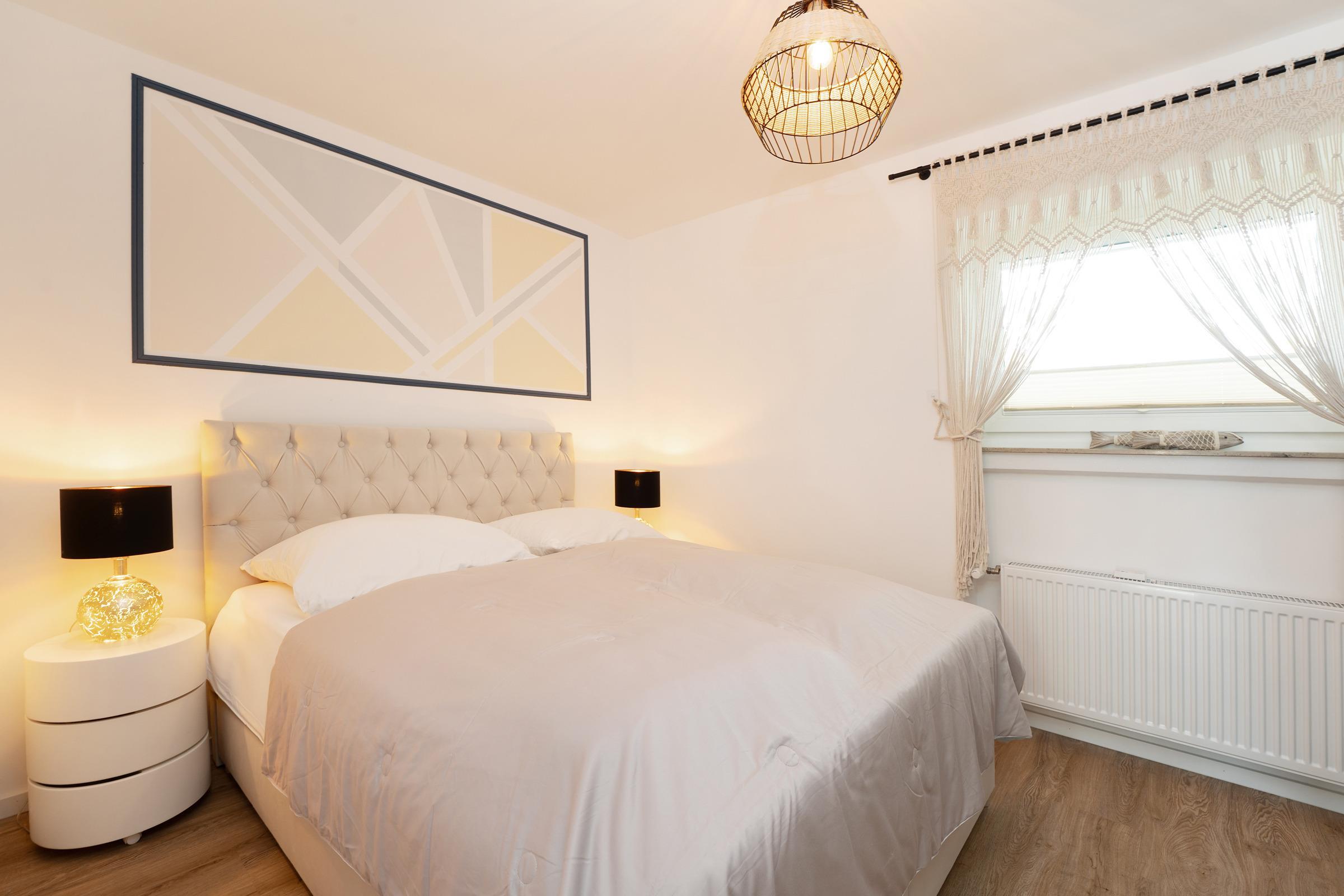 Schlafzimmer: 1 Boxspring-Doppelbett (160x200 cm), Kleiderschrank, TV, Verdunkelung: Plissee, kein Platz für ein Babybett vorhanden