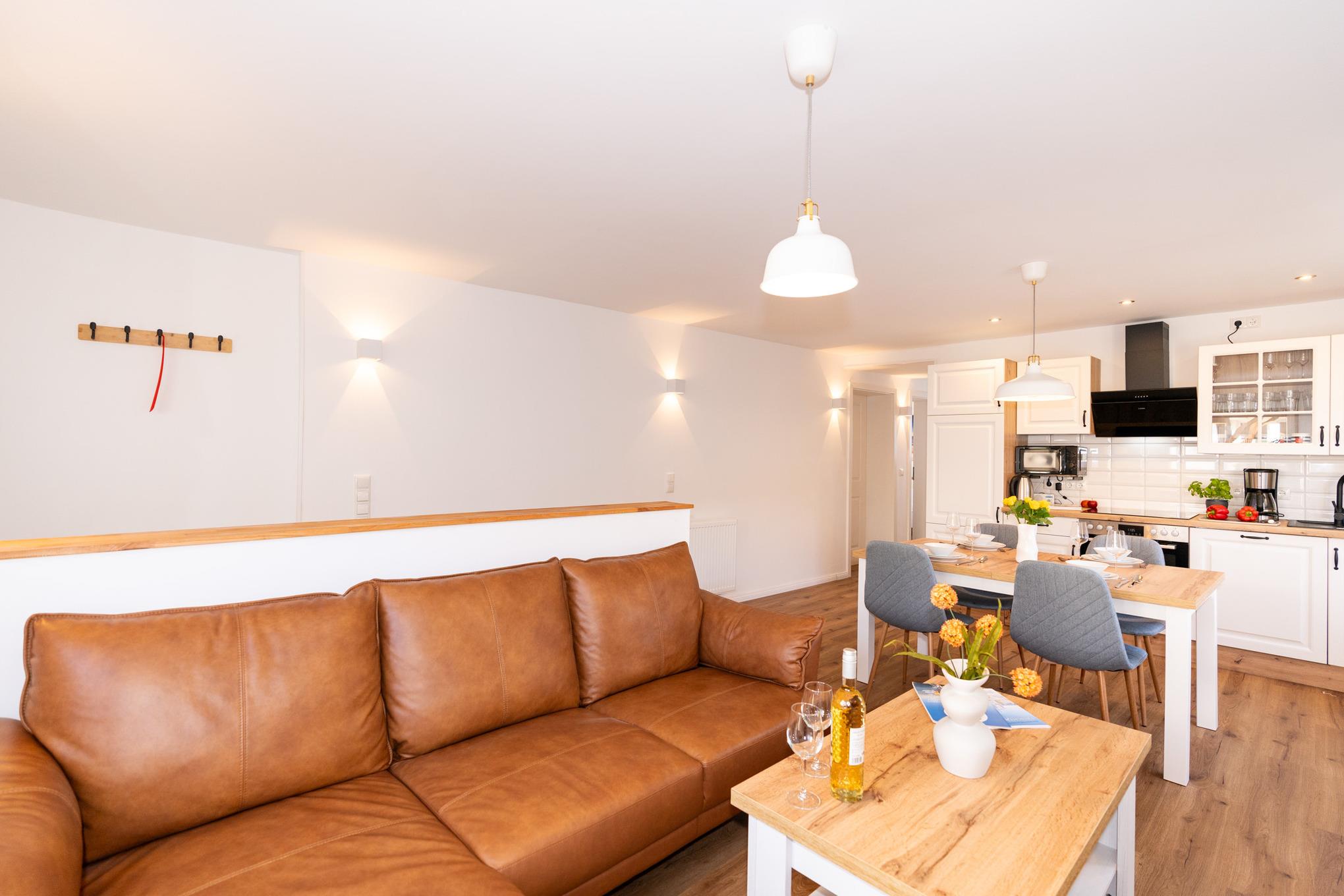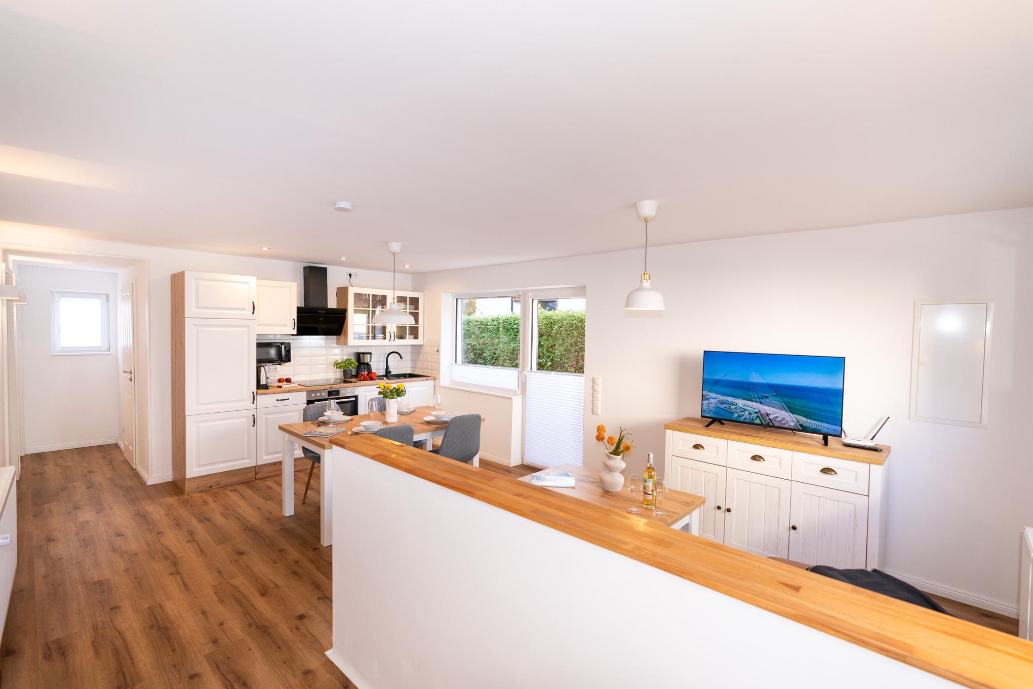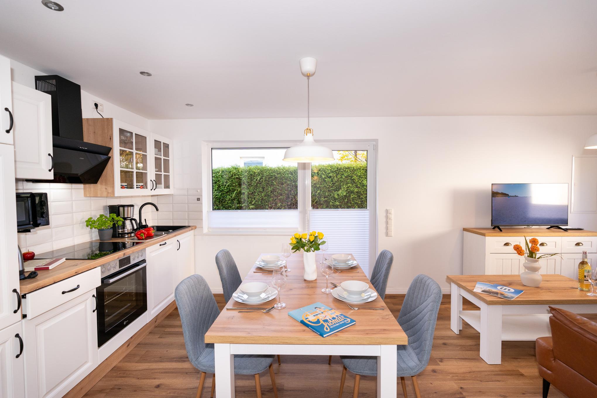 Der Bungalow verfügt über einen sehr hellen und offenen Wohn-/ Essbereich. Hier finden Sie eine große Couch, SAT-TV und und selbstverständlich kostenloses W-LAN vor. Am bodentiefen Fenster befindet sich der Esstisch mit 4 Stühlen Die offene Küche mit Cerankochfeld und Backofen, Spülmaschine, Kühlschrank mit Gefrierfach und Mikrowelle ist perfekt in das Wohnzimmer integriert und lädt zum gemütlichen Beisammensein ein.