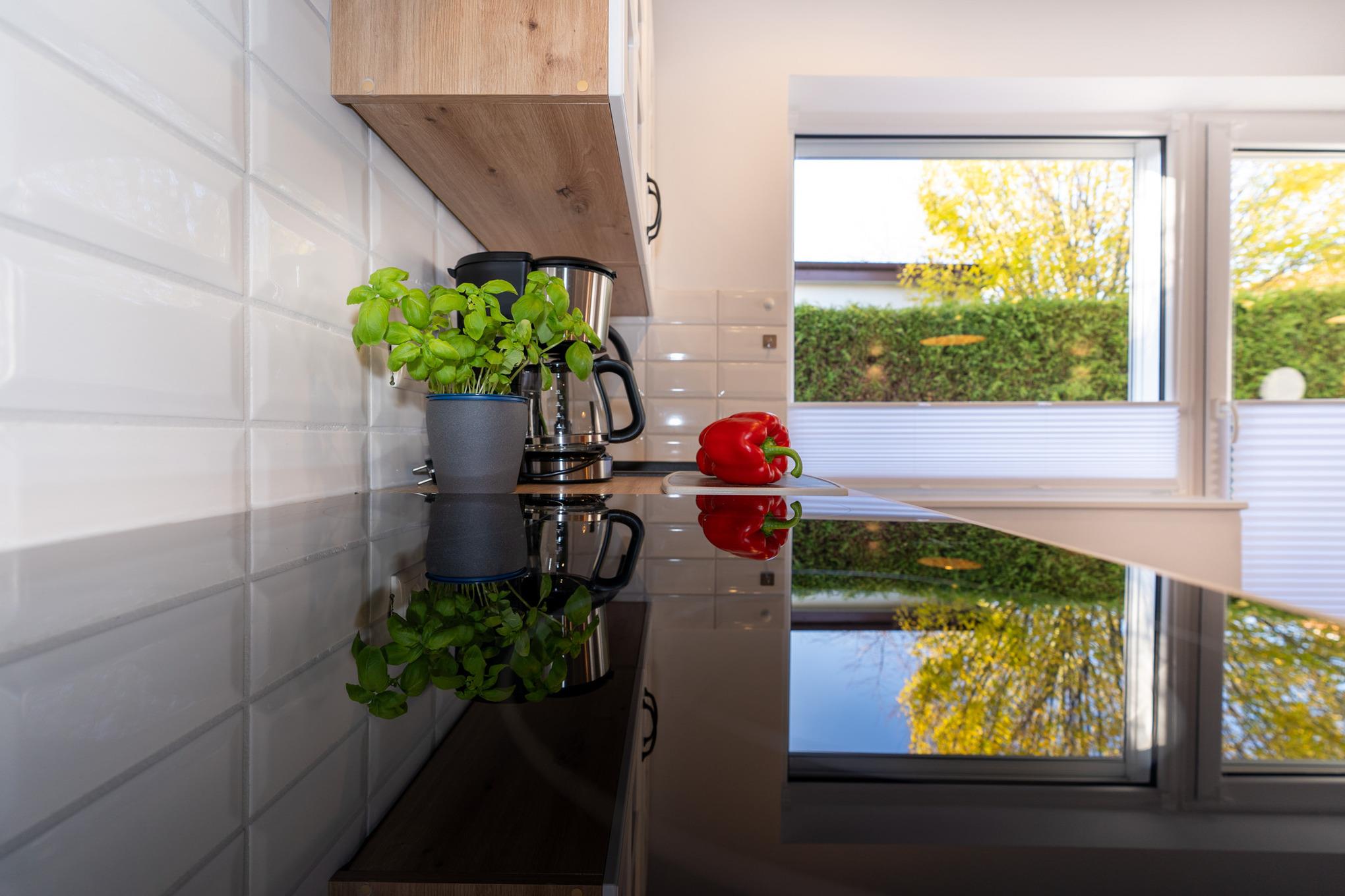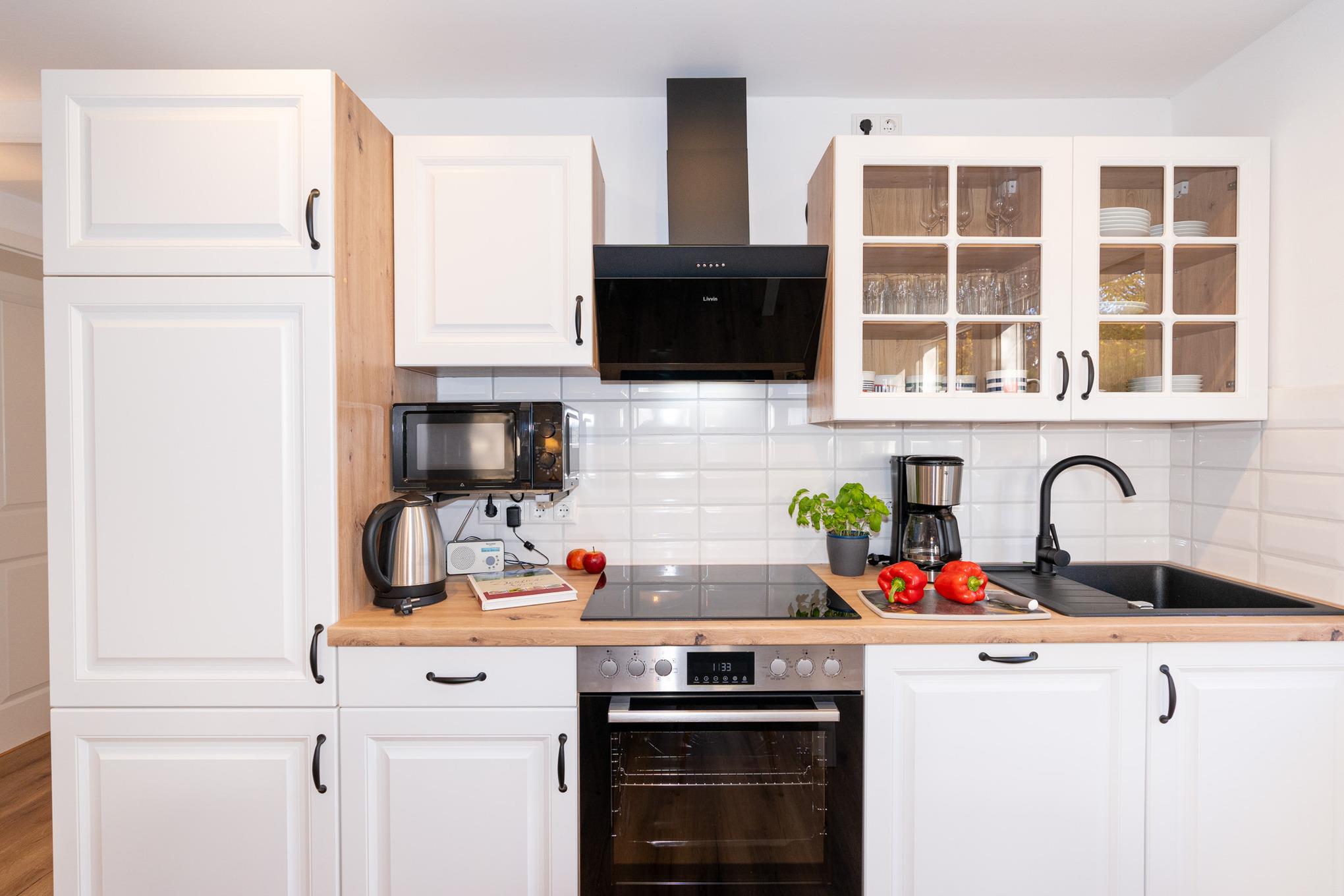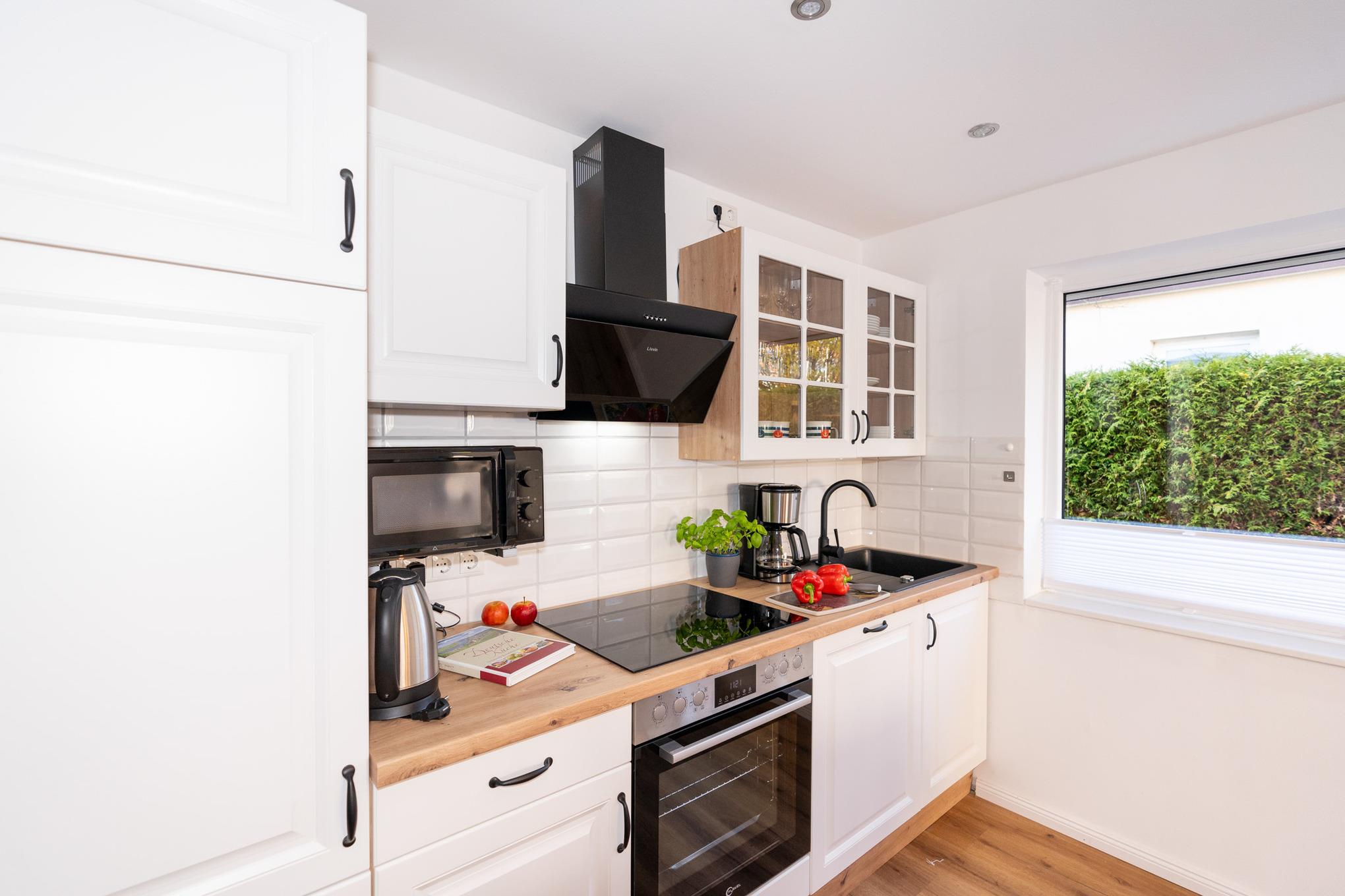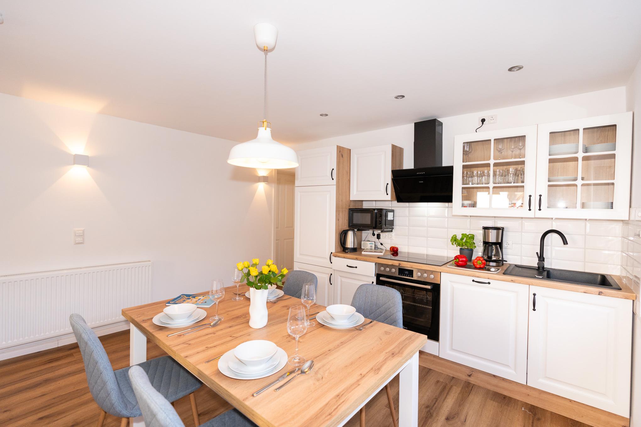 Der Bungalow verfügt über einen sehr hellen und offenen Wohn-/ Essbereich. Hier finden Sie eine große Couch, SAT-TV und und selbstverständlich kostenloses W-LAN vor. Am bodentiefen Fenster befindet sich der Esstisch mit 4 Stühlen Die offene Küche mit Cerankochfeld und Backofen, Spülmaschine, Kühlschrank mit Gefrierfach und Mikrowelle ist perfekt in das Wohnzimmer integriert und lädt zum gemütlichen Beisammensein ein.