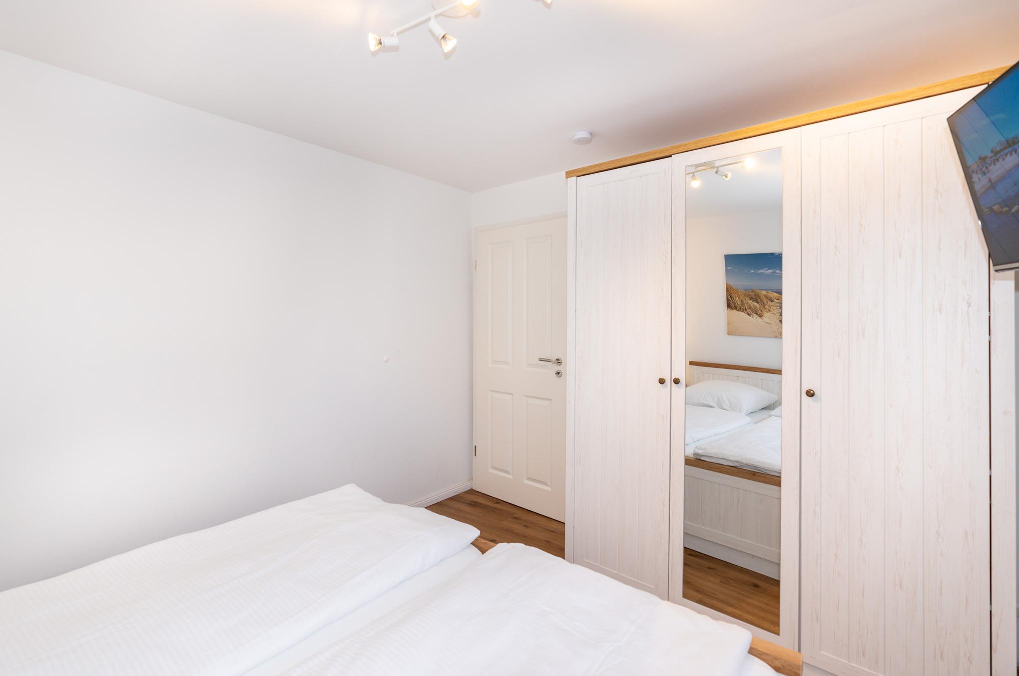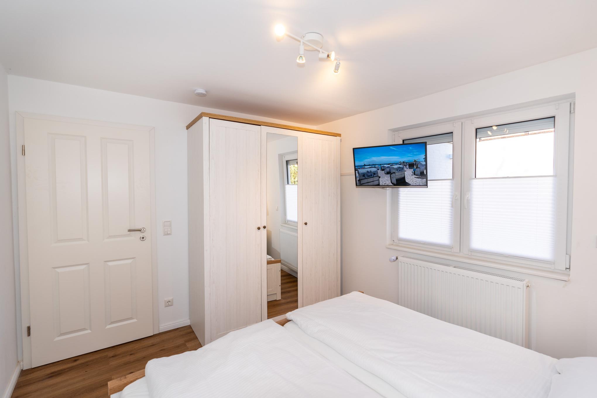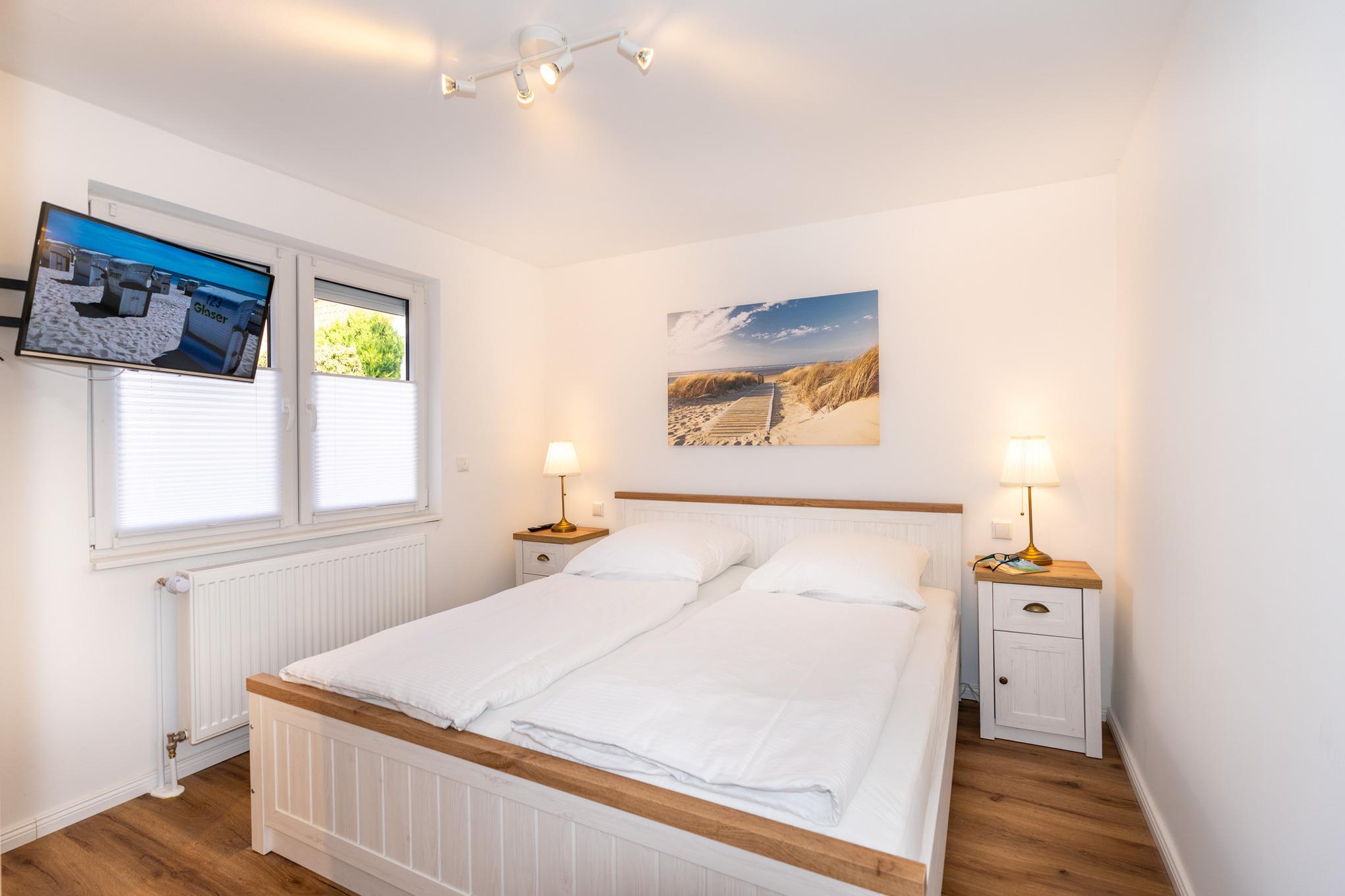 Ihnen stehen 2 Schlafzimmer mit jeweils einem Doppelbett (2x90x200), einem Kleiderschrank und zwei Nachttischen zur Verfügung. Highlight sind die jeweils an der Wand angebrachten Flat-TV.