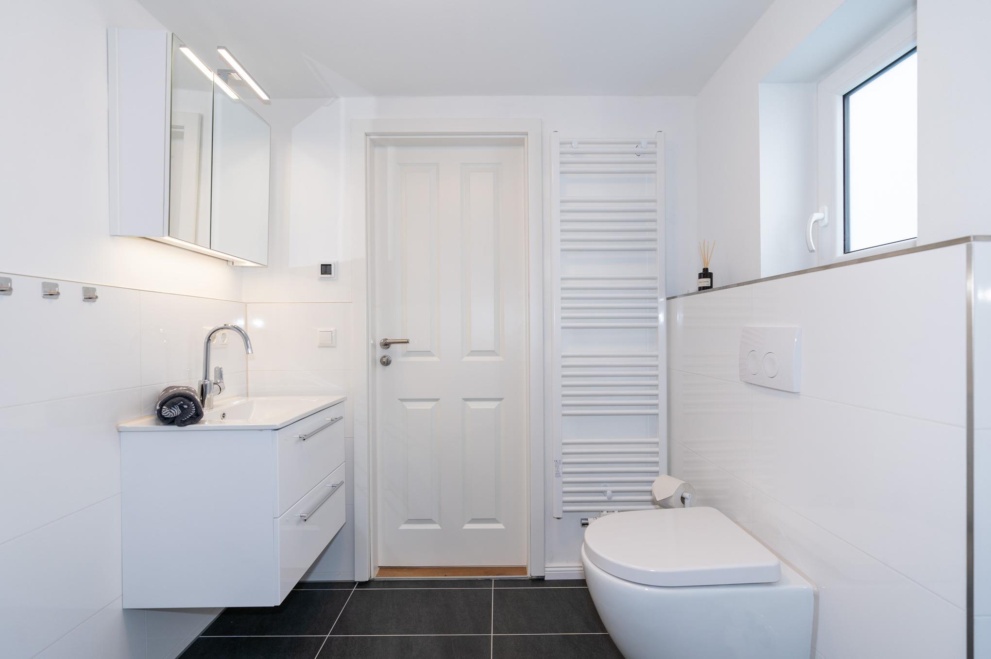Das großzügige Badezimmer mit Fenster verfügt über eine breite und barrierefreie Dusche, ein WC und einen Waschtisch mit Schubladen. Ein beleuchteter Spiegelschrank sorgt für weitere Ablagemöglichkeiten. Die Fußbodenheizung und der zusätzliche Handtuchheizkörper sorgen ein angenehmes Wohlbefinden. Eine Waschmaschine und ein Trockner, welche Ihnen kostenlos zur Verfügung stehen, runden dieses perfekte Bad ab.