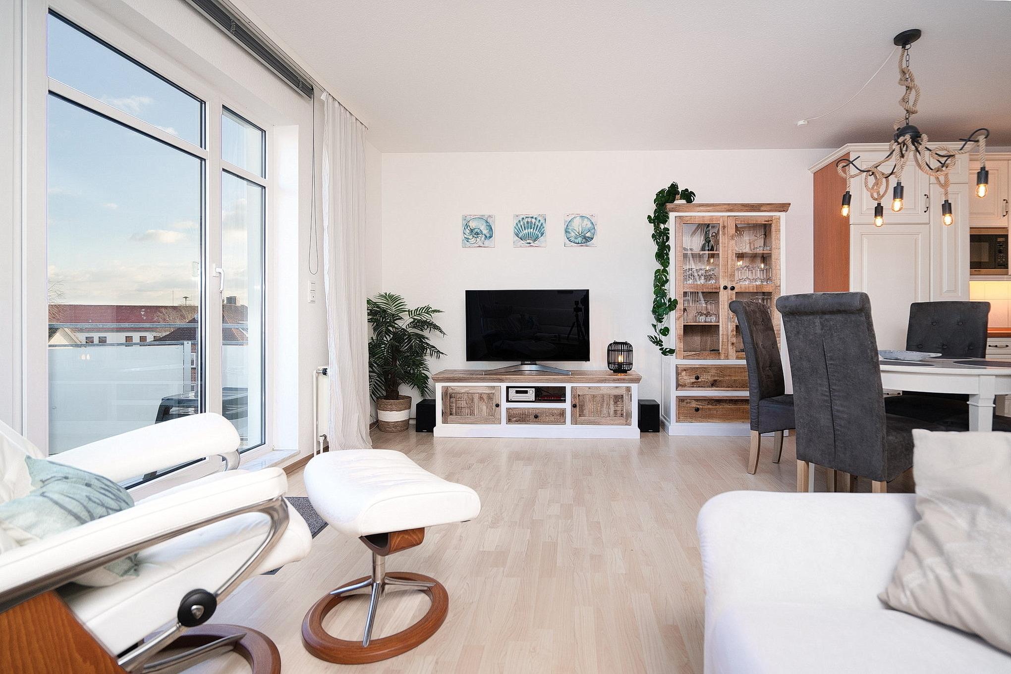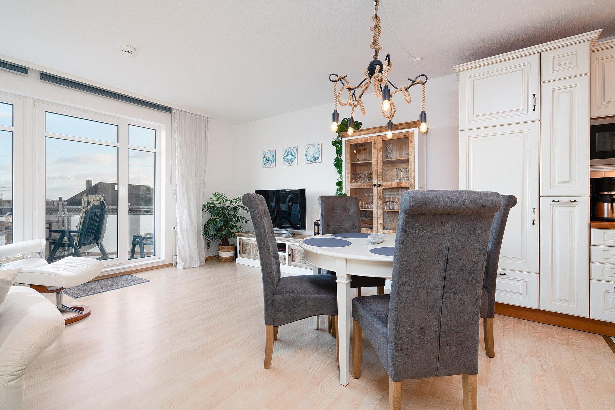 Heller, freundlicher, großzügiger Wohn- und Essbereich mit direktem Zugang zum Balkon. Der Raum verfügt über ein großes Ecksofa, einen Relax-Sessel sowie einen Essplatz für 4 Personen. Zur Unterhaltung stehen ein Smart-TV und ein Radio zur Verfügung. Der Wohnbereich ist mit Laminat ausgelegt und lässt sich durch Jalousien und Vorhänge blickdicht verdunkeln.