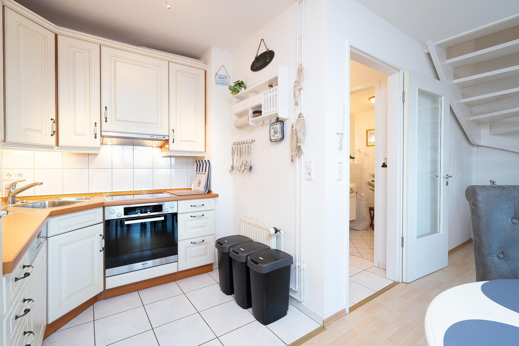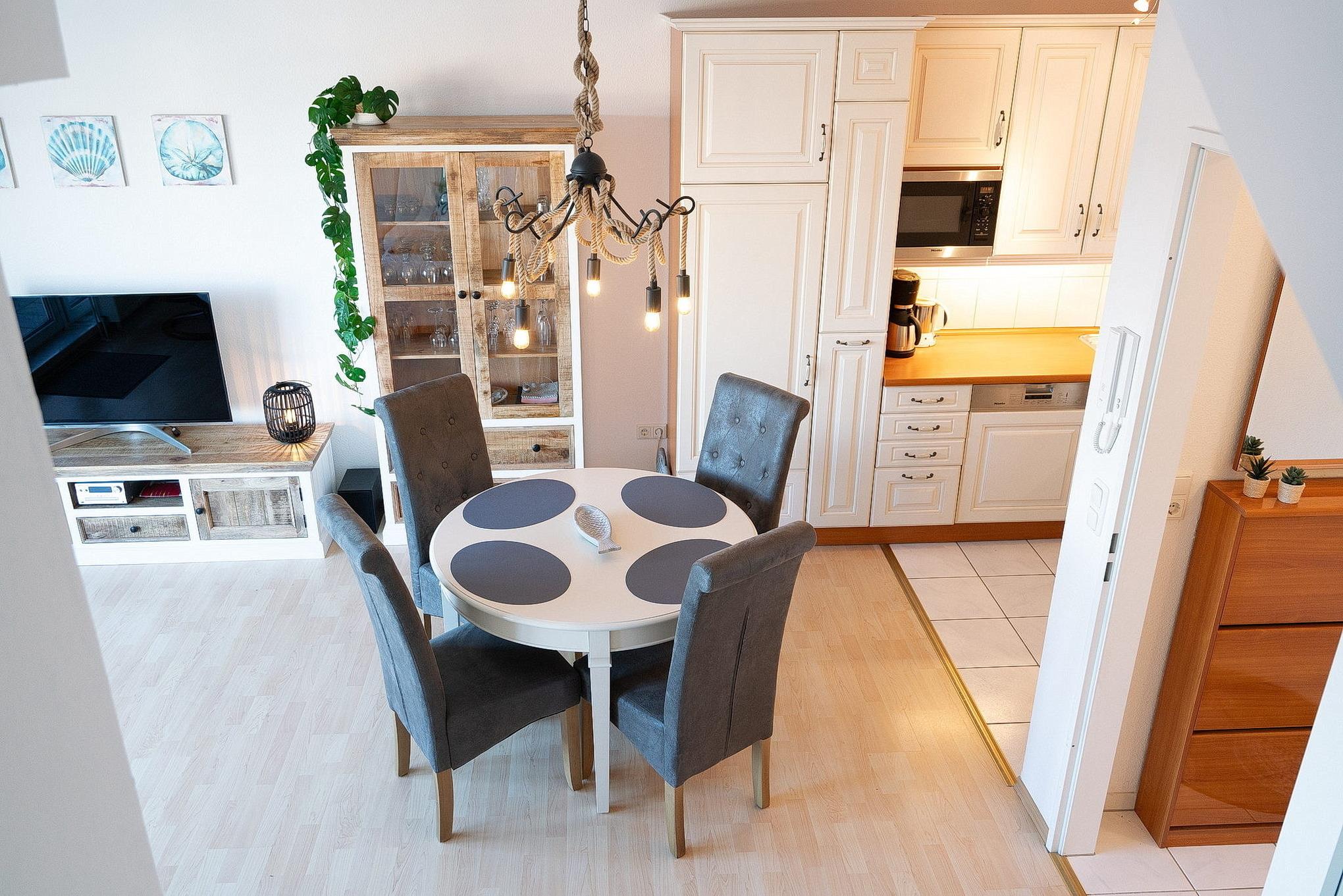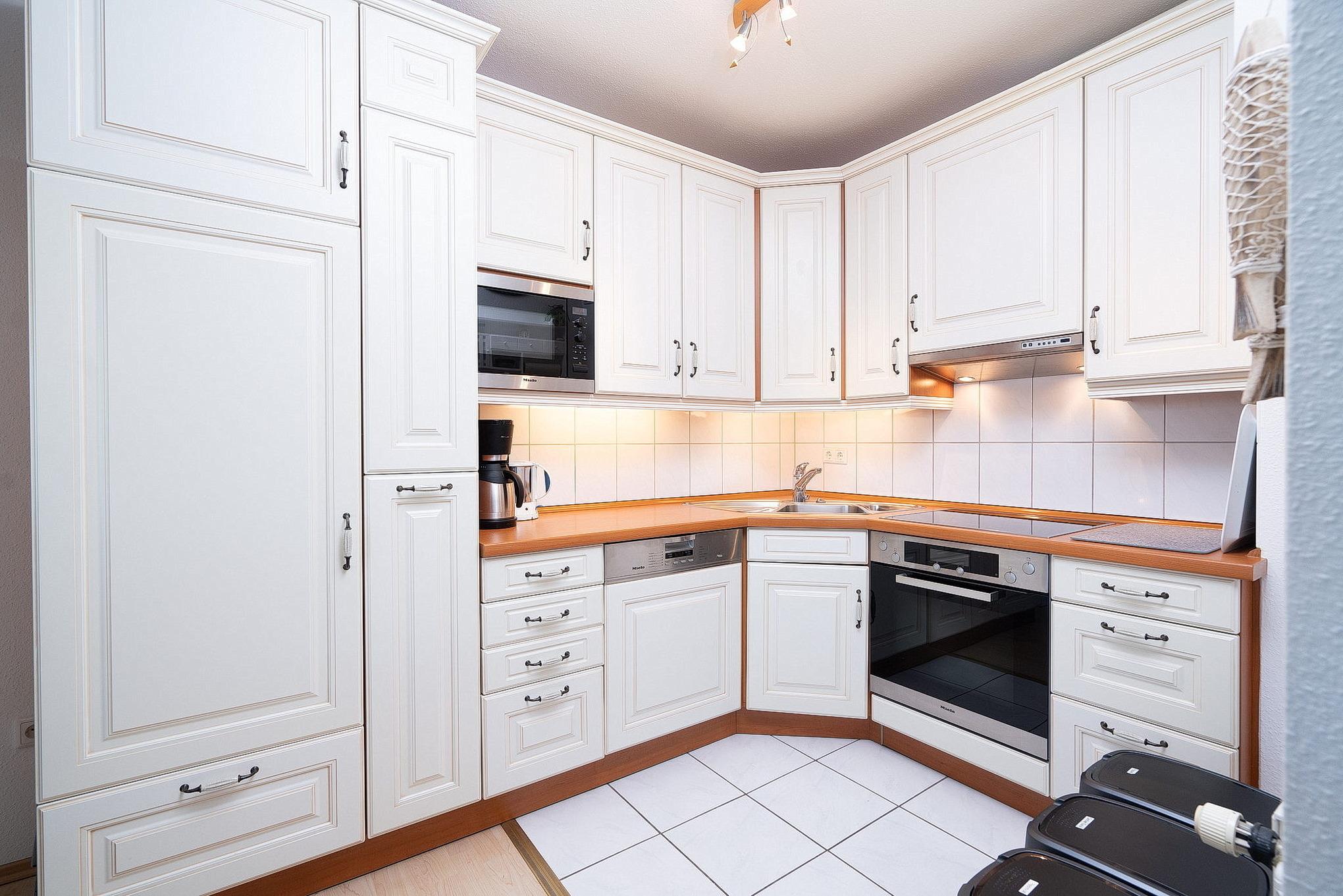 Komplett ausgestattete offene Küche mit 4-Platten-Cerankochfeld, Backofen, Spülmaschine, Kühlschrank und einem kleinen Gefrierfach. Eine Kaffeemaschine, ein Wasserkocher, eine Mikrowelle und ein Toaster stehen ebenfalls zur Verfügung.