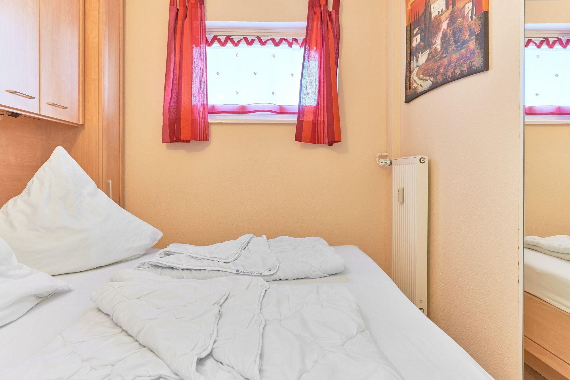 Separates Schlafzimmer mit Fenster. Das Schlafzimmer ist mit einem Doppelbett (2x 80 x 200cm) ausgestattet. Das Fenster lässt sich durch einen Vorhang etwas verdunkeln. Das Schlafzimmer ist mit Teppichboden ausgelegt. Im Flur befindet sich ein kleiner Schrank in dem Kleidungsstücke aufgehängt werden können.